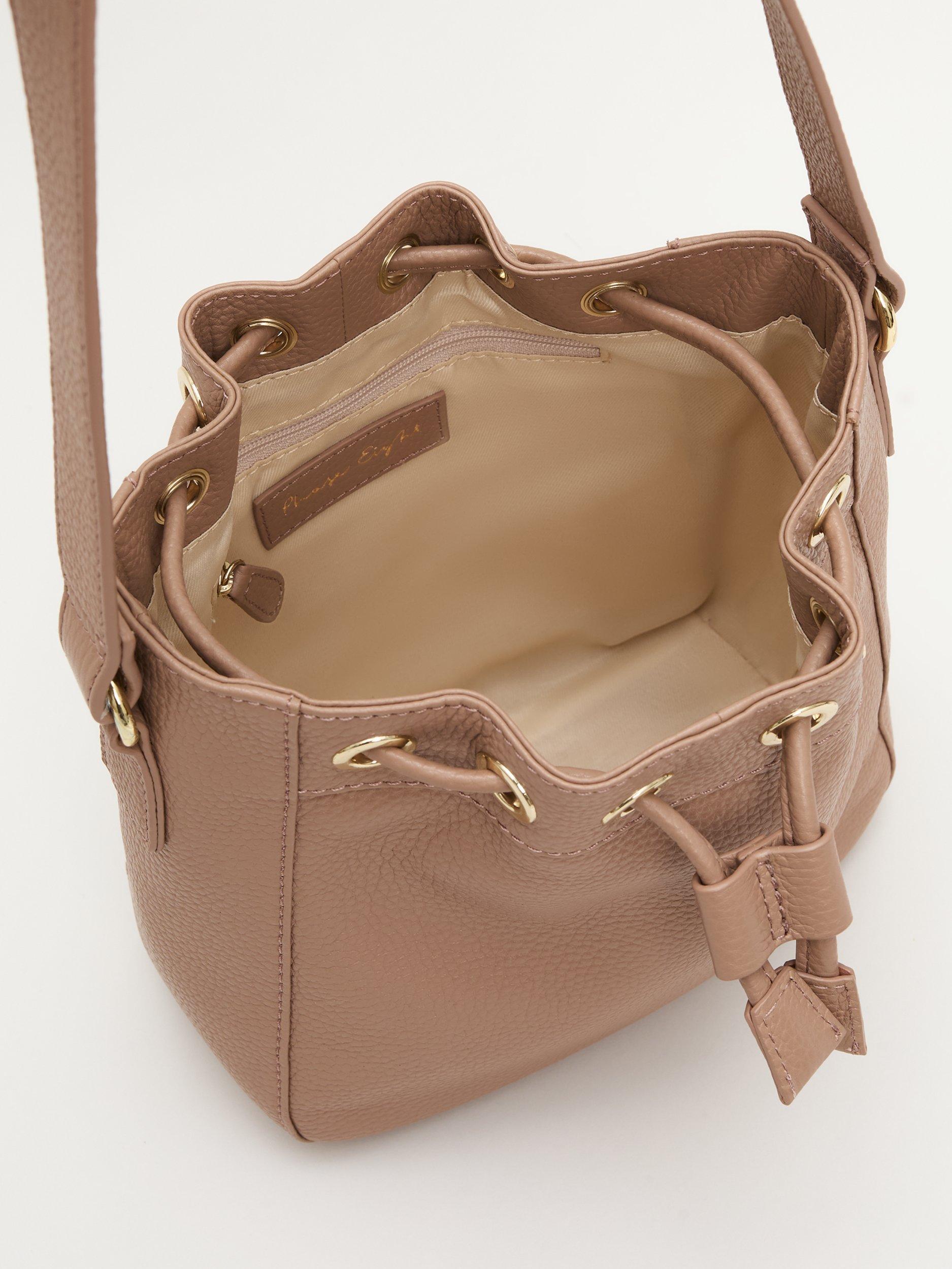 Carry your essentials in style with the leather bucket bag. Designed in a soft shade that will pair effortlessly with all your favourite styles, this bag is finished with a contemporary drawstring detail and crossbody strap, perfect for everyday wear.