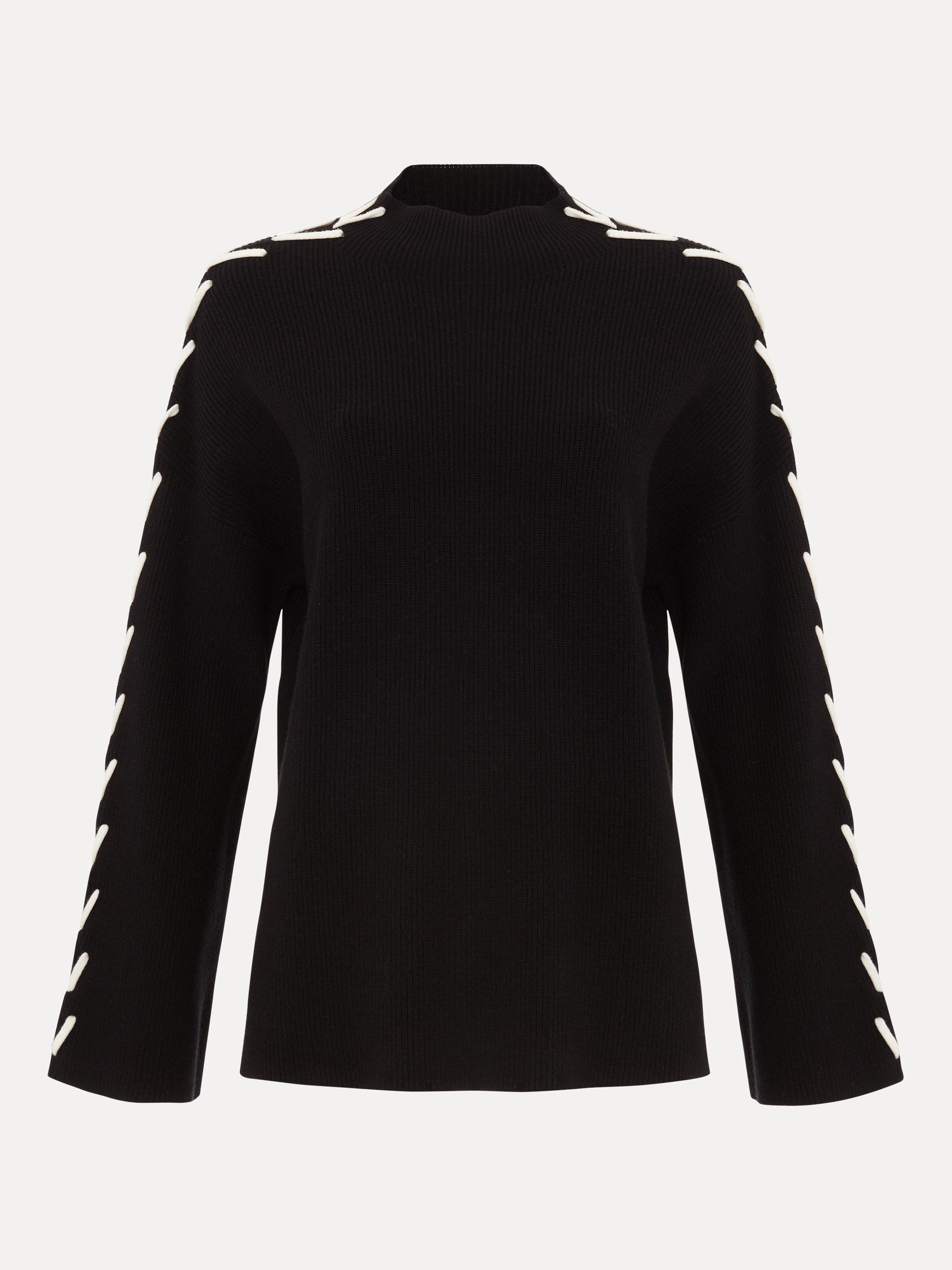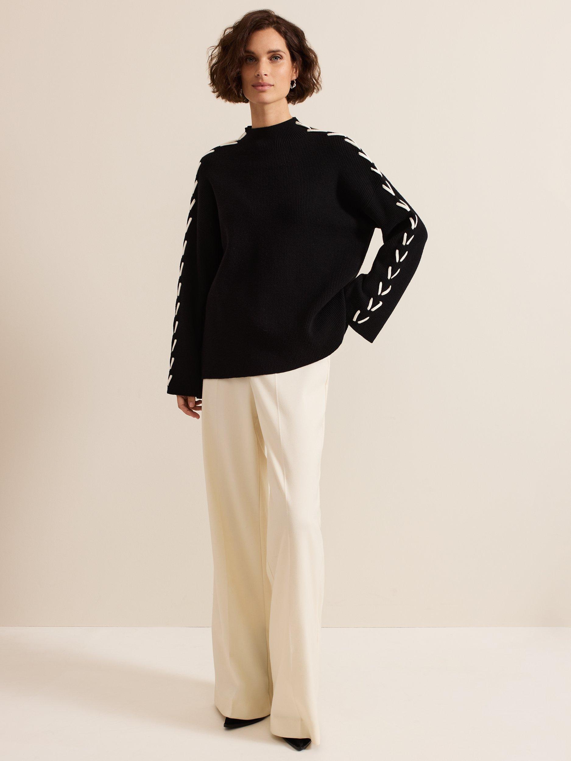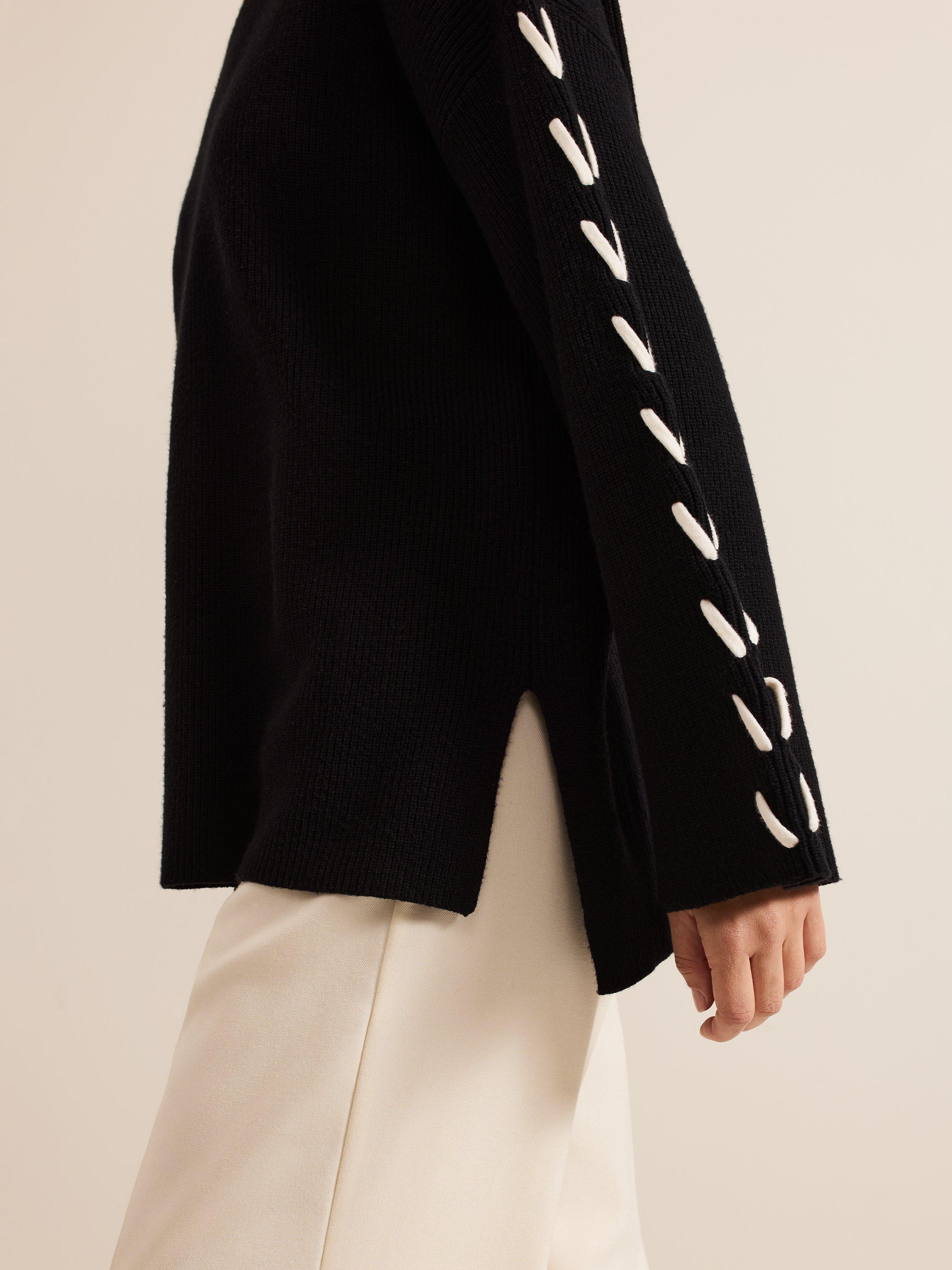 Achieve effortless style with the Leia jumper. Soft and chunky, this jumper features eye-catching contrast ivory stitching along the arms. The stepped hem and side splits elevate this contemporary knit, perfect to dress up or down for any occasion.