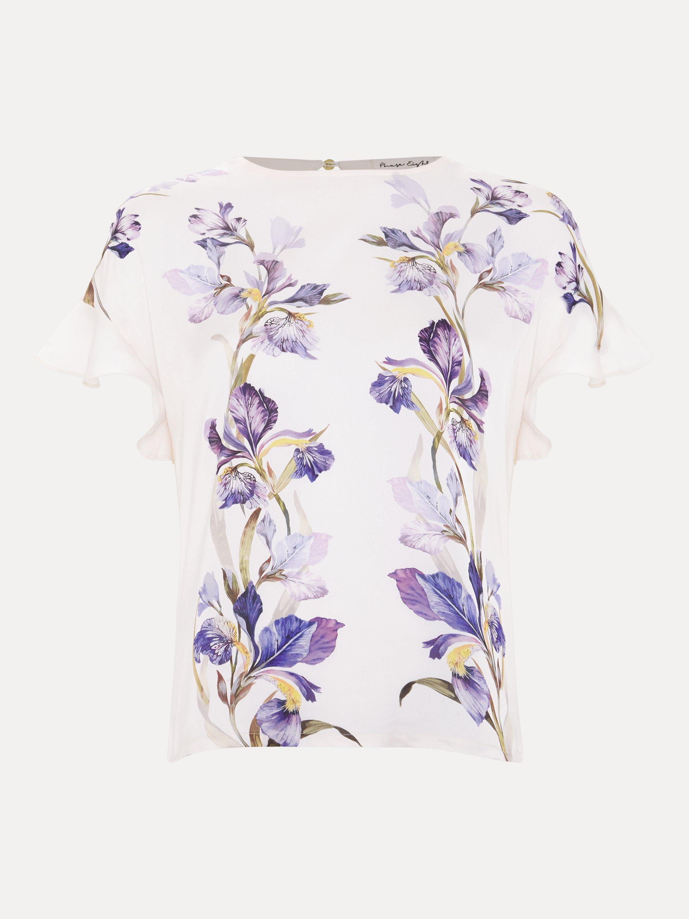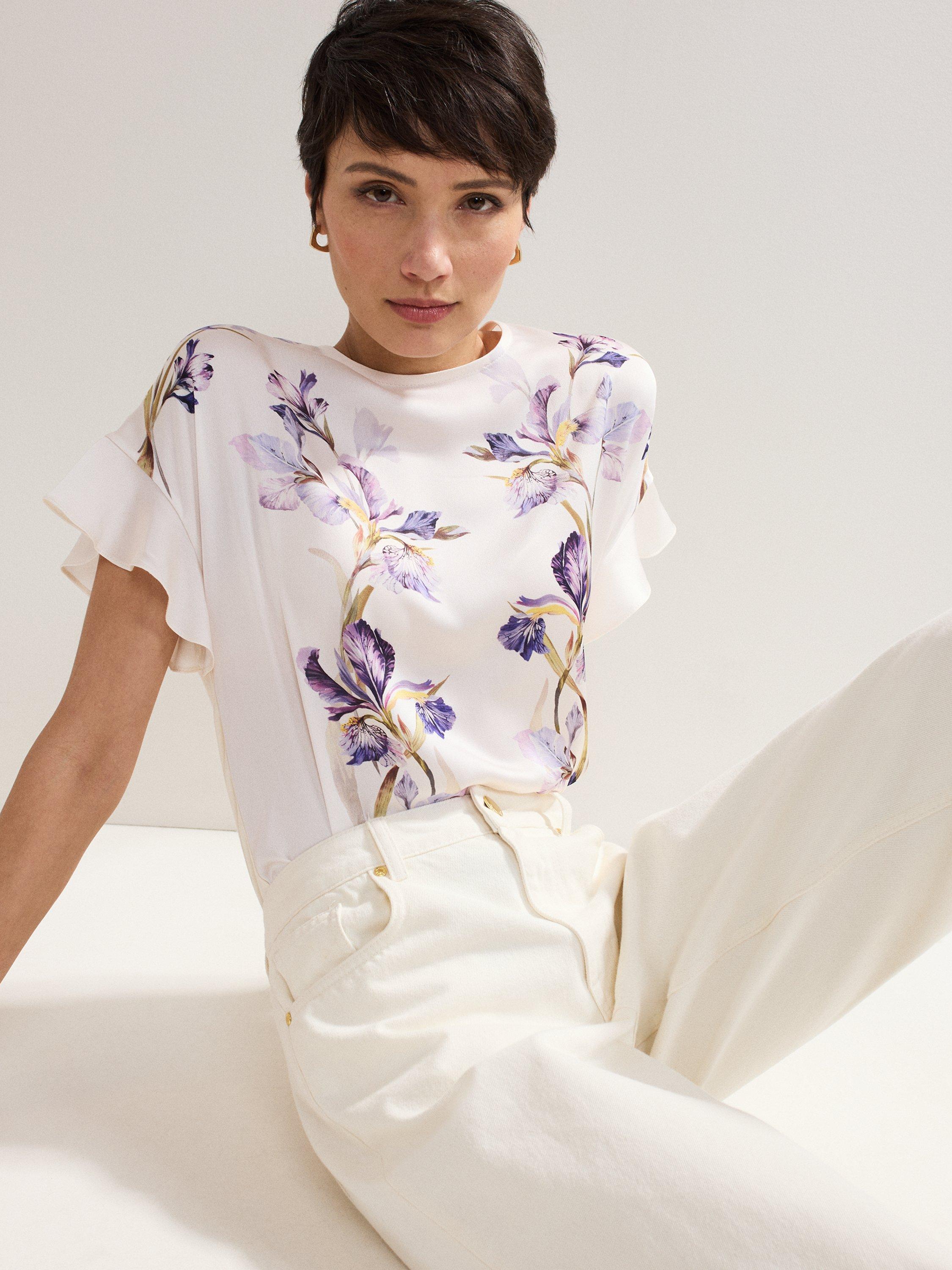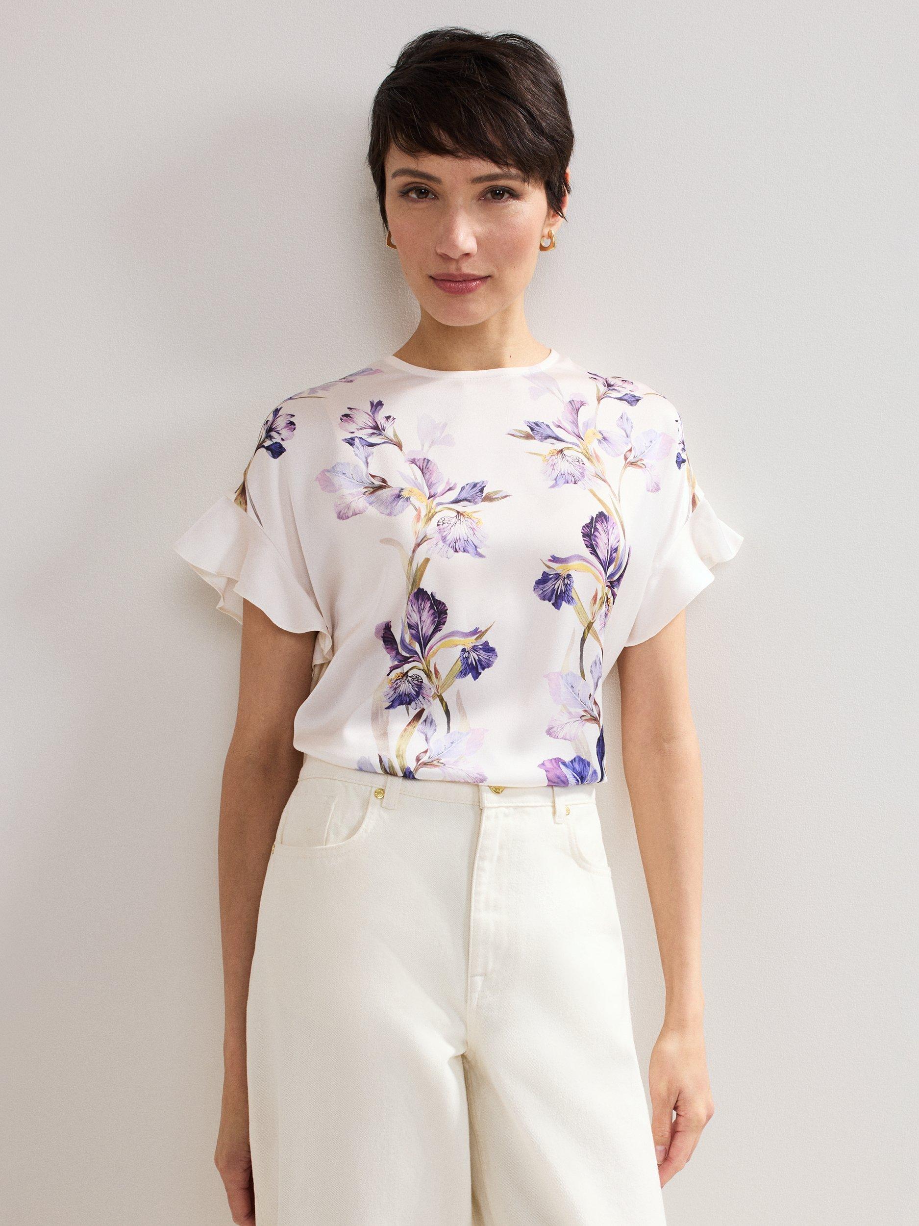 A fresh spring update on the classic T-shirt. Elevated with a stunning floral print, this style is finished with soft ruffle detailing at the sleeves for a feminine edge. We style ours with jeans and sandals for an everyday look.