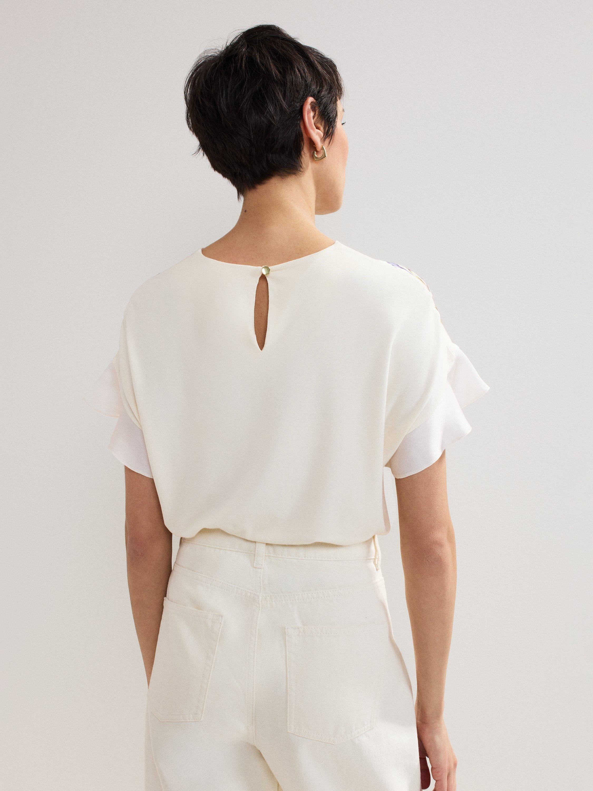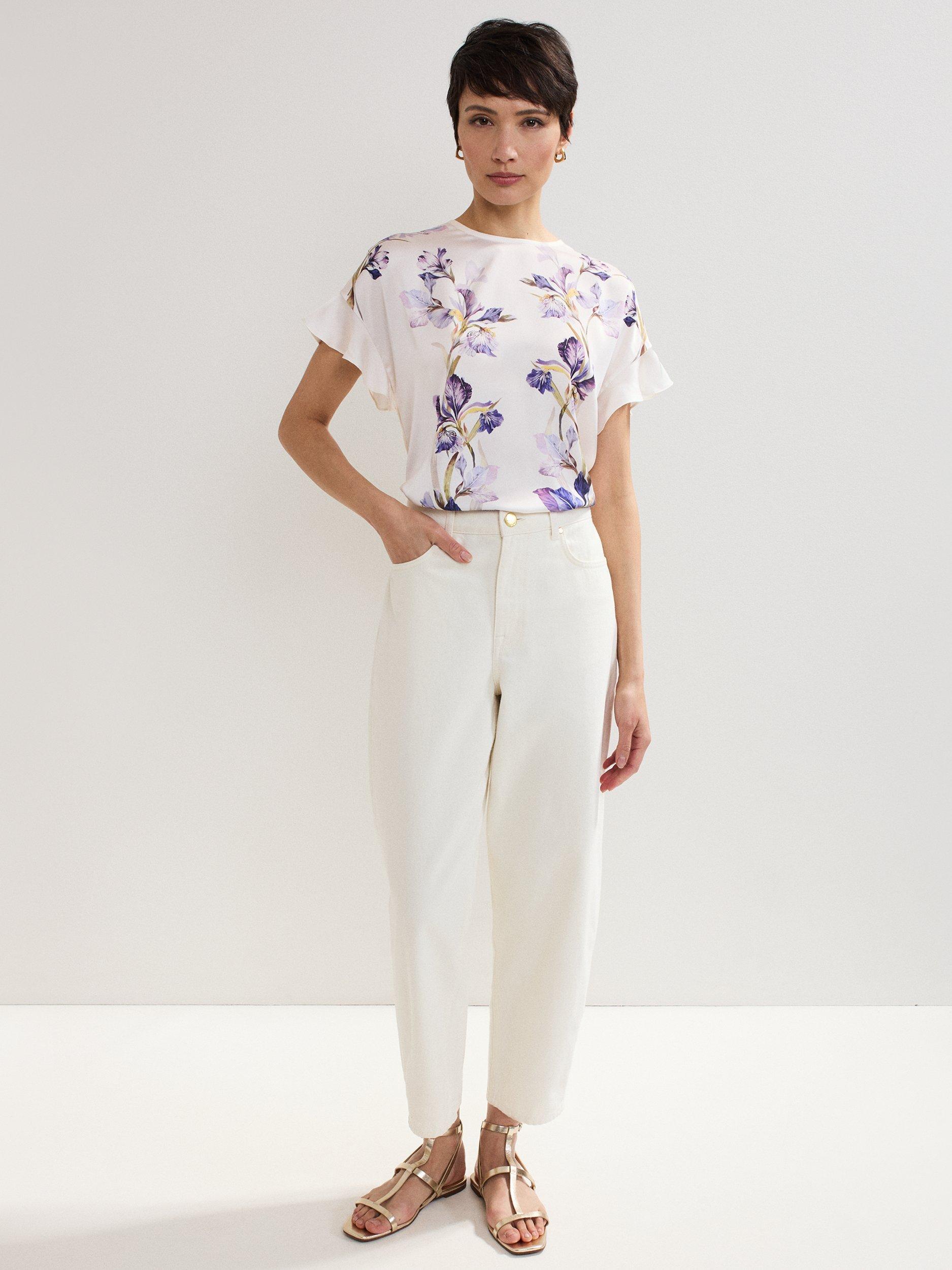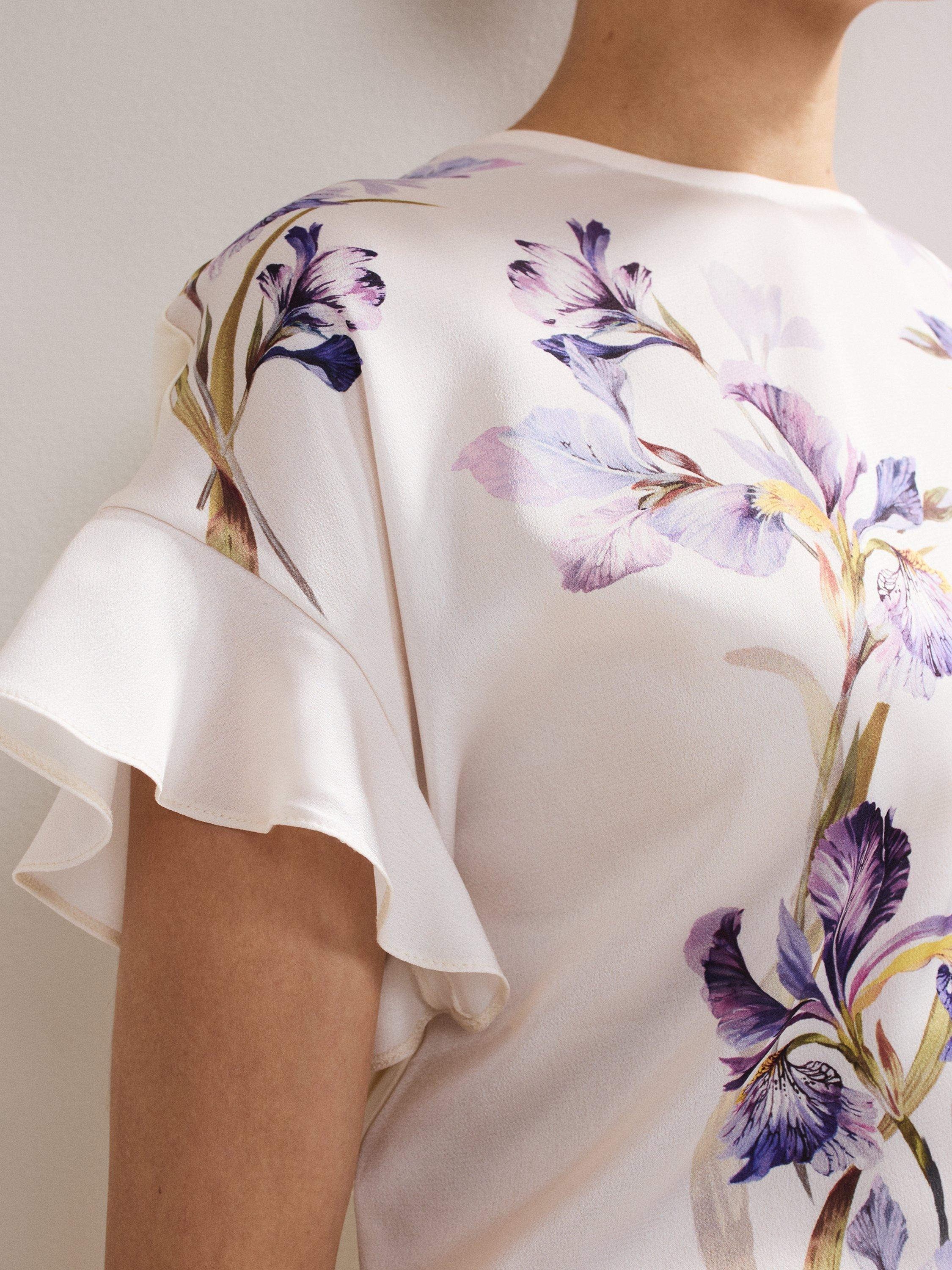 A fresh spring update on the classic T-shirt. Elevated with a stunning floral print, this style is finished with soft ruffle detailing at the sleeves for a feminine edge. We style ours with jeans and sandals for an everyday look.