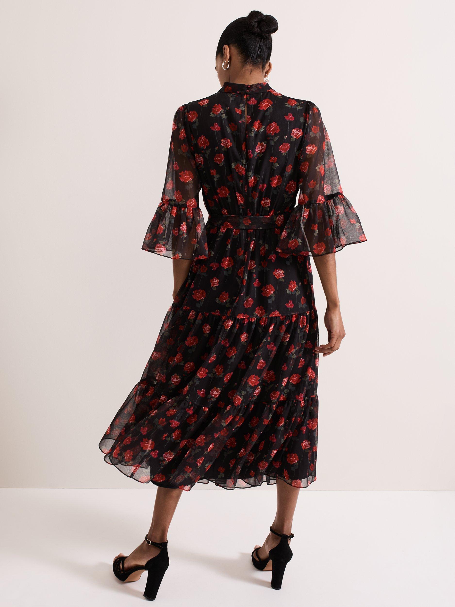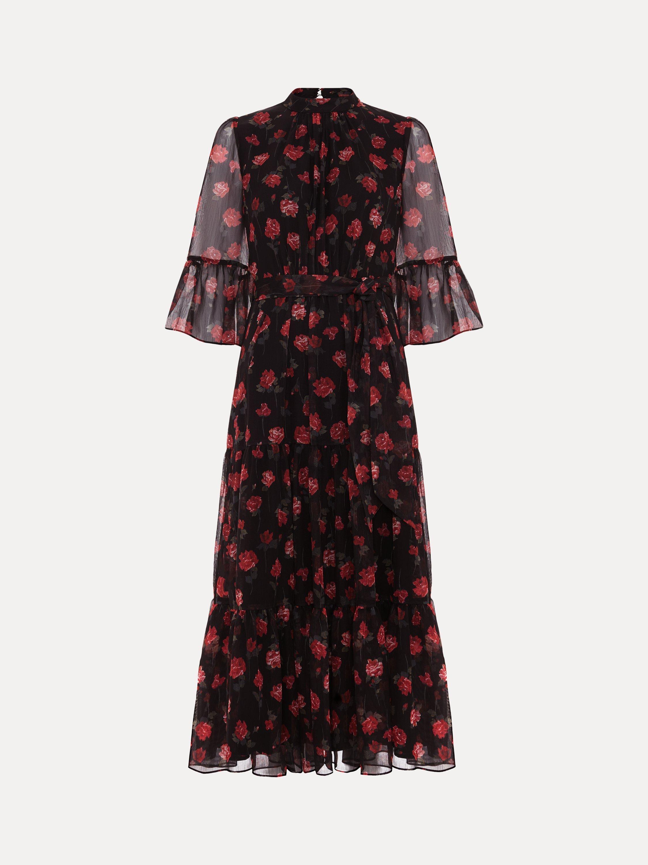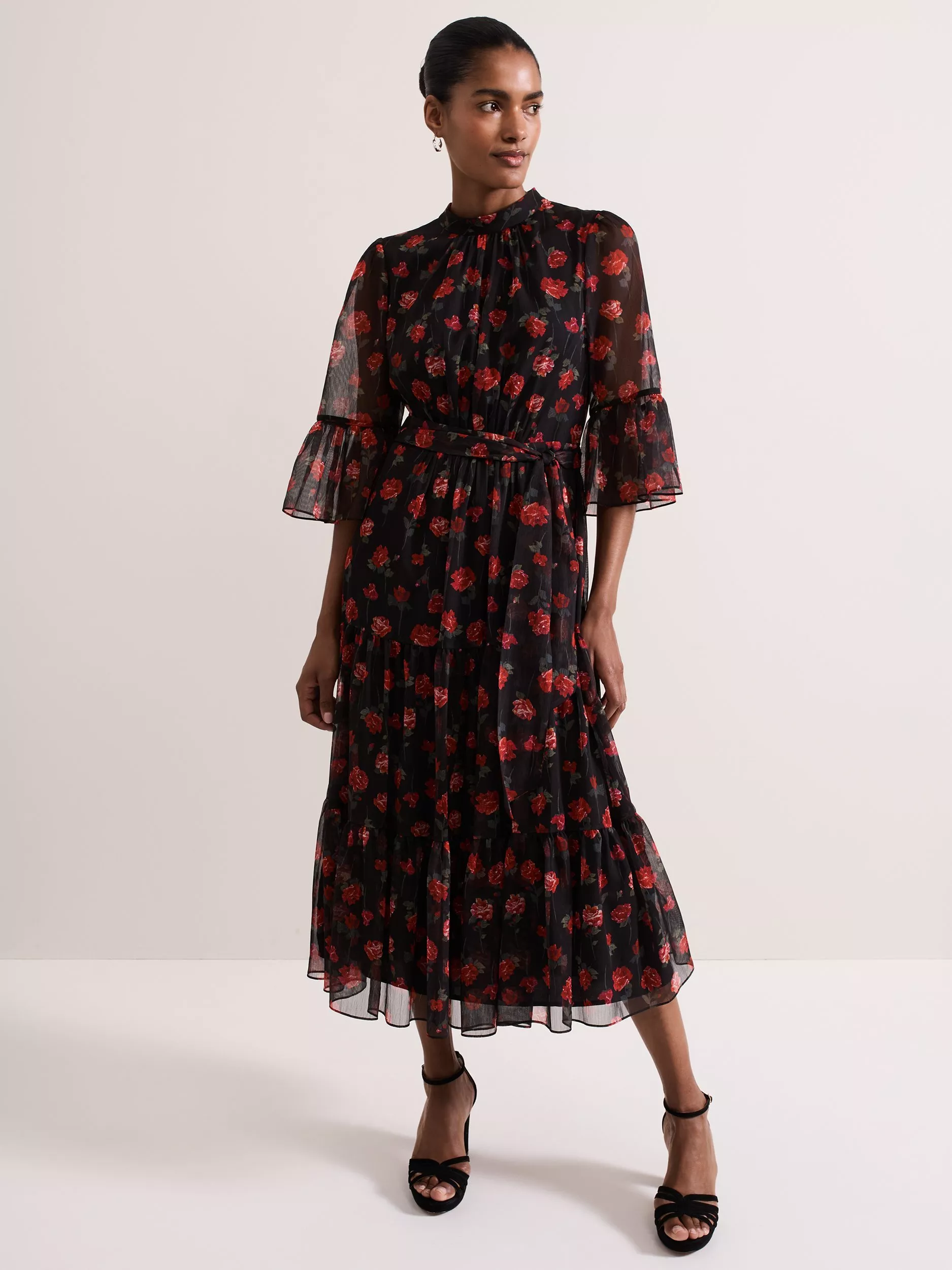 Designed in a stunning floral print, our Lela dress features an elegant high neckline, semi-sheer bell sleeves and eyelet detailing at the back. The loose tie belt highlights the waist before falling to a flowing tiered midi length to create a feminine silhouette that is perfect for your upcoming events.