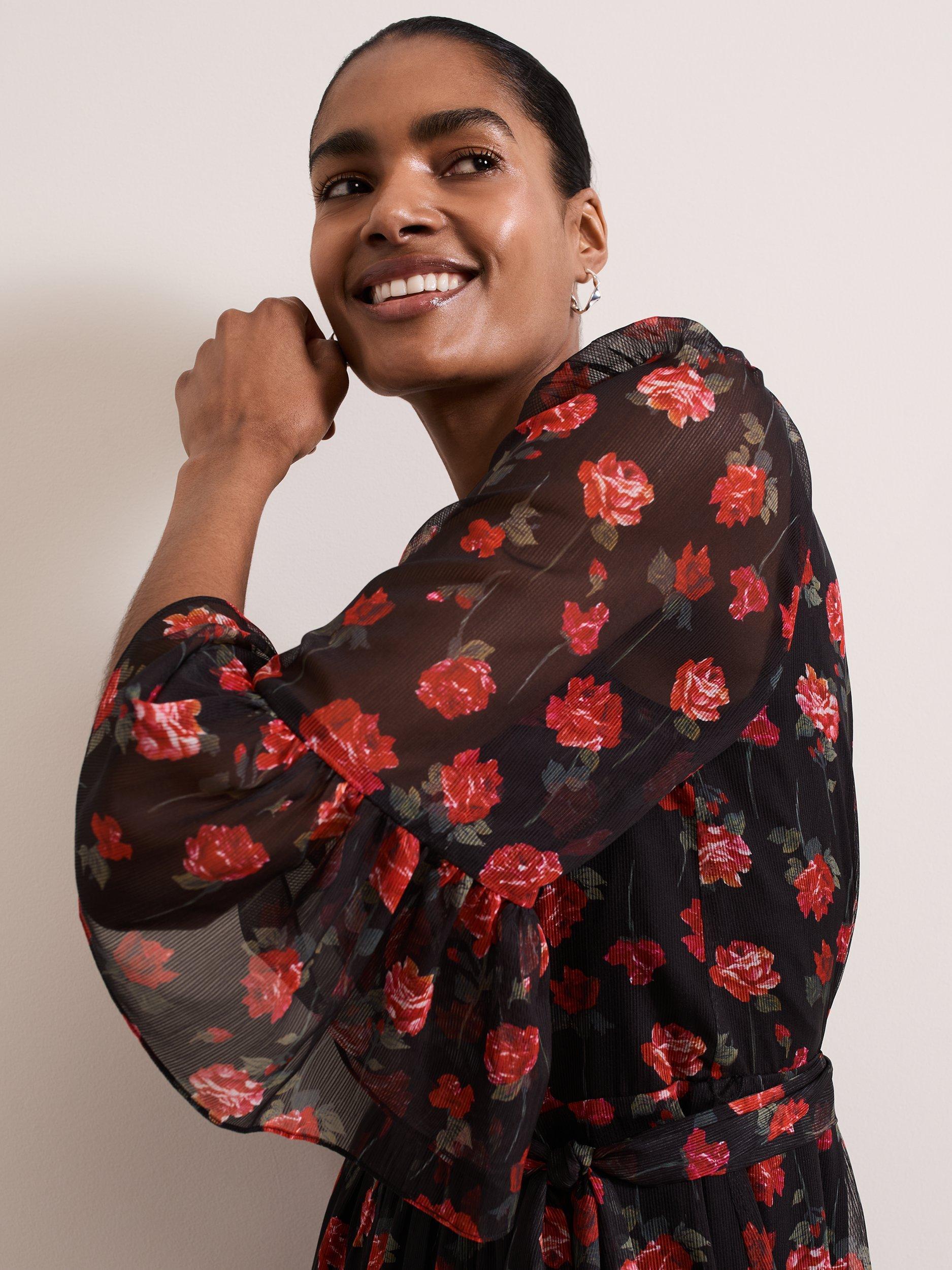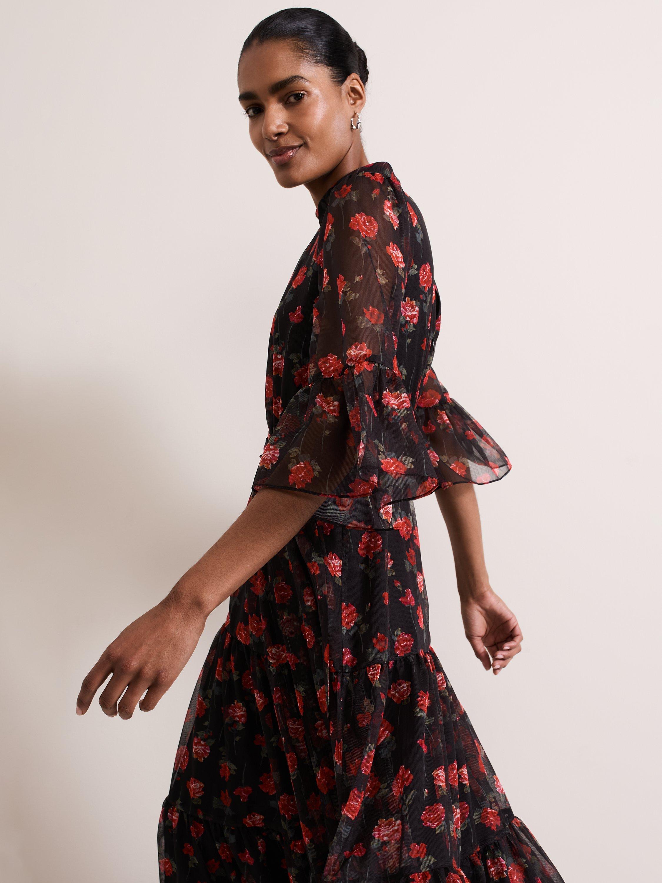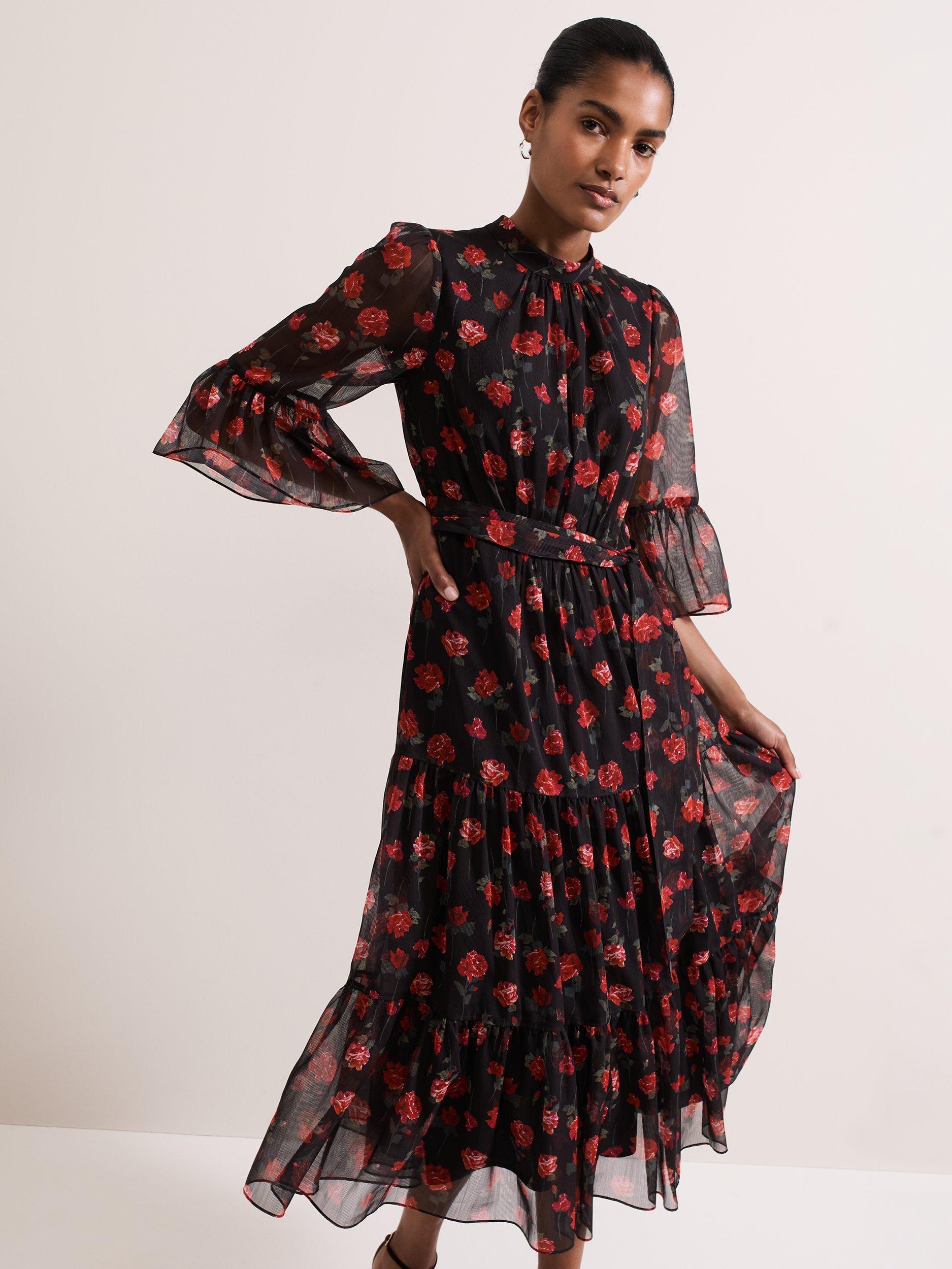 Designed in a stunning floral print, our Lela dress features an elegant high neckline, semi-sheer bell sleeves and eyelet detailing at the back. The loose tie belt highlights the waist before falling to a flowing tiered midi length to create a feminine silhouette that is perfect for your upcoming events.