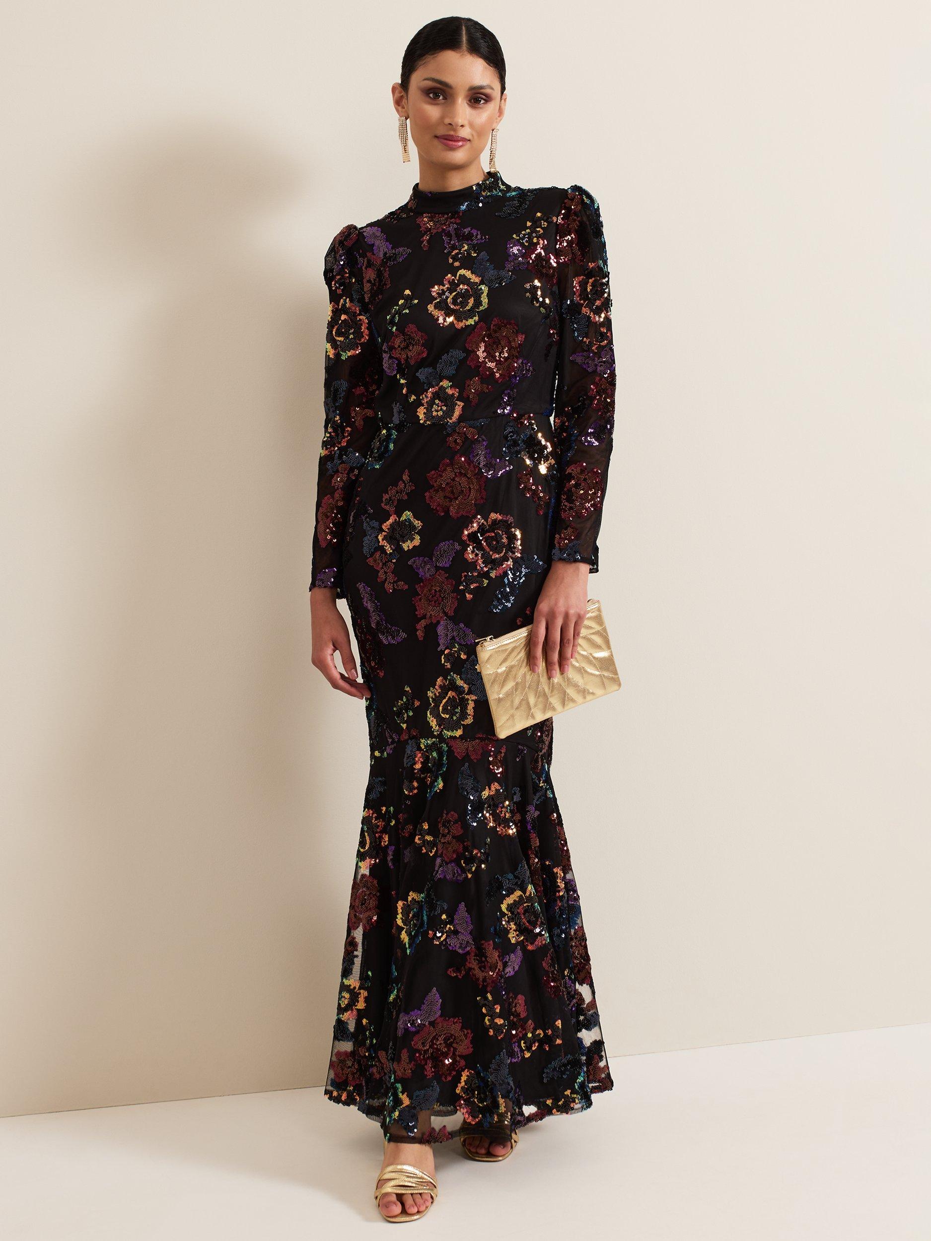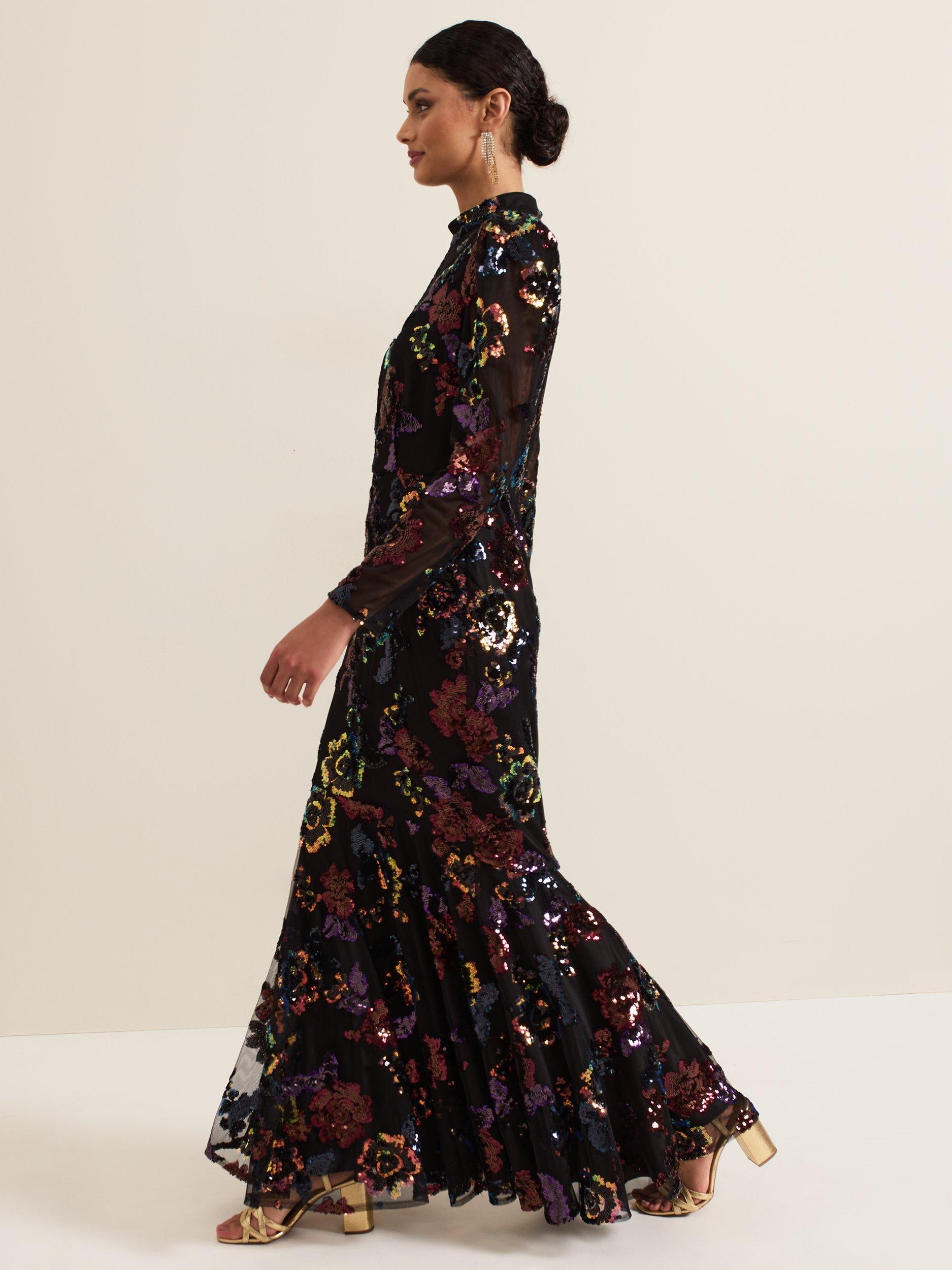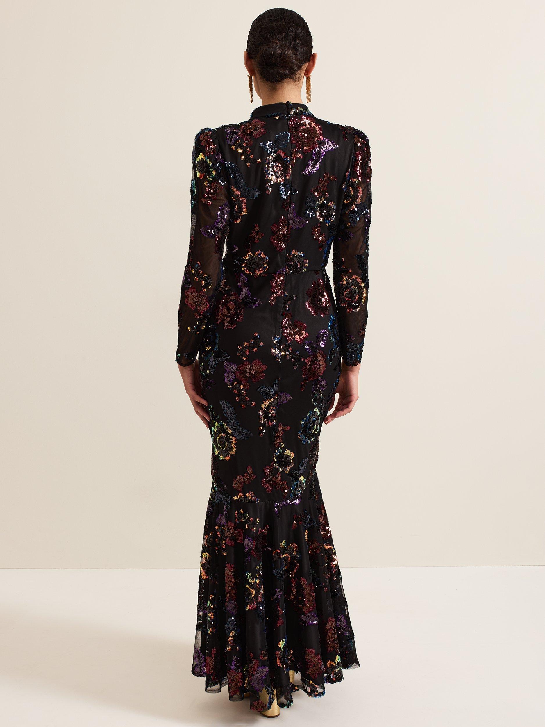 Part of Collection 8, Phase Eight's range of premium evening styles. Designed with a dropped hem to create an elegant fishtail silhouette, the Lelo dress features a multicoloured sequin rose print on a versatile black base.