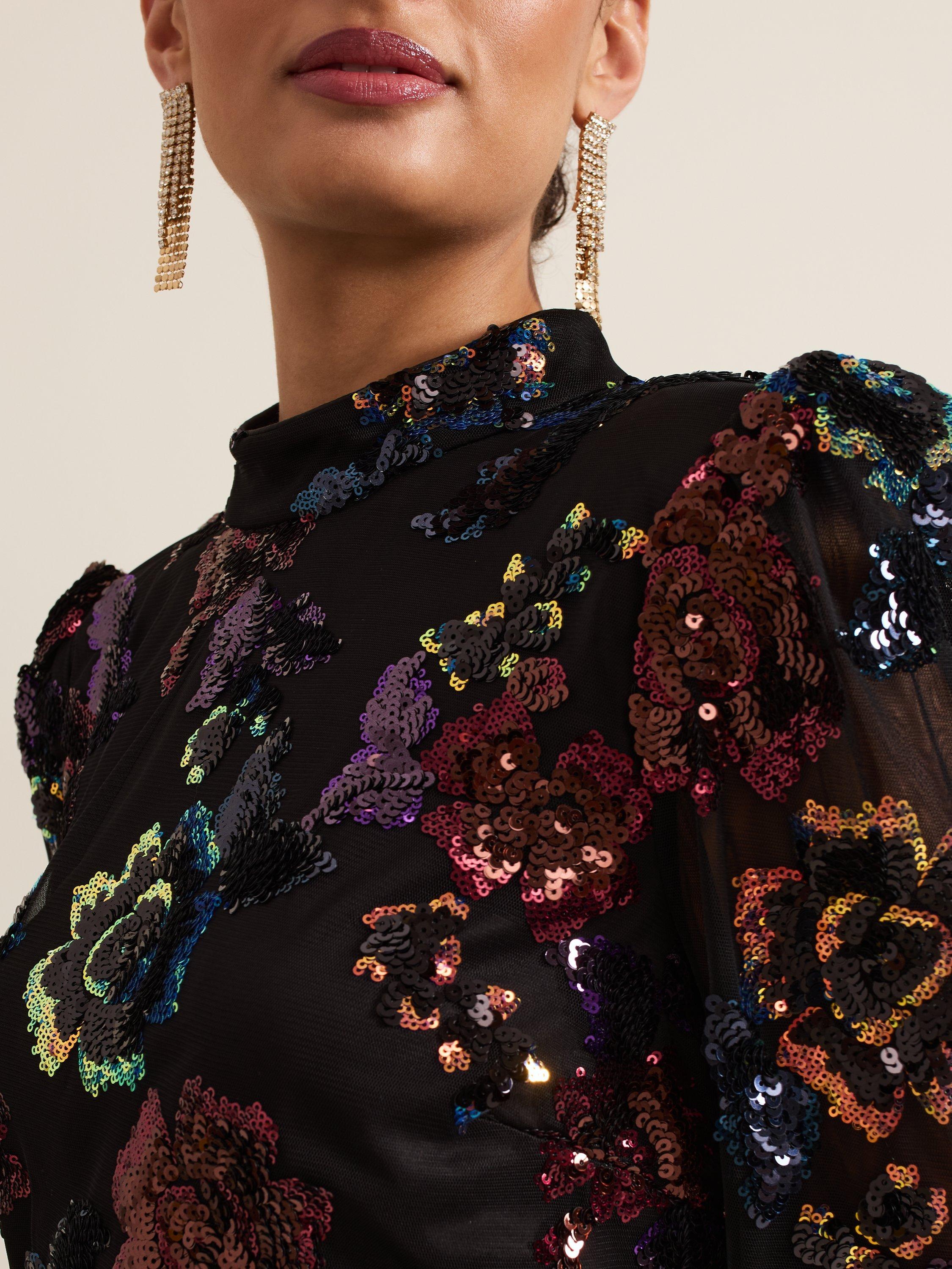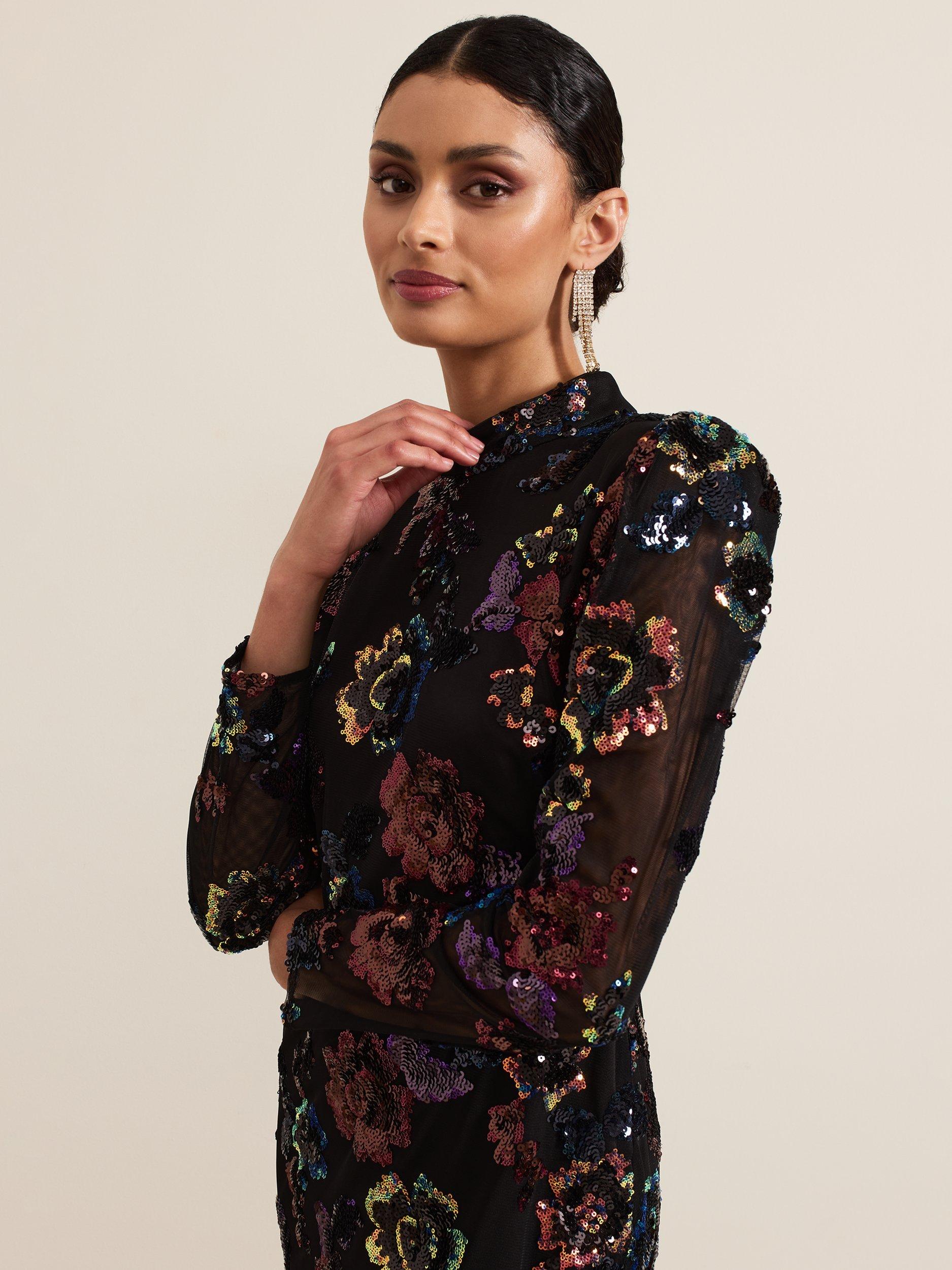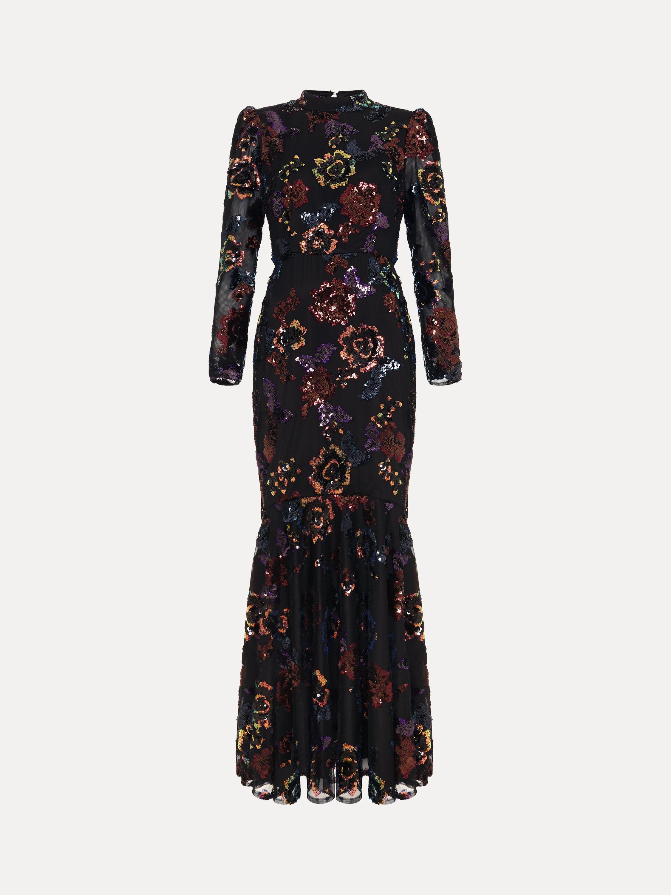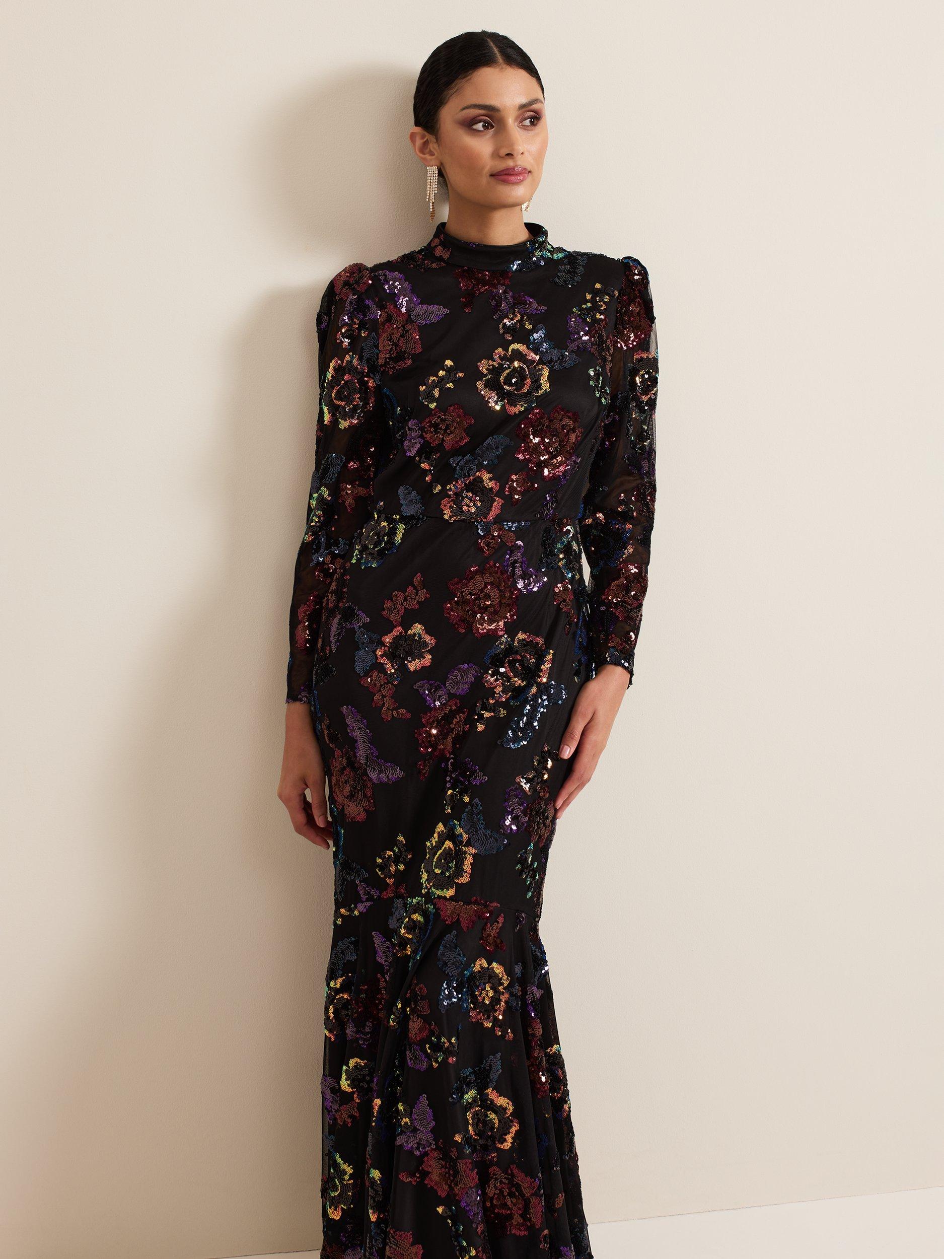 Part of Collection 8, Phase Eight's range of premium evening styles. Designed with a dropped hem to create an elegant fishtail silhouette, the Lelo dress features a multicoloured sequin rose print on a versatile black base.