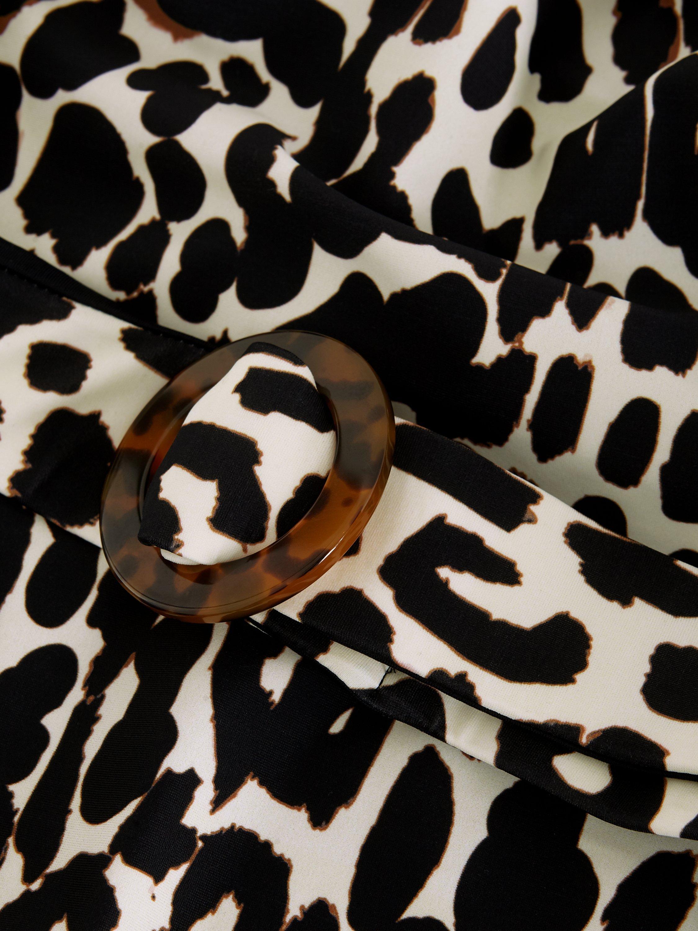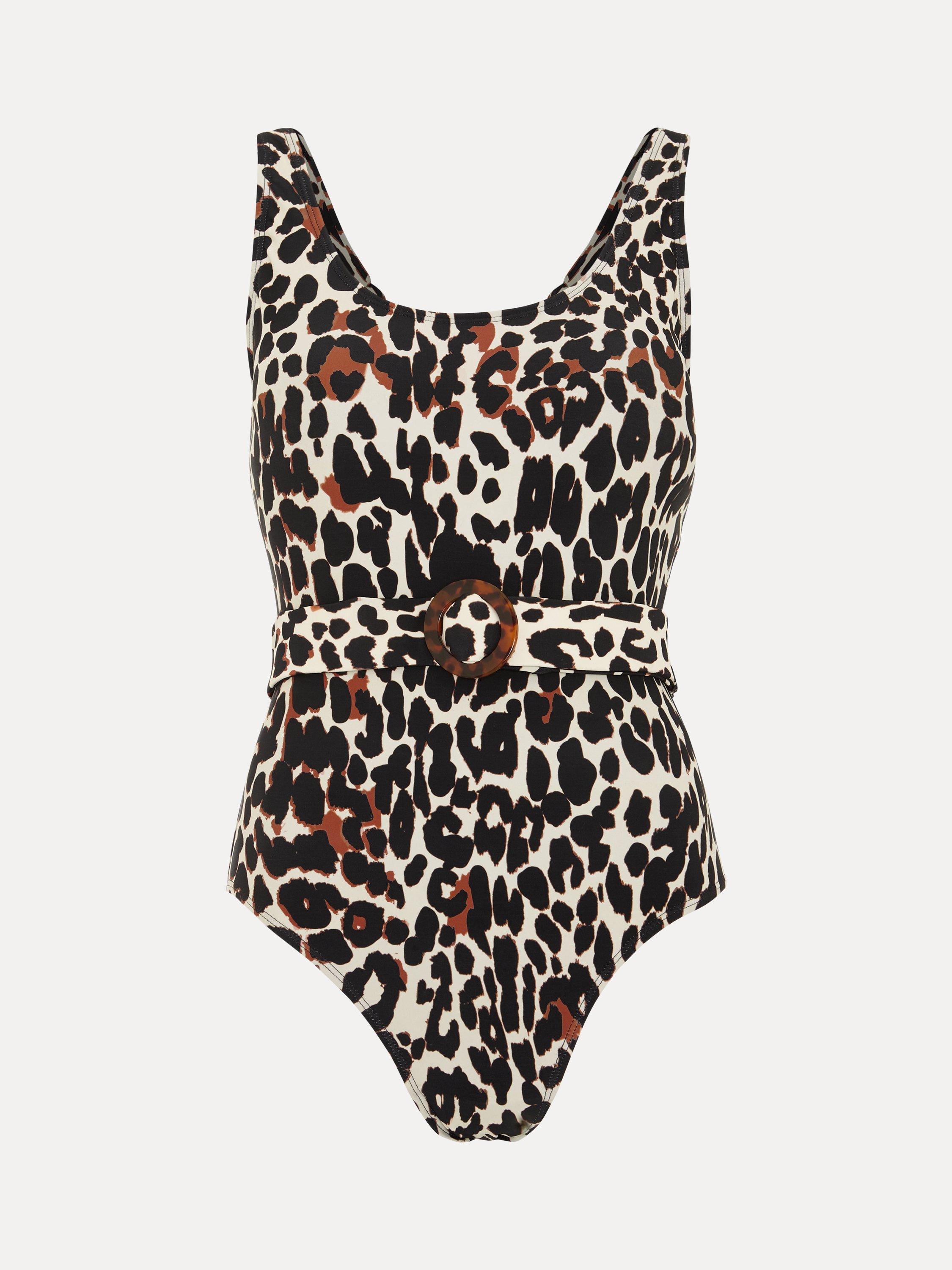 Always on trend, elevate your swimwear wardrobe with this leopard print swimsuit. Designed with a scoop neckline, it's finished with a matching belt and tortoiseshell buckle for contemporary detailing, perfect for your next holiday.