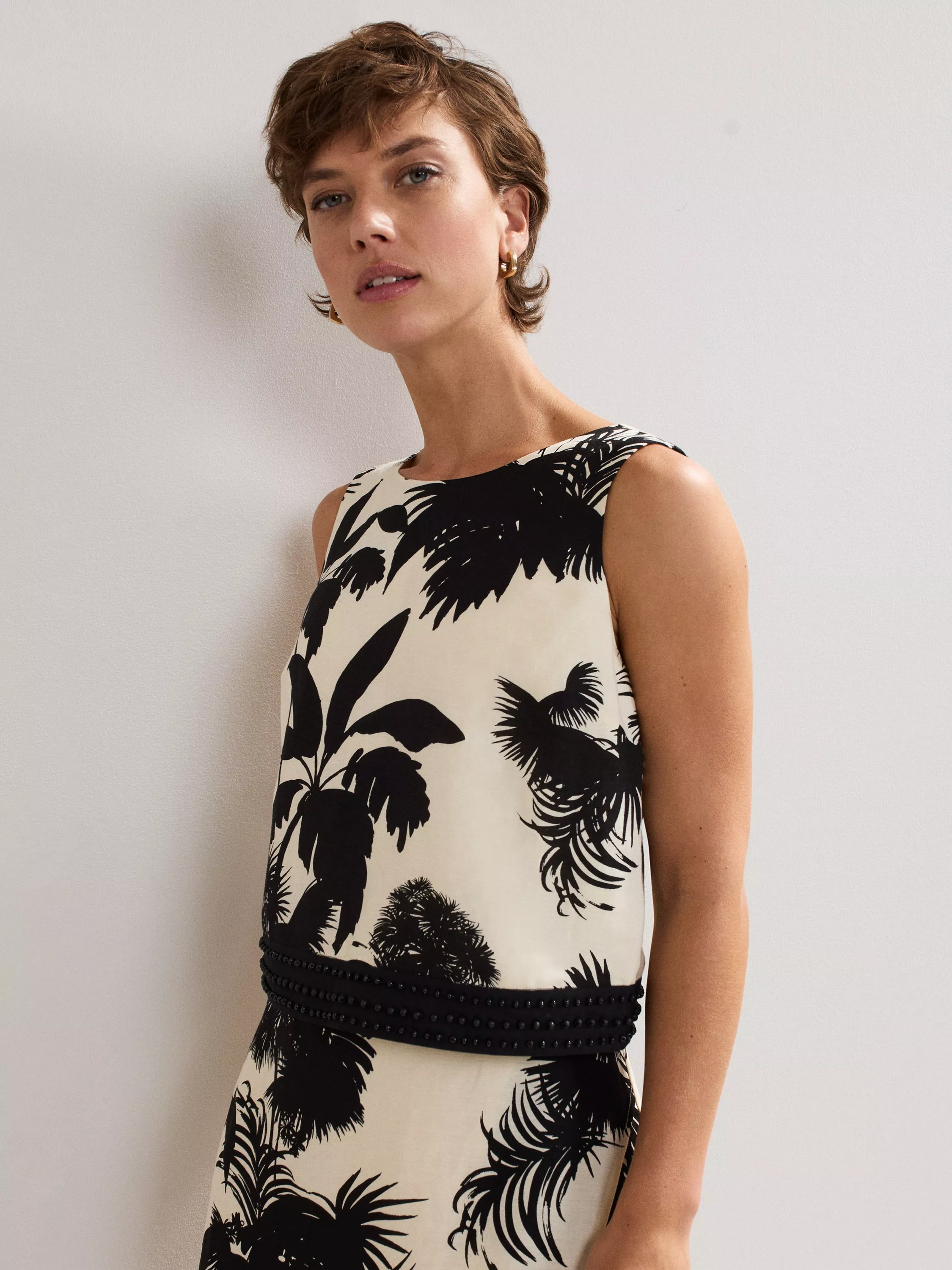 The Vittoria top from Phase Eight is crafted from a lightweight linen blend and cut with a classic round neck, while the tropical leaf print and sleeveless style make it an effortless choice for spring and summer. Finished with beaded detailing on the hem.