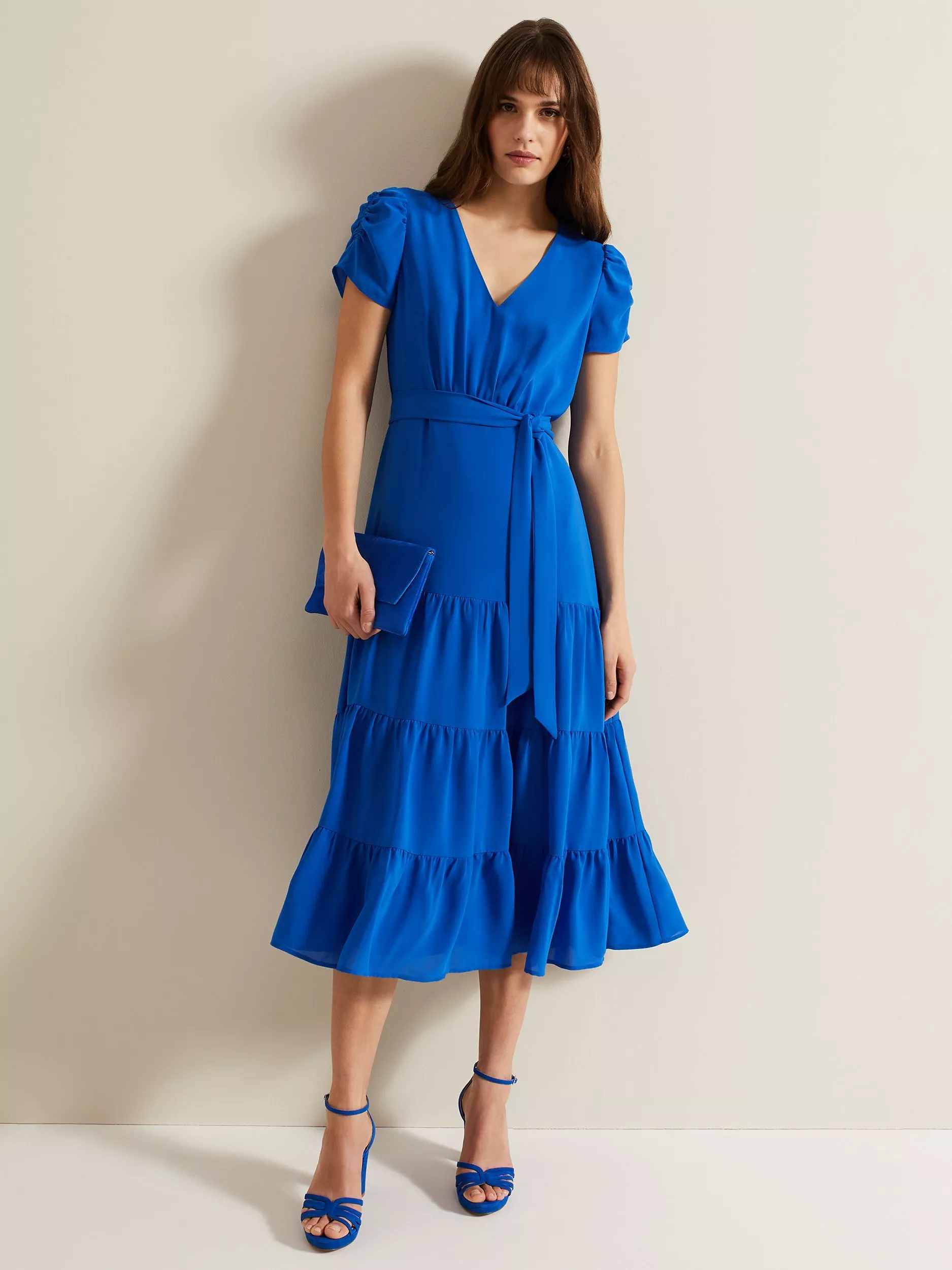 Exaggerated by tiers falling across its profile, this mid-length dress from Phase Eight is made from a lightweight fabric. Effortlessly flattering thanks to a fuss-free v-neckline and short sleeves, this style needs no prints or accents to hold the spotlight.