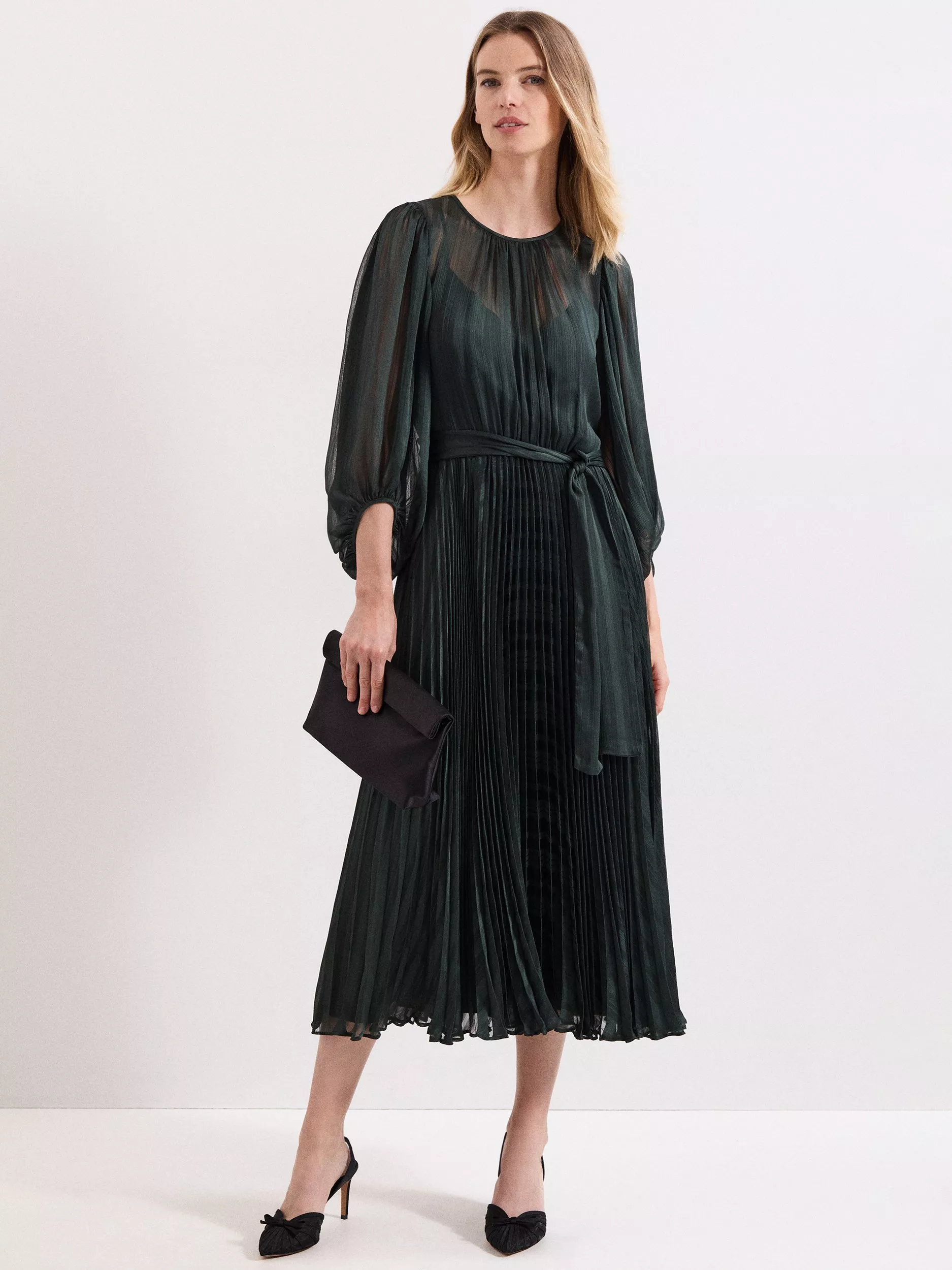 Feel comfortable and confident with Phase Eight’s fit and flare midi dress, featuring pleats, puff three-quarter sleeves, a concealed zip, and a round neck. Ideal for wedding guests who appreciate smart details and effortless ease.