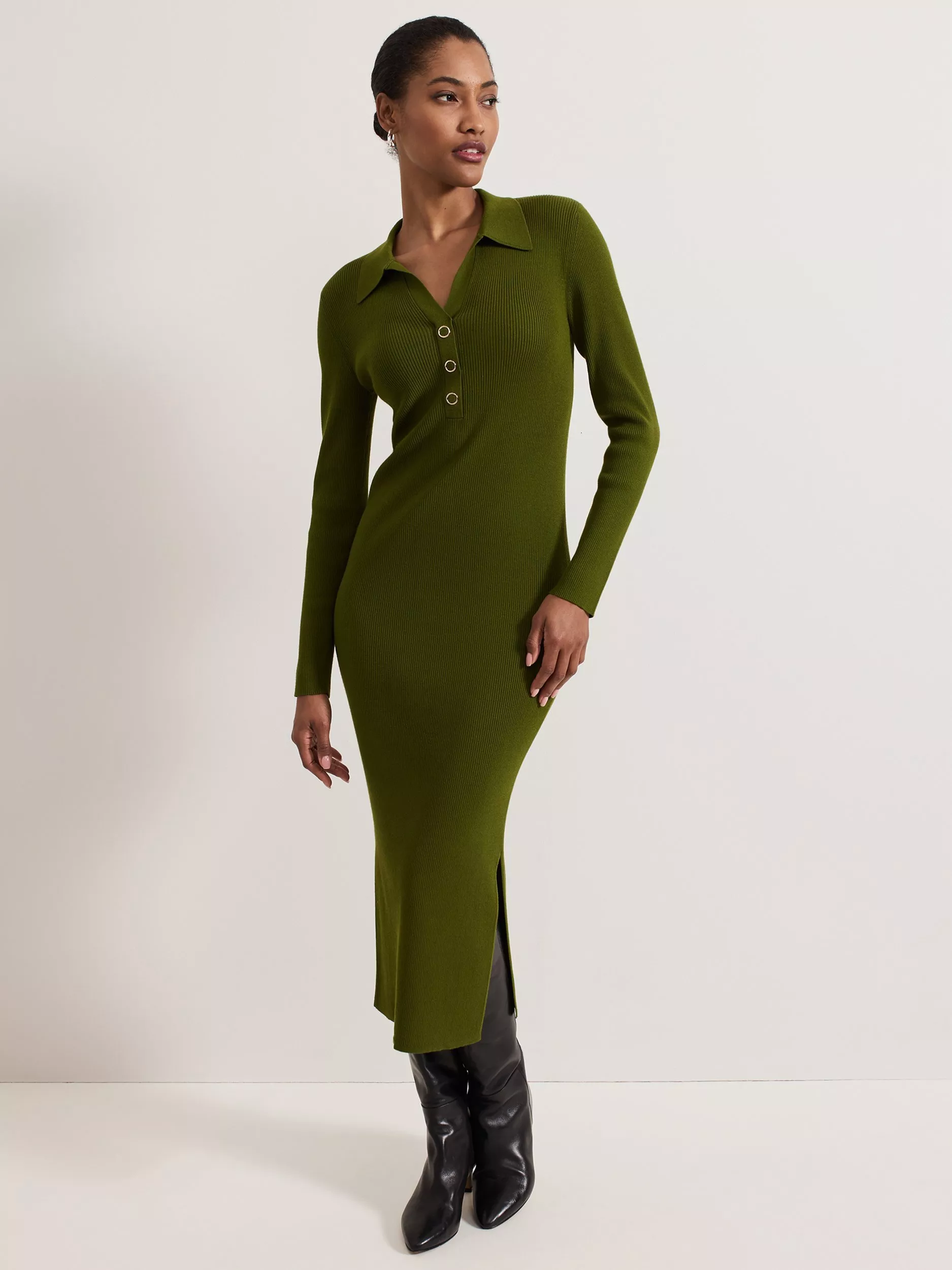 With its figure-hugging proportions and knitted handle, this mid-length dress from Phase Eight is crafted from a stretchy viscose blend. Topped with a collar and long sleeves, it needs no prints or accents to hold the spotlight.
