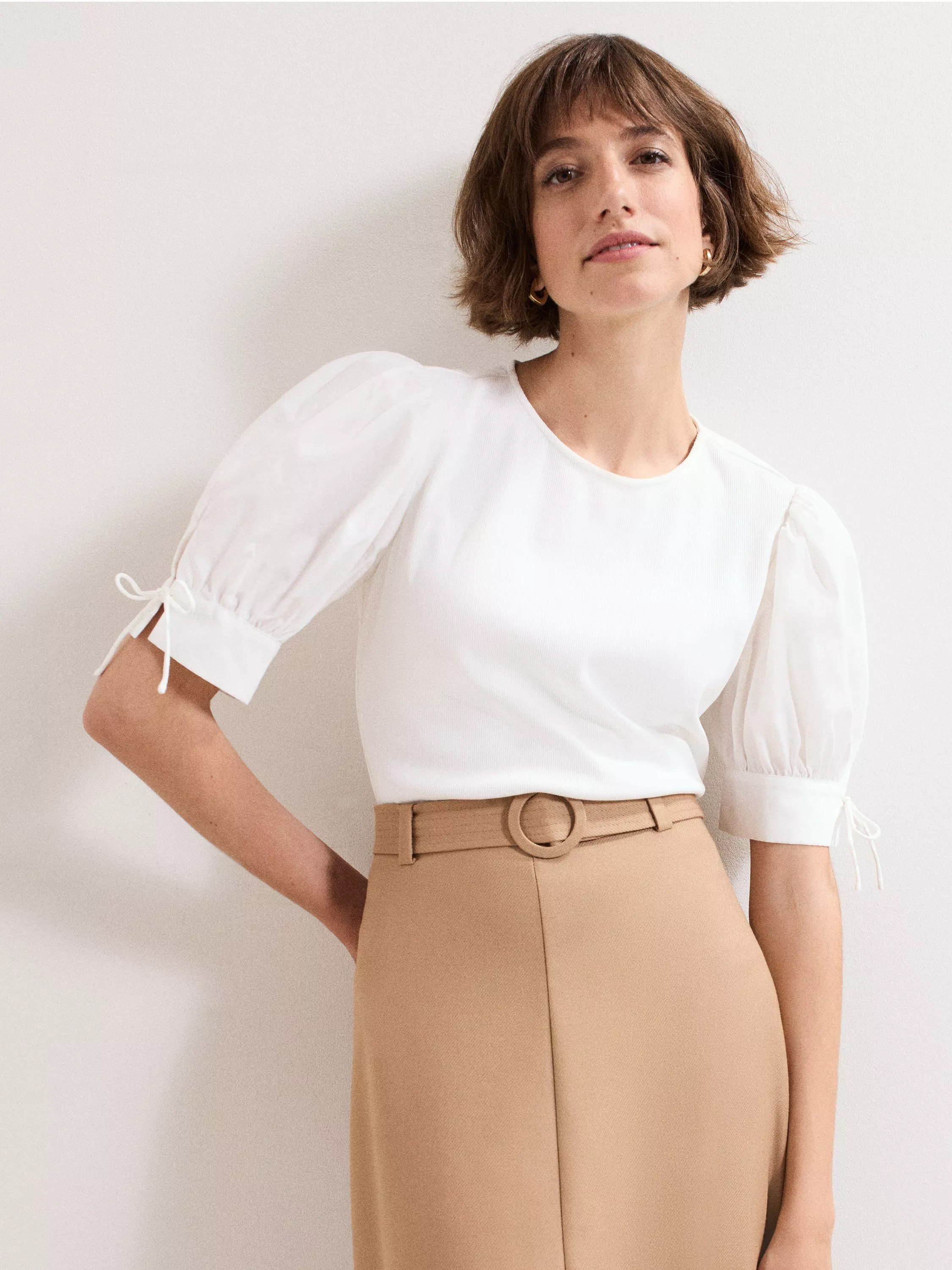 Romantic and feminine, this crisp top in 100% cotton is the perfect elevated staple to add to your wardrobe rotation. With a ribbed bodice for a body-skimming silhouette and puff sleeves with delicate tie detailing for adding shape. Lean into the whimsy with a floaty skirt or pair back with straight leg jeans.