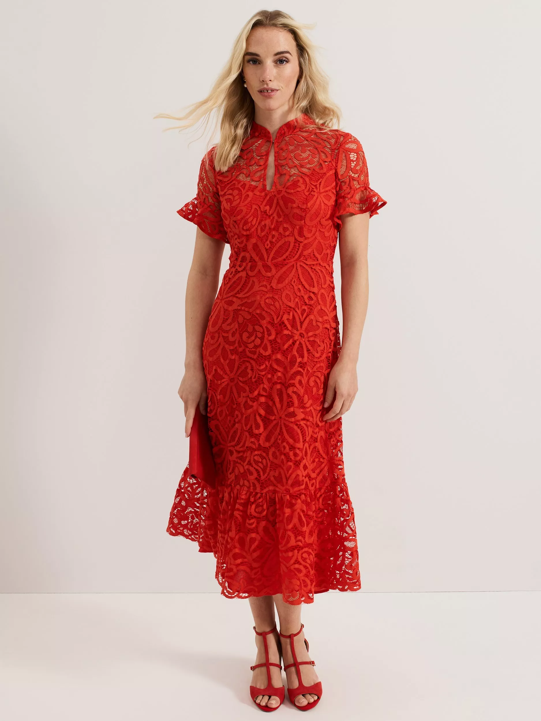 A sophisticated style for all your special occasions. In a vibrant shade, the lace Lula dress features a feminine high neckline and semi-sheer yoke with an eyelet detail for added allure. Finished with frill detailing at the sleeves and hem, our midi dress is a standout style.