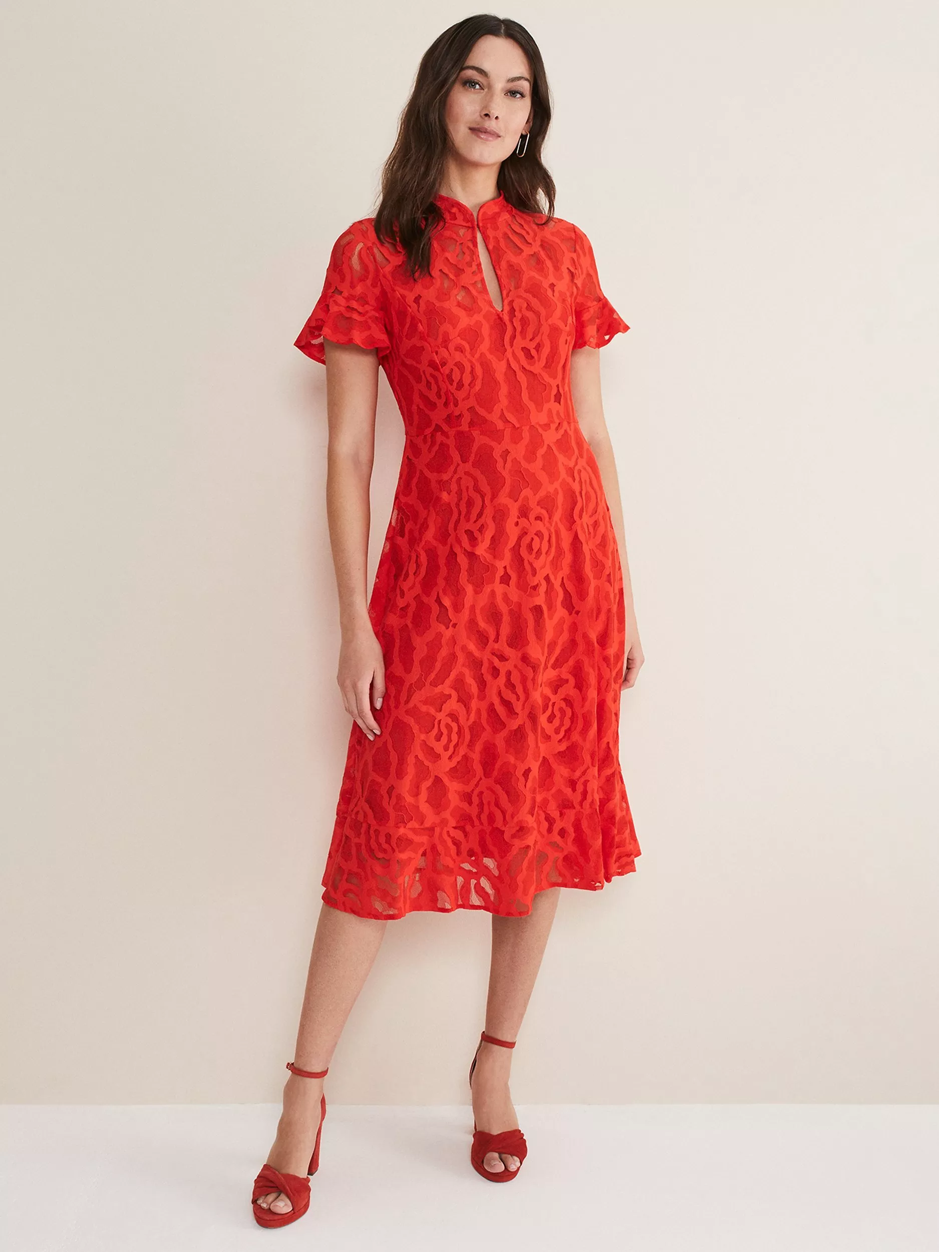 Flaring out at the hem for a feminine silhouette, this knee-length dress by Phase Eight has a dainty lace detail all over.