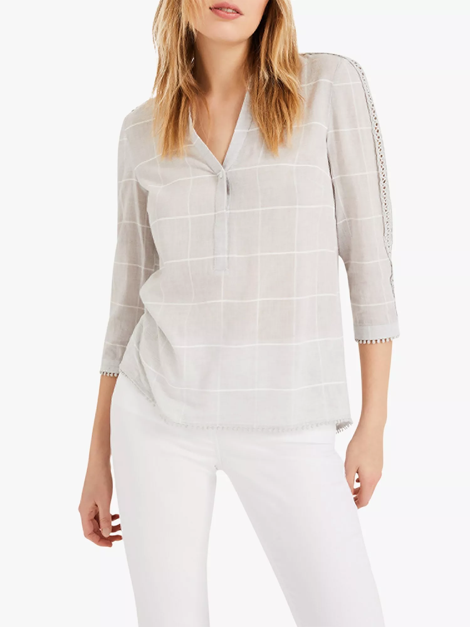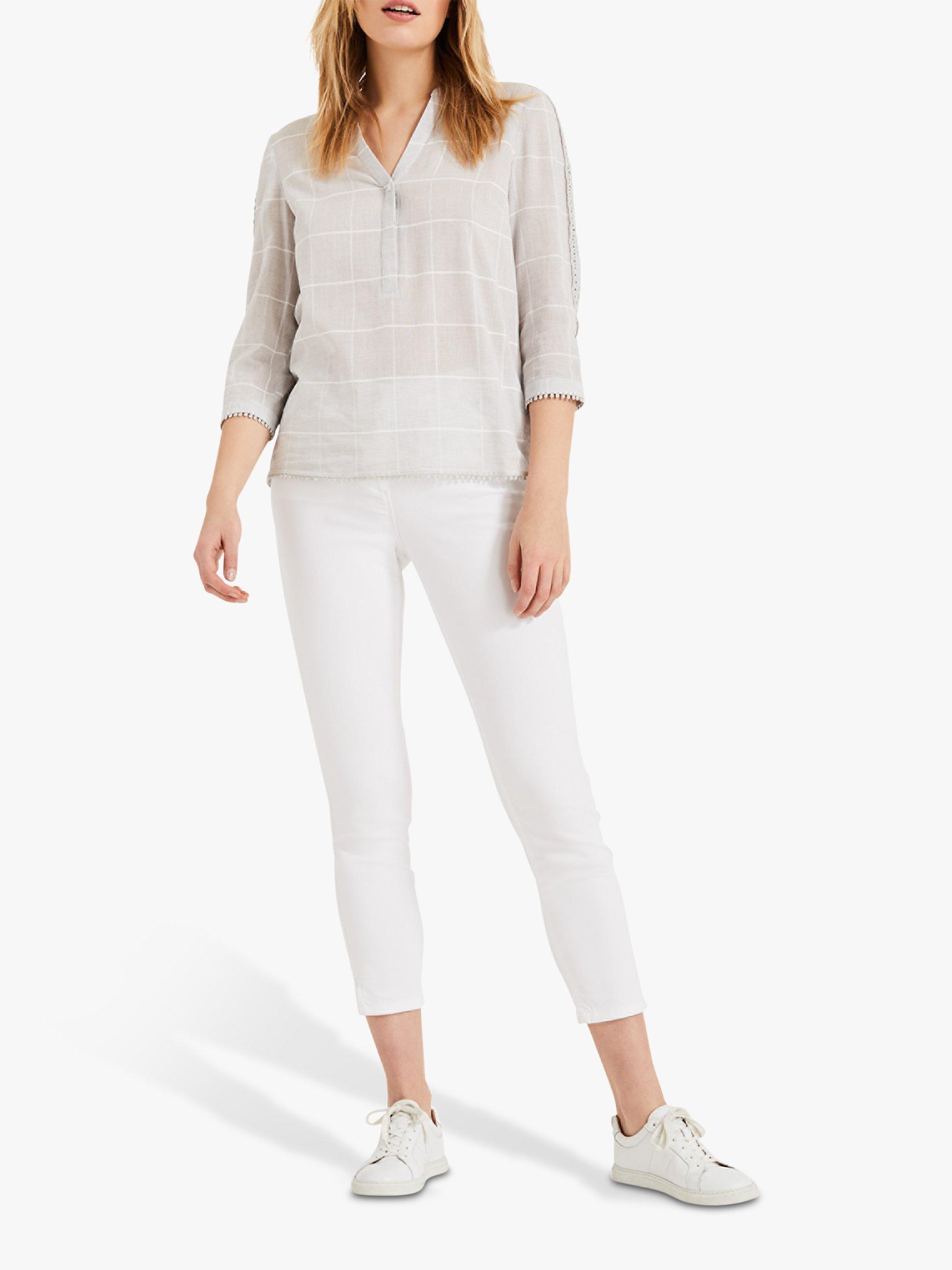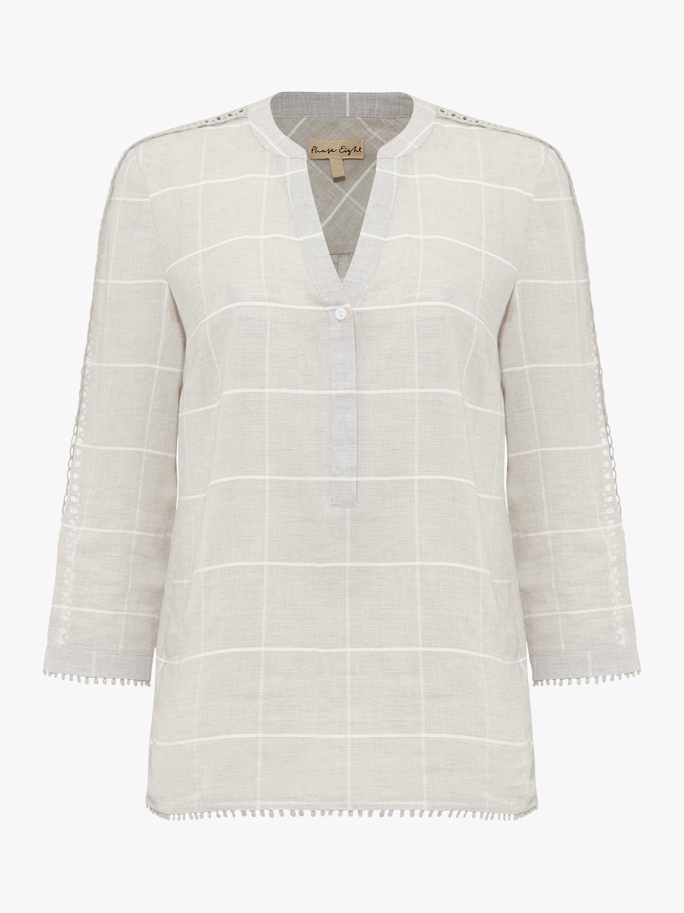 Designed from a light cotton-rich blend, this Lynsey blouse from Phase Eight can offer a distinctive edge to many an ensemble, with a smart check finish and detailed embroidery running down the three-quarter length sleeves. This blouse fastens with a working button placket at the V-neck and looks great with cropped trousers, skirts or denim.