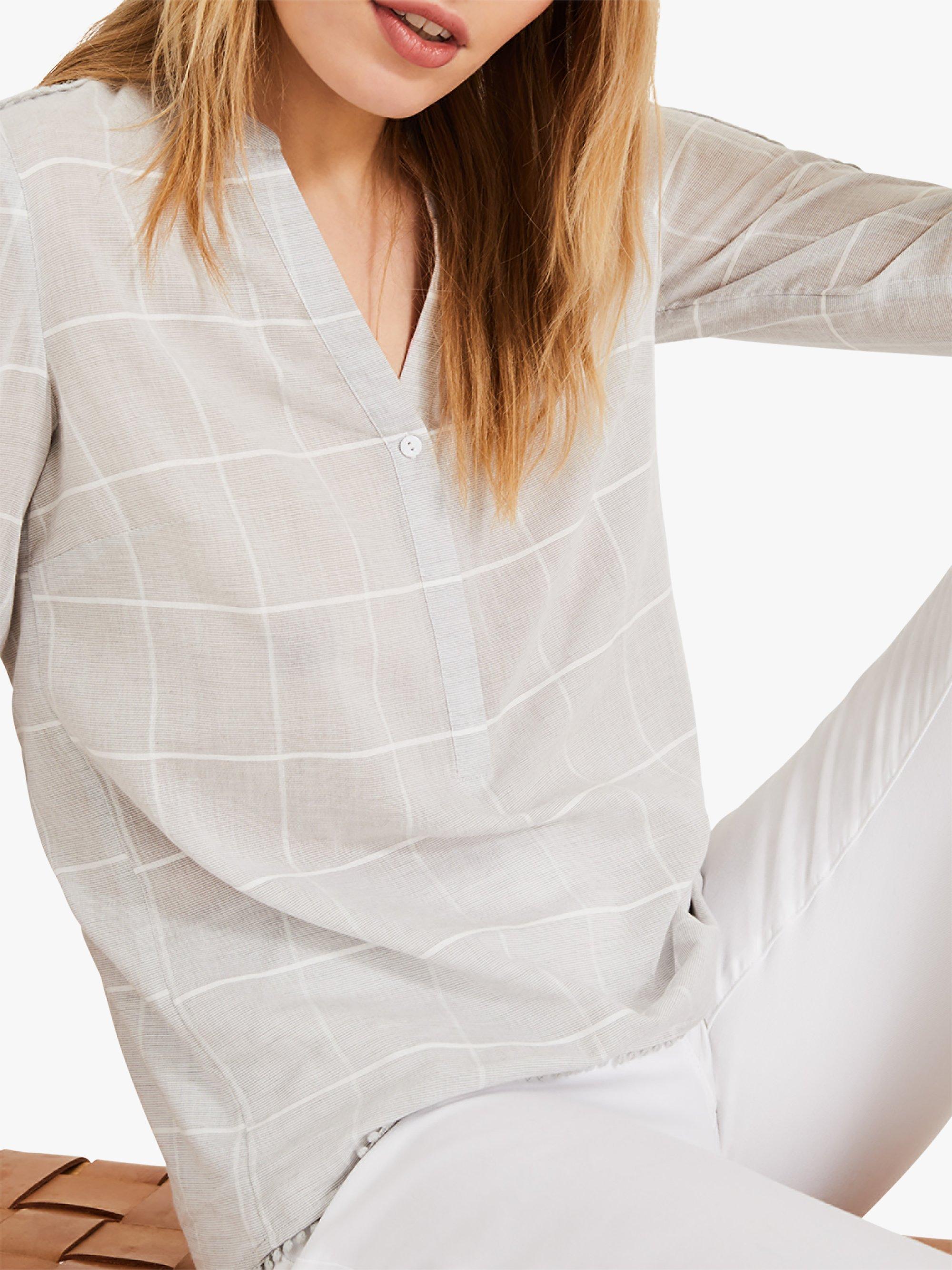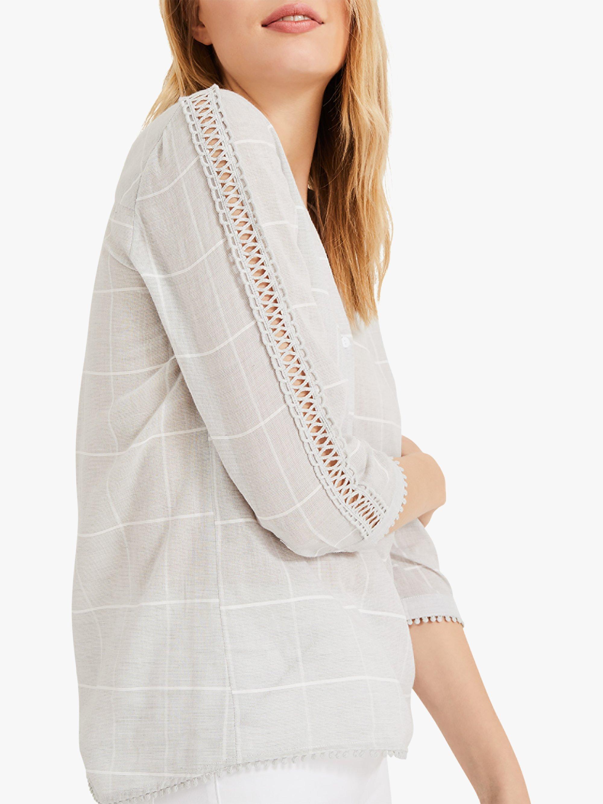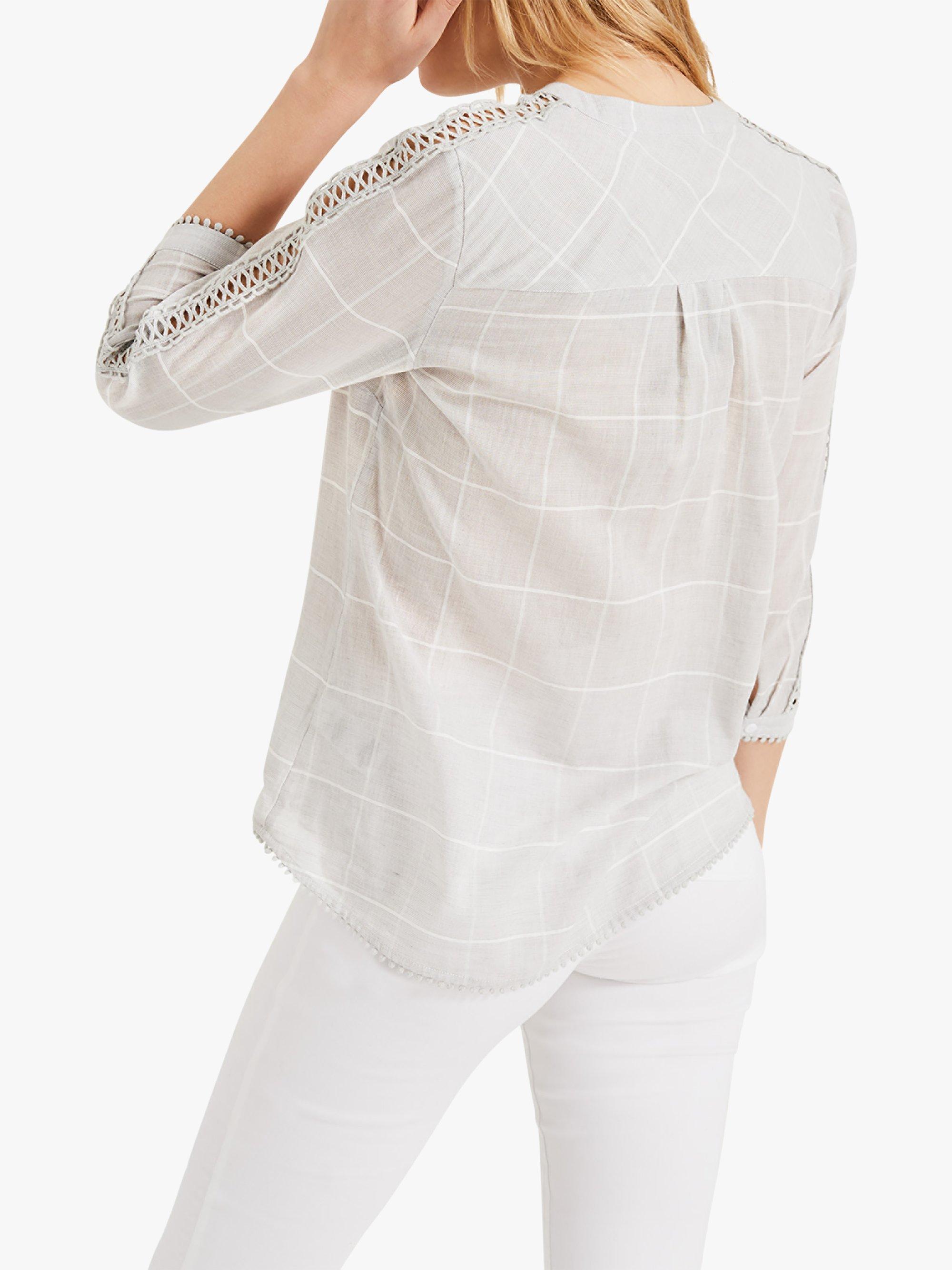 Designed from a light cotton-rich blend, this Lynsey blouse from Phase Eight can offer a distinctive edge to many an ensemble, with a smart check finish and detailed embroidery running down the three-quarter length sleeves. This blouse fastens with a working button placket at the V-neck and looks great with cropped trousers, skirts or denim.