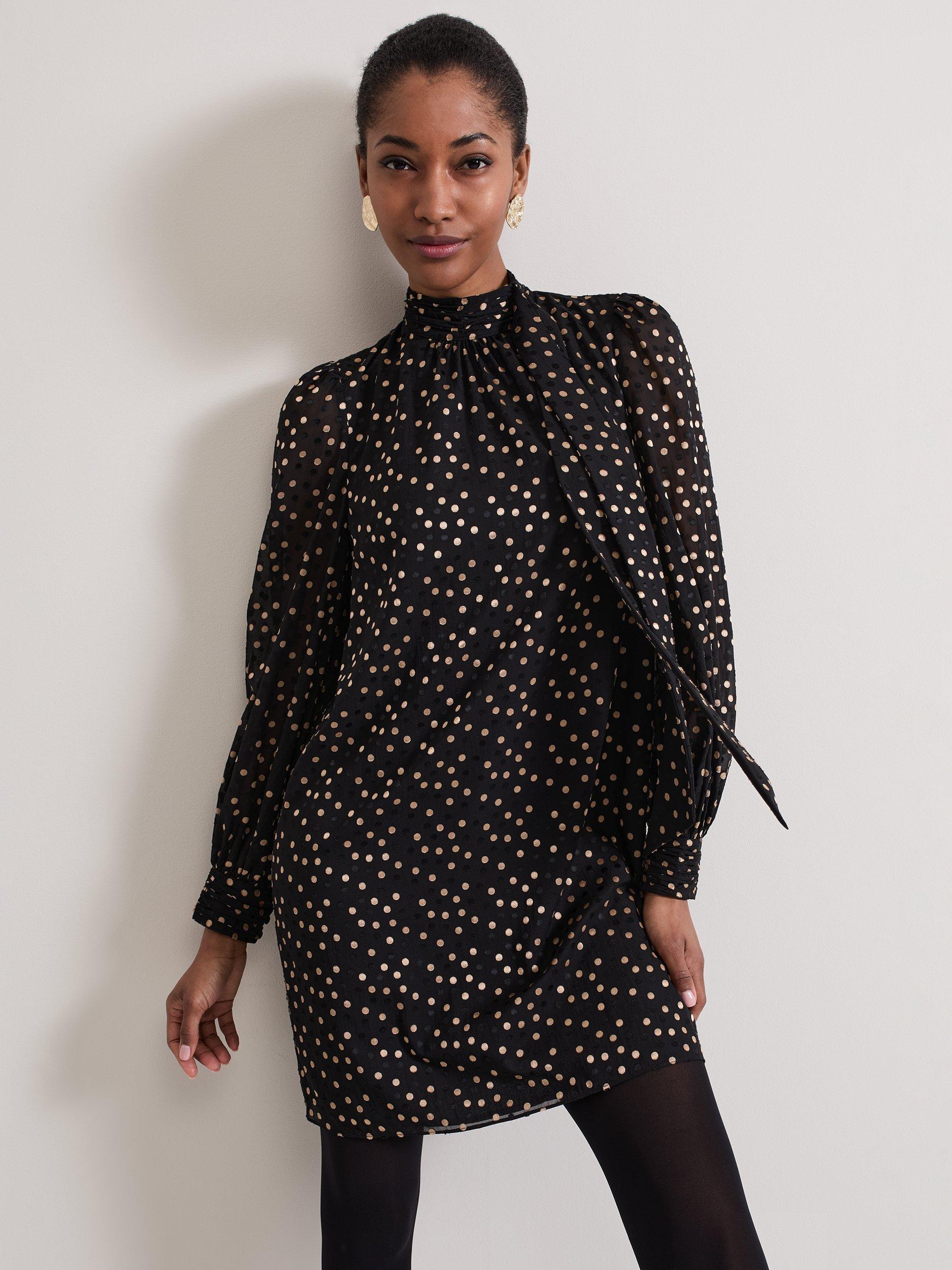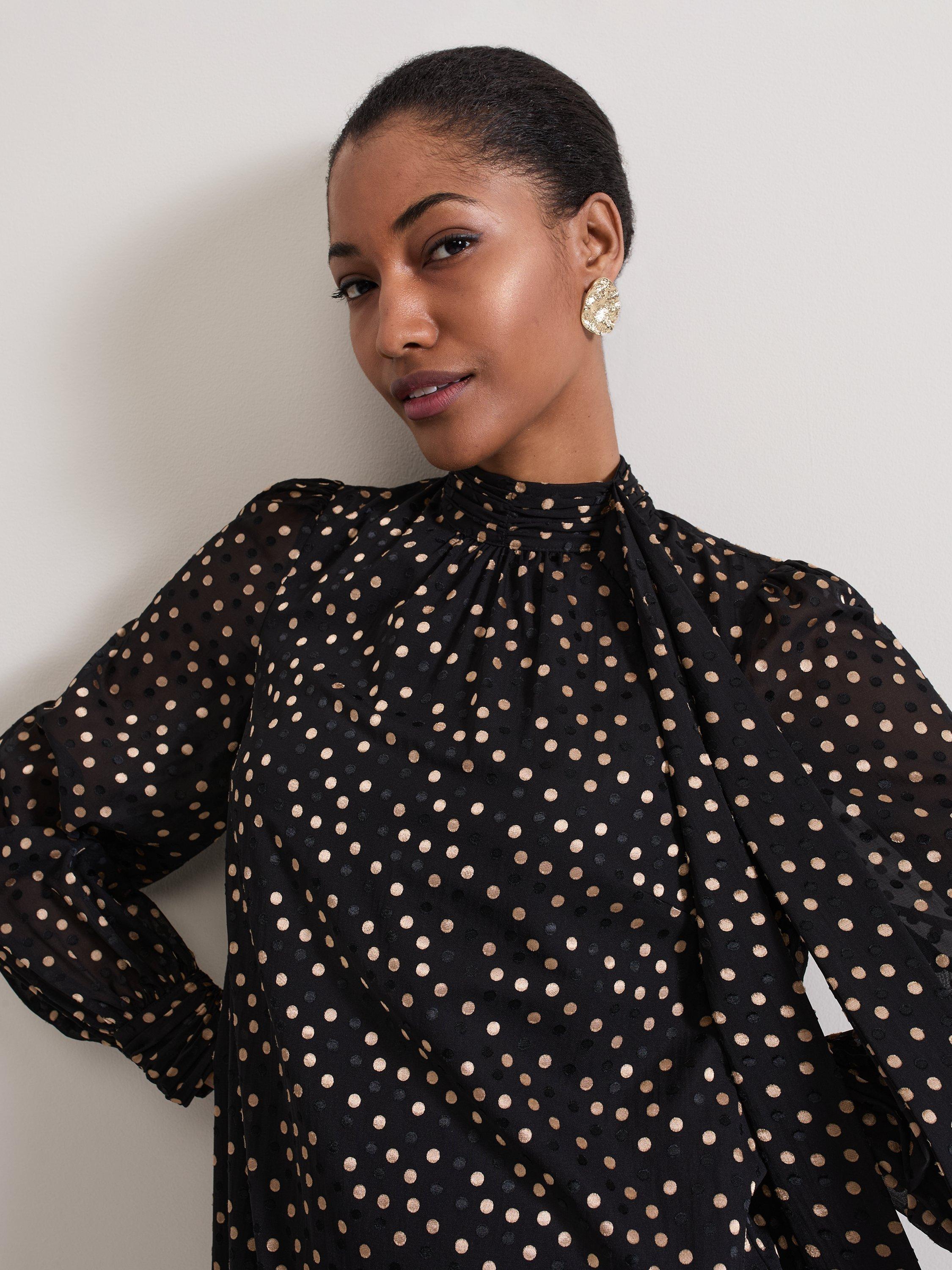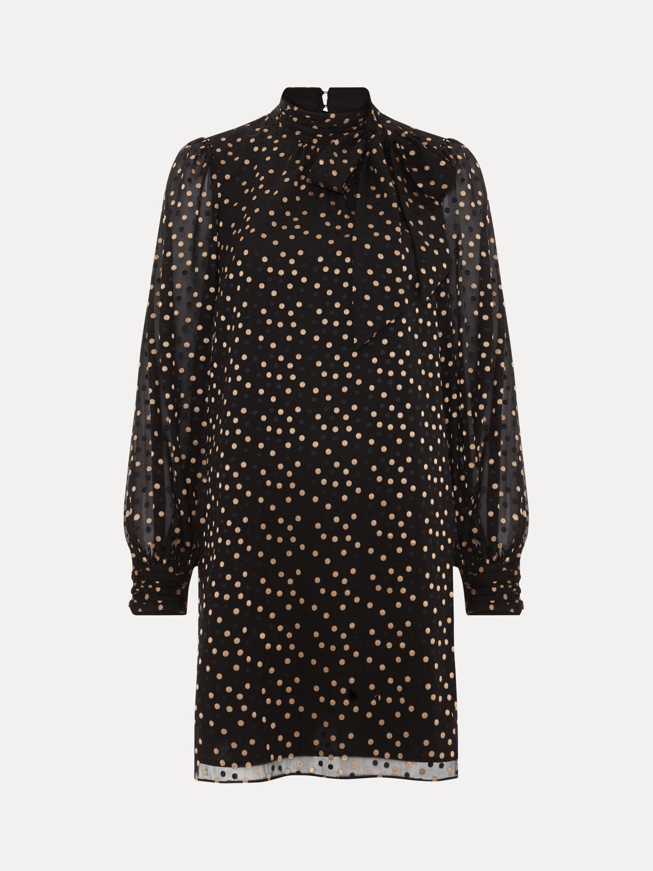 Designed on a plain base with a polka dot print, the Mabel dress is cut to a swing silhouette and features long blouson sleeves. The high round neck is elevated with a scarf detail to create the perfect statement mini for day or night.