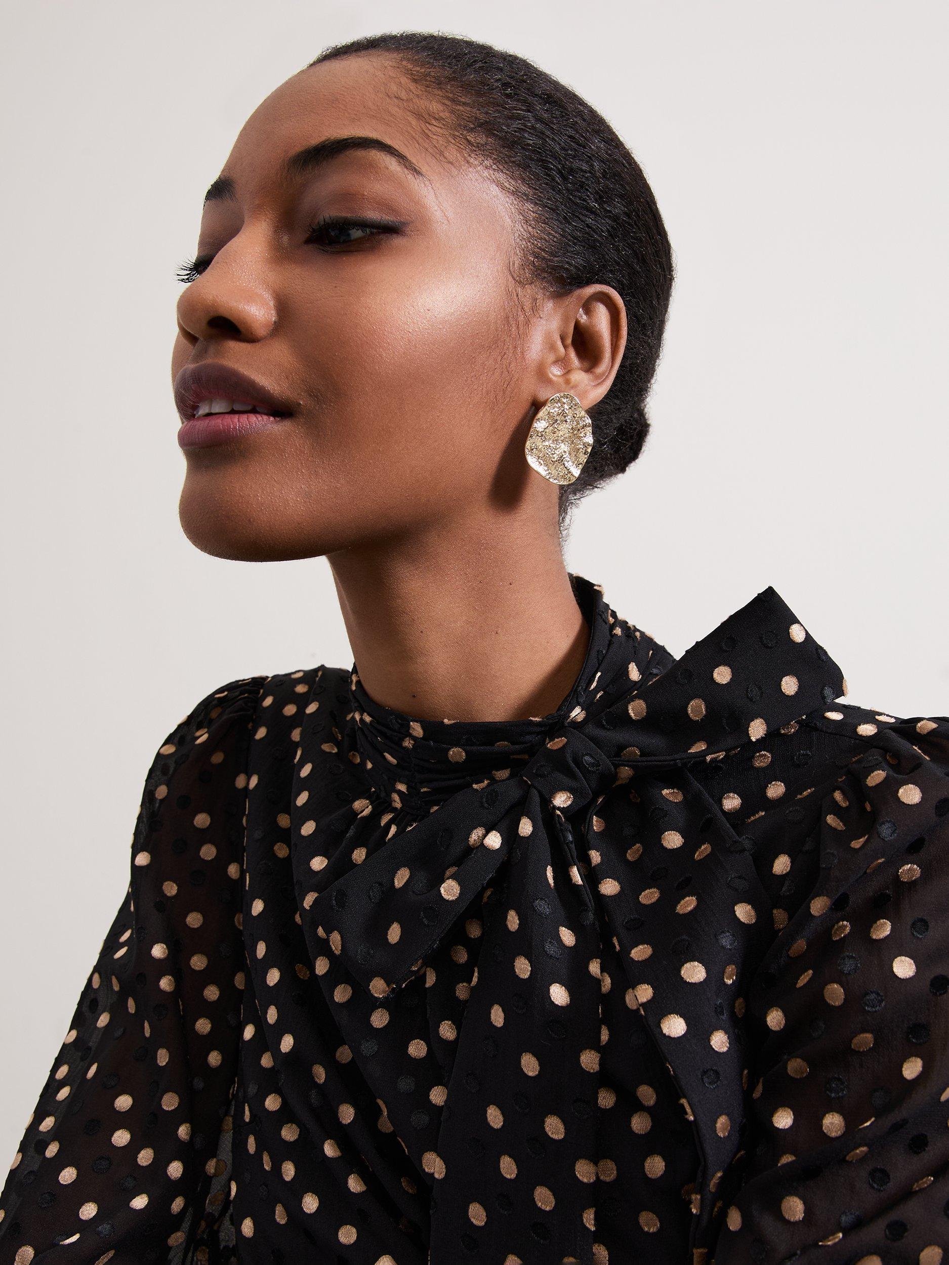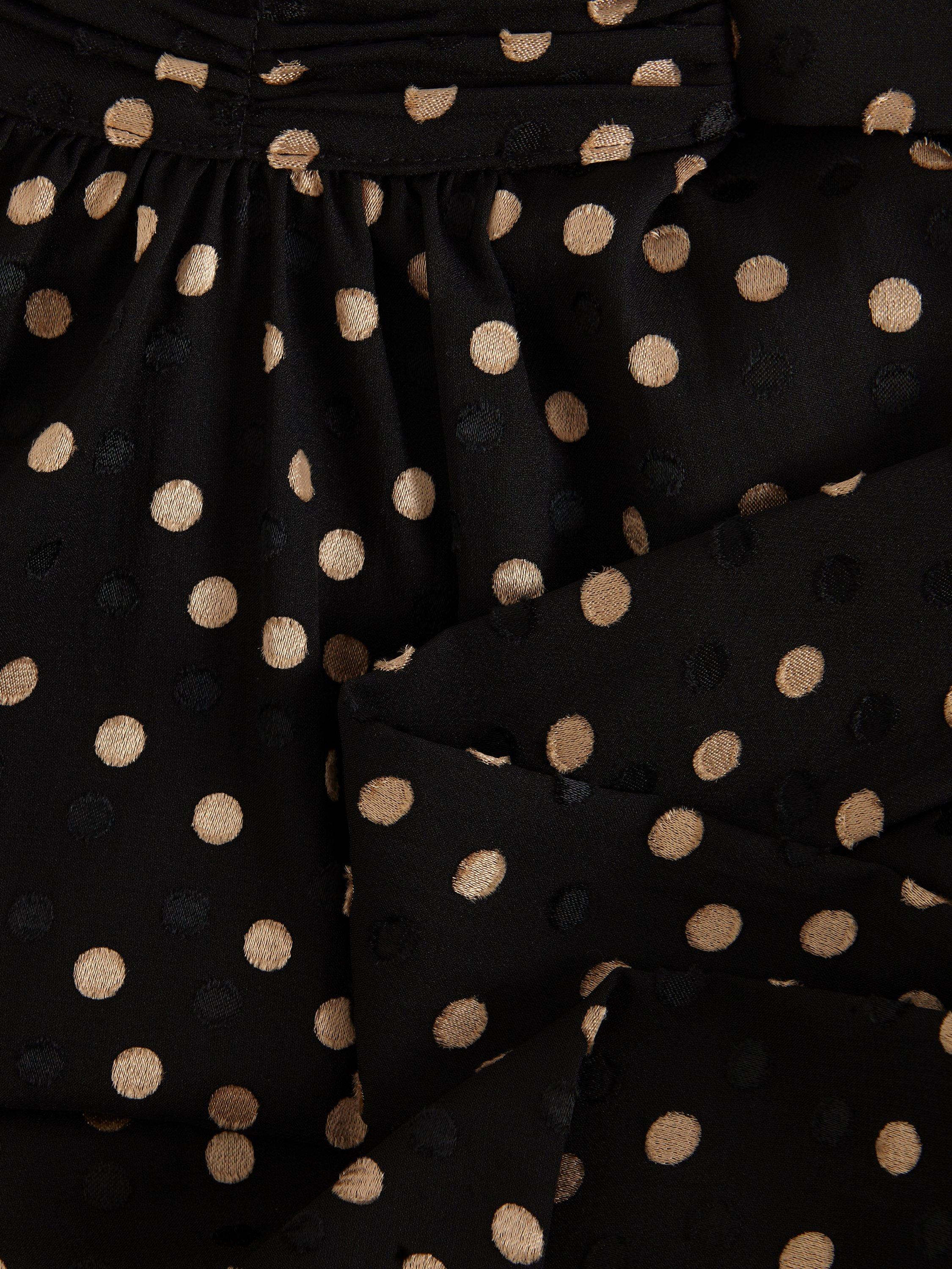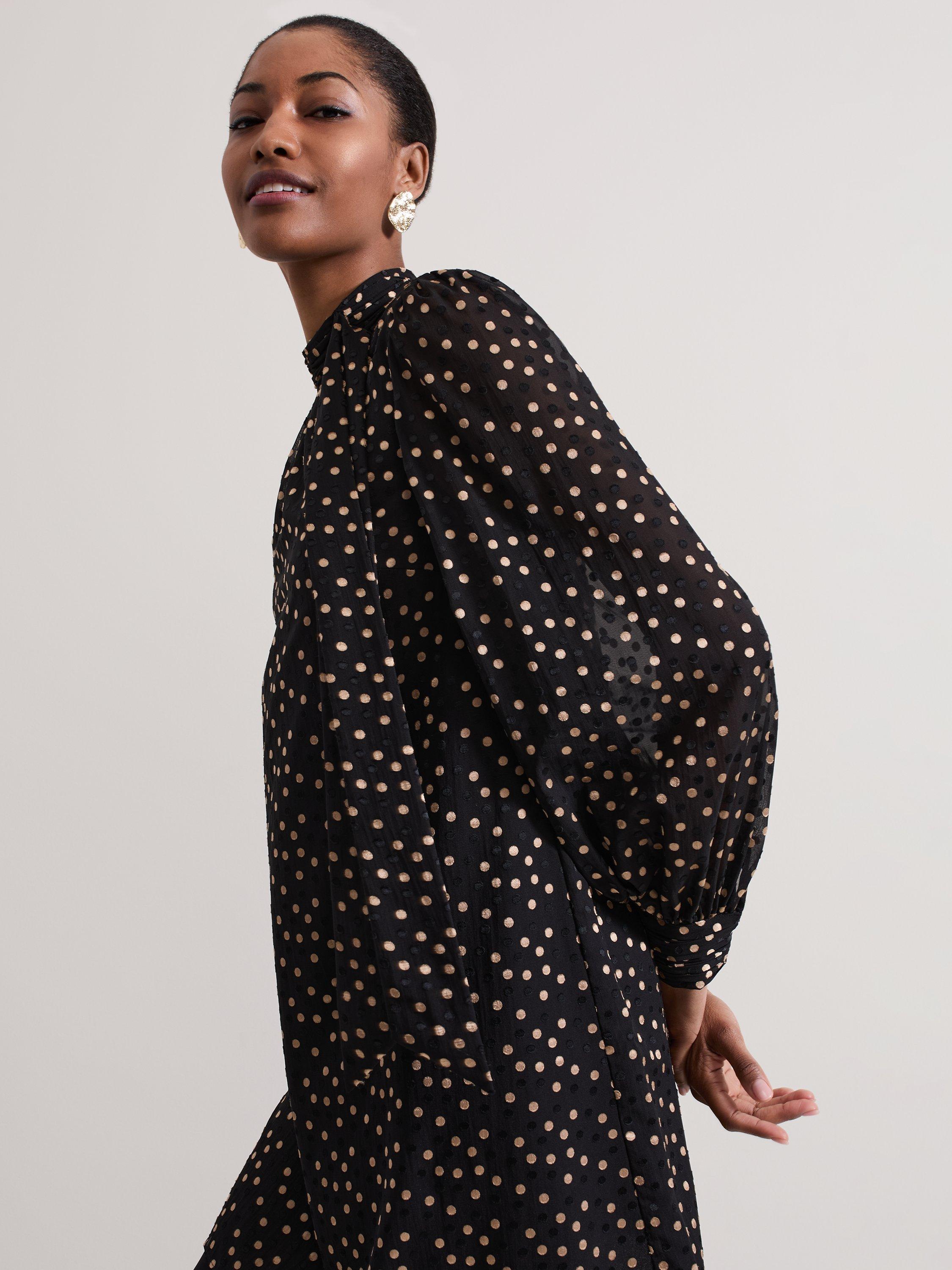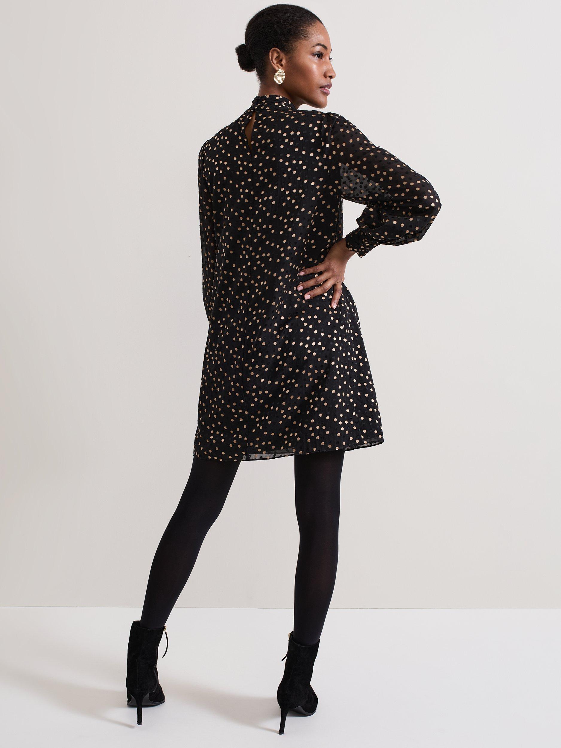 Designed on a plain base with a polka dot print, the Mabel dress is cut to a swing silhouette and features long blouson sleeves. The high round neck is elevated with a scarf detail to create the perfect statement mini for day or night.