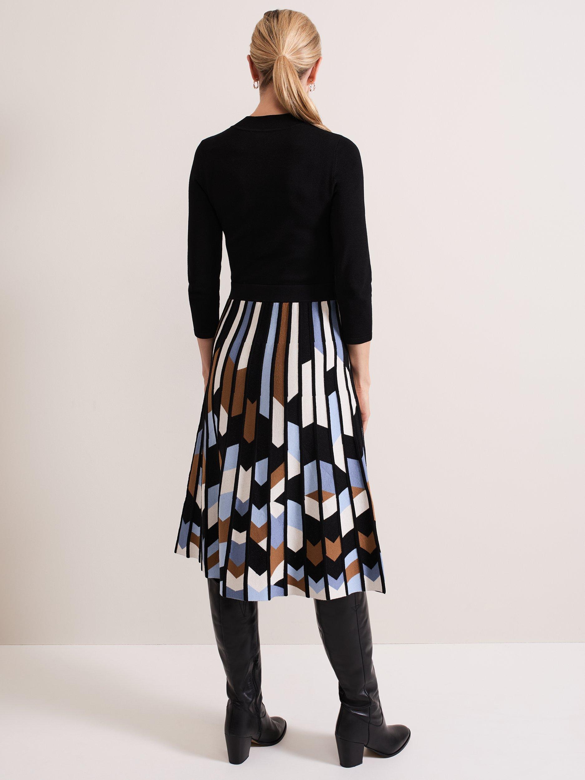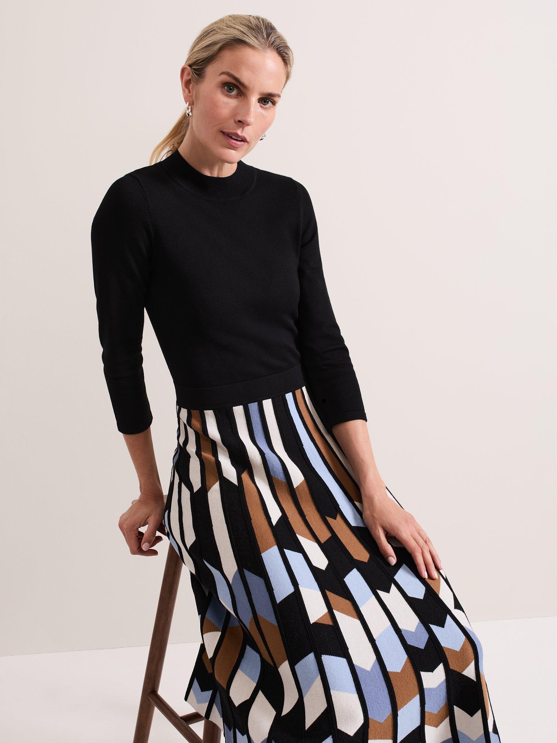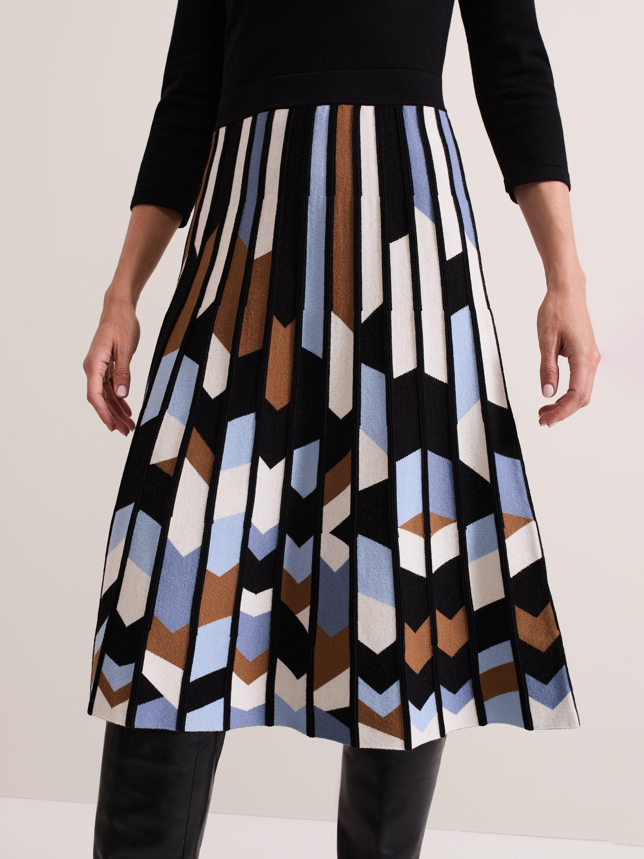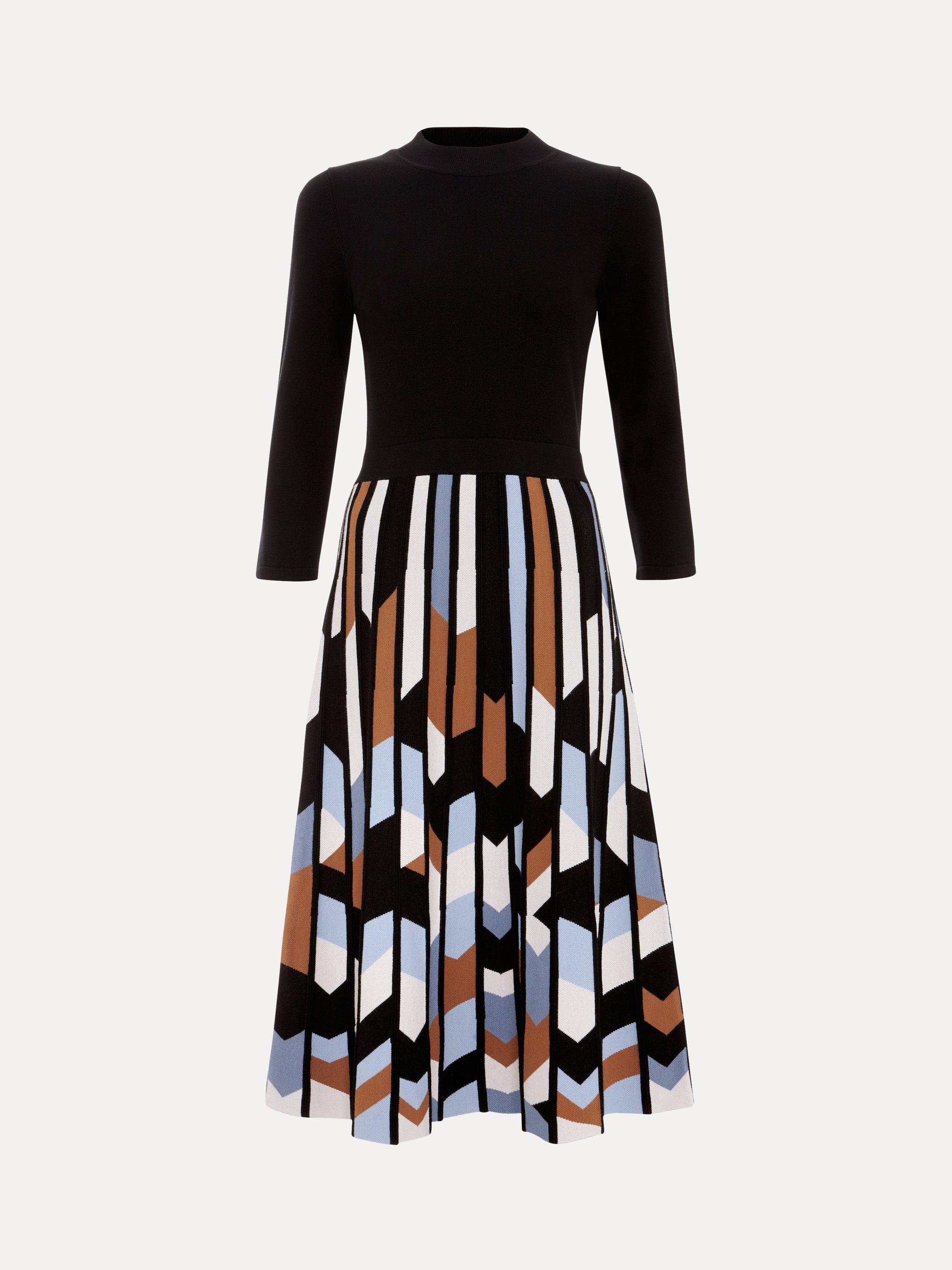 The knitted Maci dress is designed with a top that features a ribbed round neck and 3/4 length sleeves. Ribbed block detailing at the neck and a textured geometric print skirt elevates the style to create a sophisticated, feminine look.