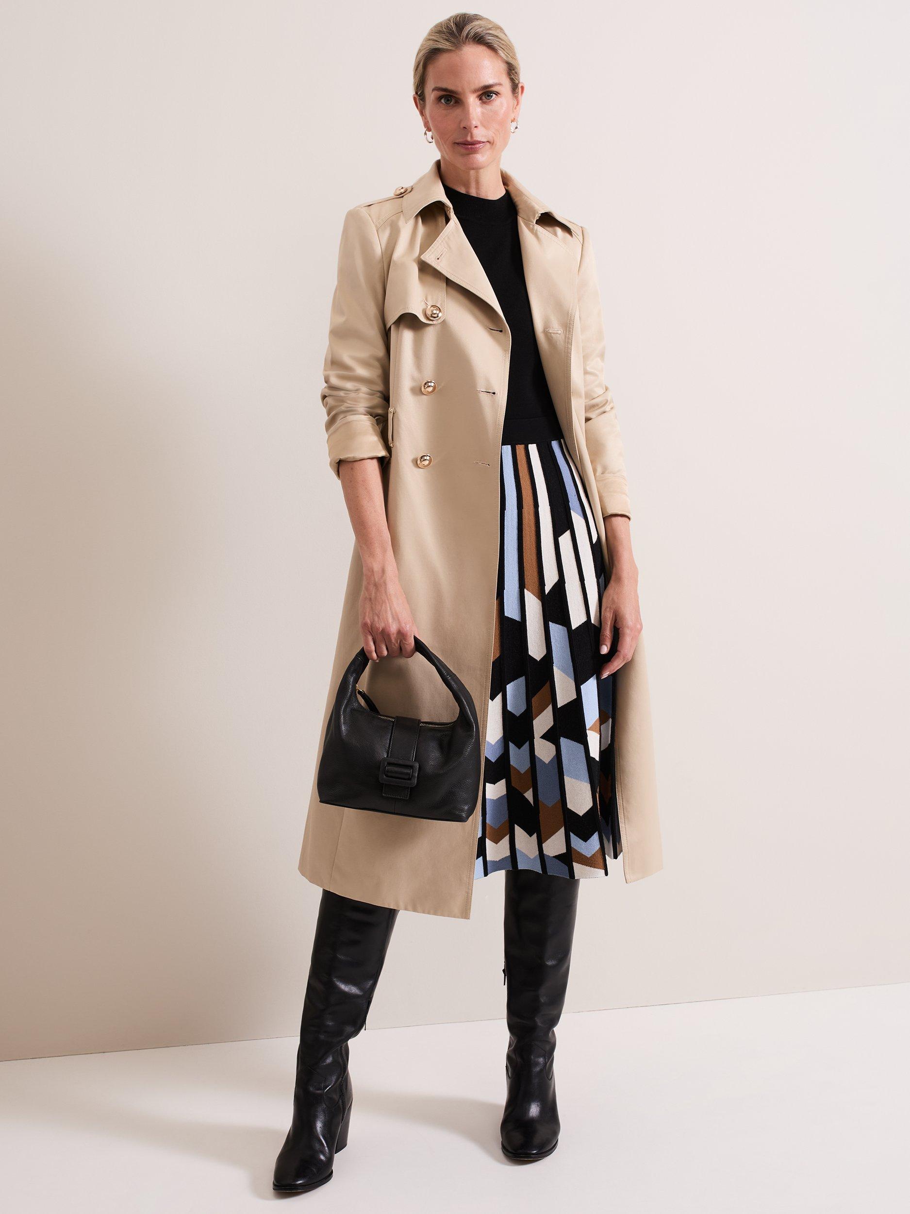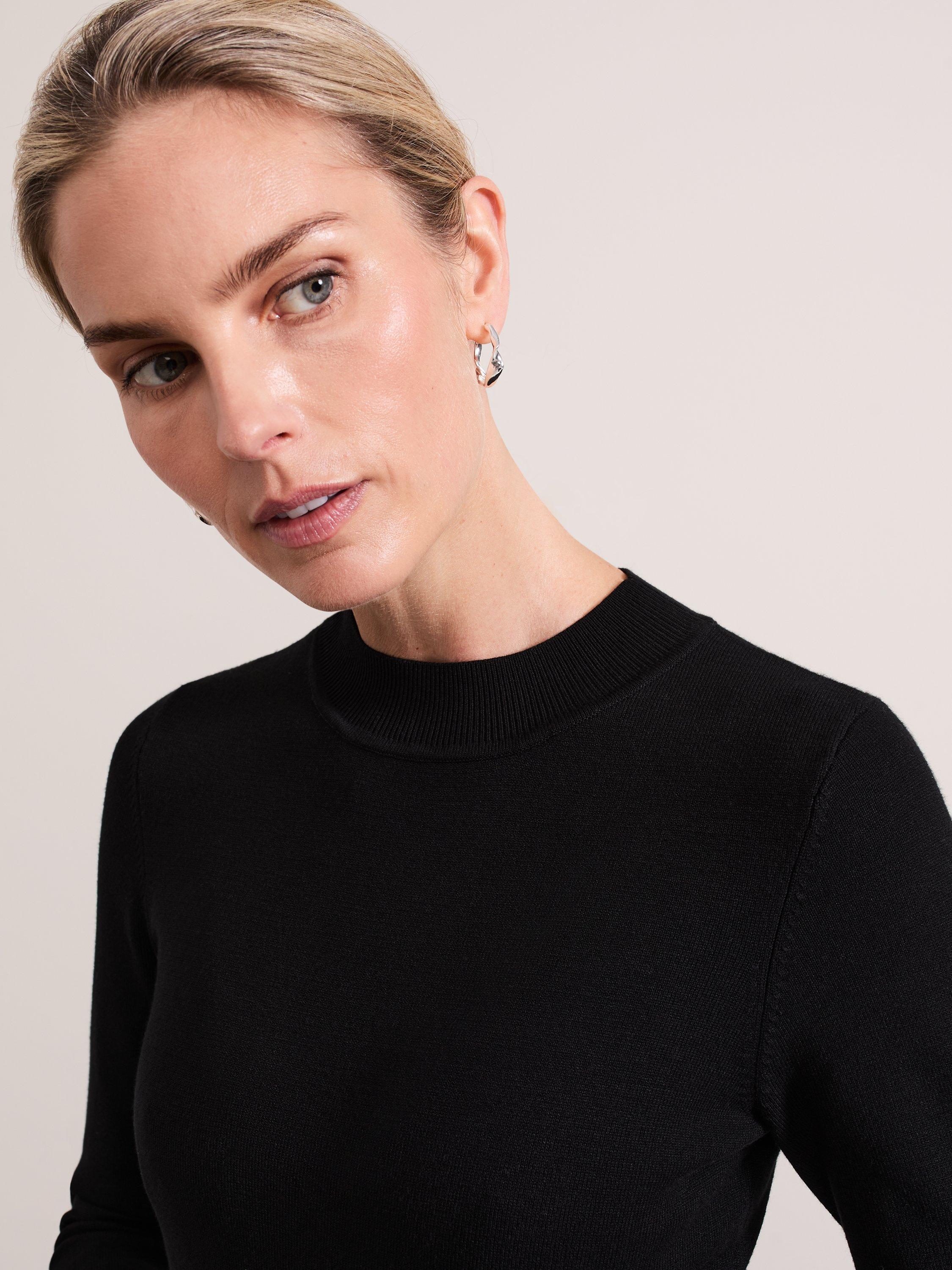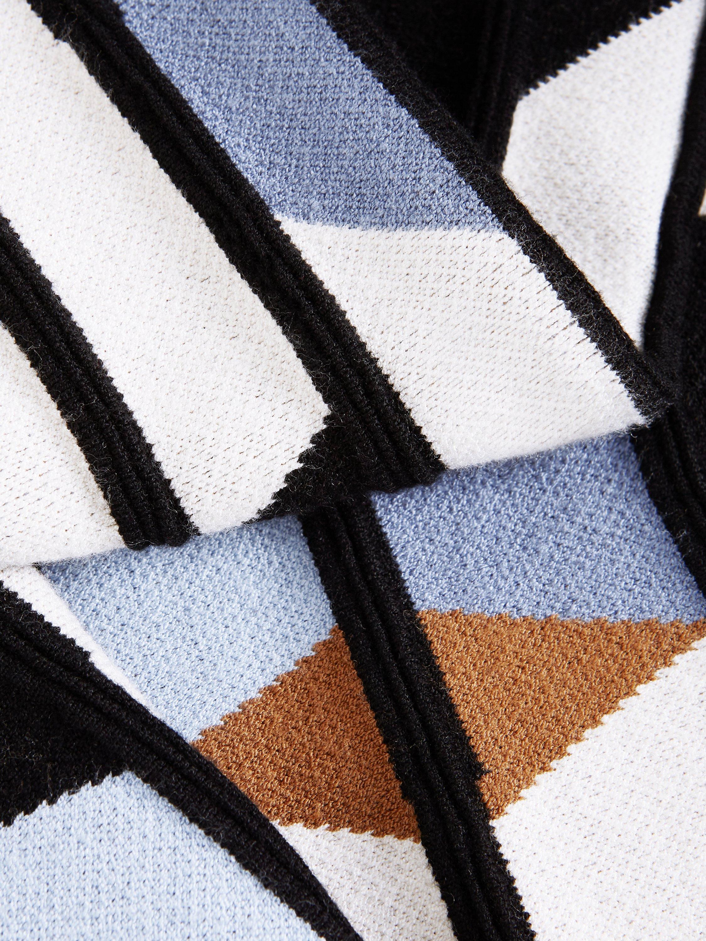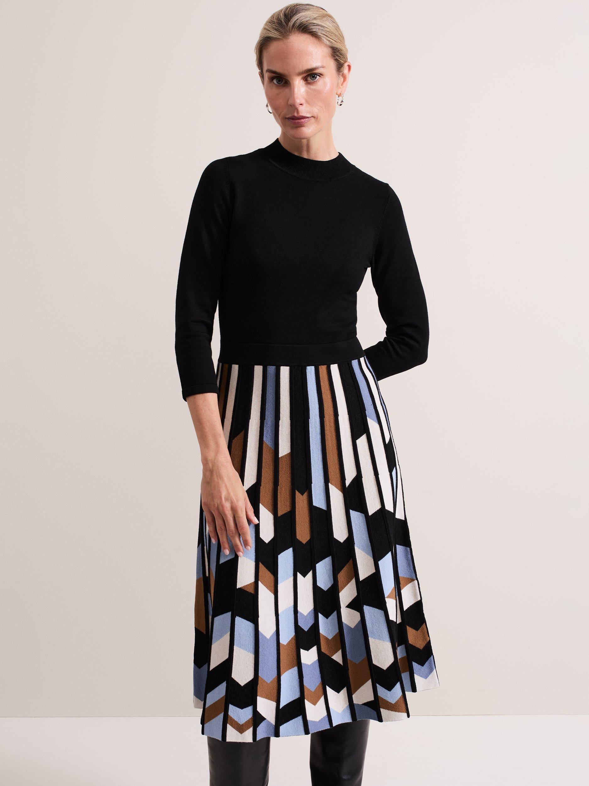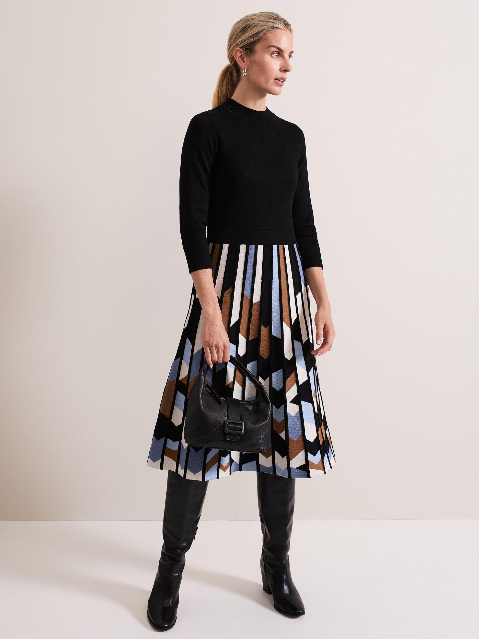 The knitted Maci dress is designed with a top that features a ribbed round neck and 3/4 length sleeves. Ribbed block detailing at the neck and a textured geometric print skirt elevates the style to create a sophisticated, feminine look.