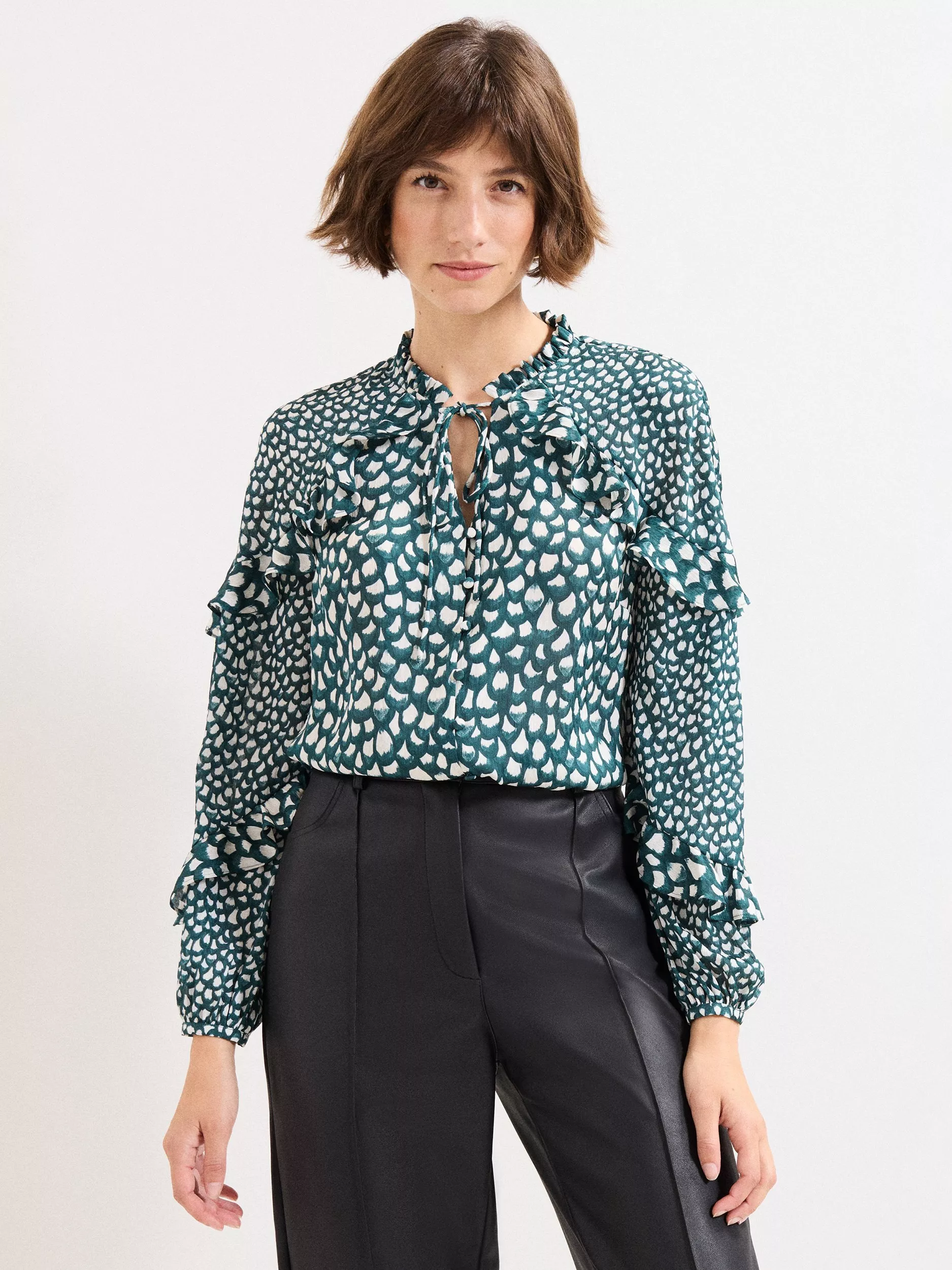 Designed in a modern in-house print, this effortlessly feminine blouse is stylish and versatile. With romantic frills and tie neck detail, this blouse will be your new everyday style, elevating your wardrobe rotation season after season.