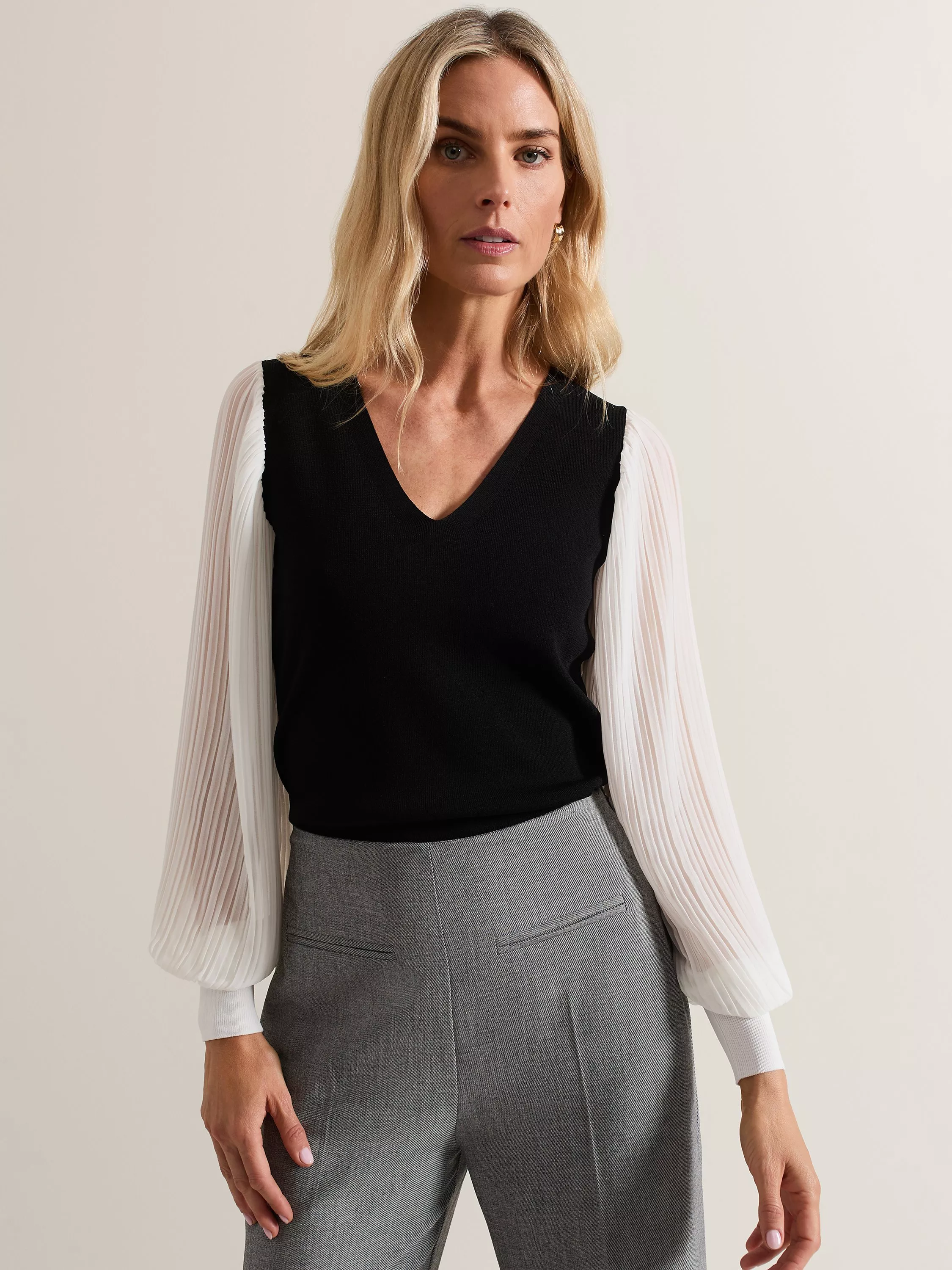 With a V-neck sweater style bodice and pleated balloon sleeves, our Maple jumper is sure to stand out. Style with any of your favourite separates for a polished look.