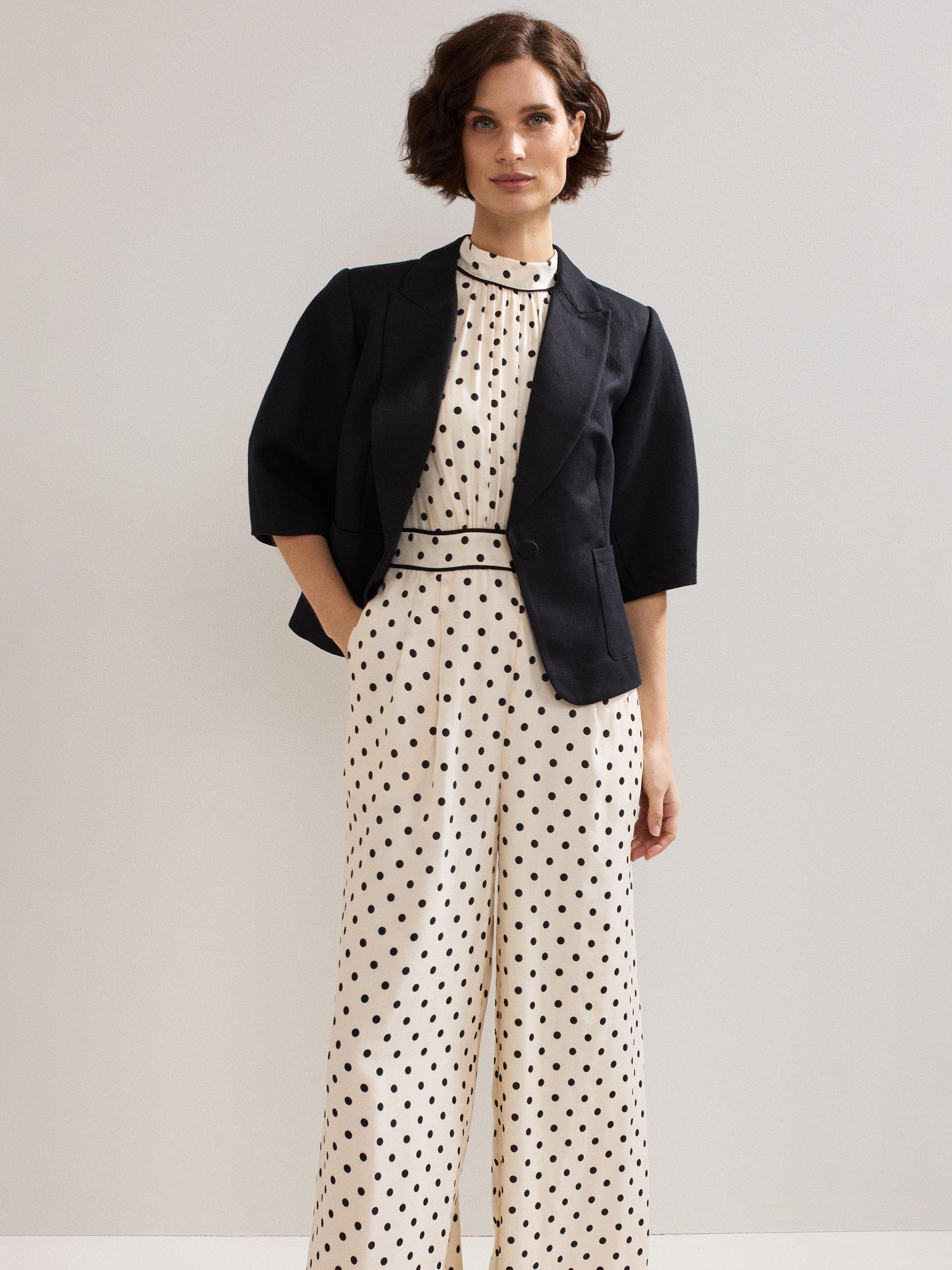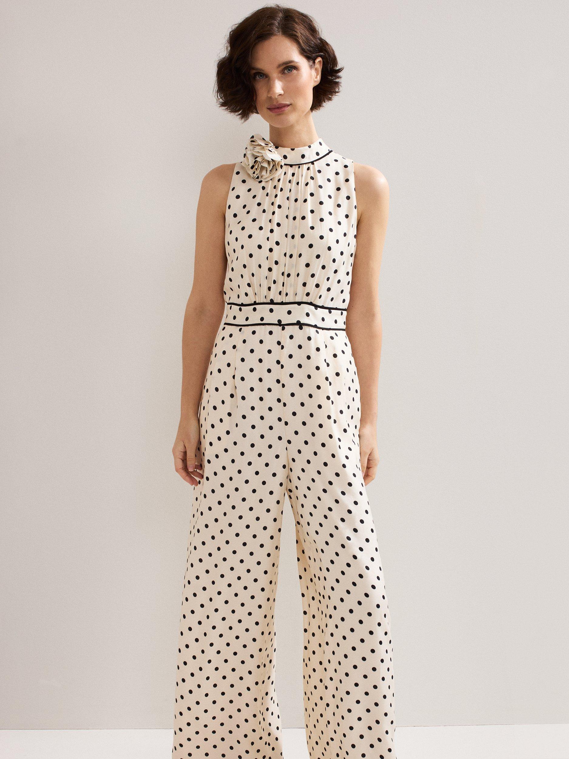 Add a touch of polka dot to your event wardrobe with this wide-leg jumpsuit. The waistband detail highlights your figure for a flattering fit, perfect for wearing all day or night. Finished with a romantic floral appliqué at the neckline, this style perfectly combines the classic and contemporary for a standout look.