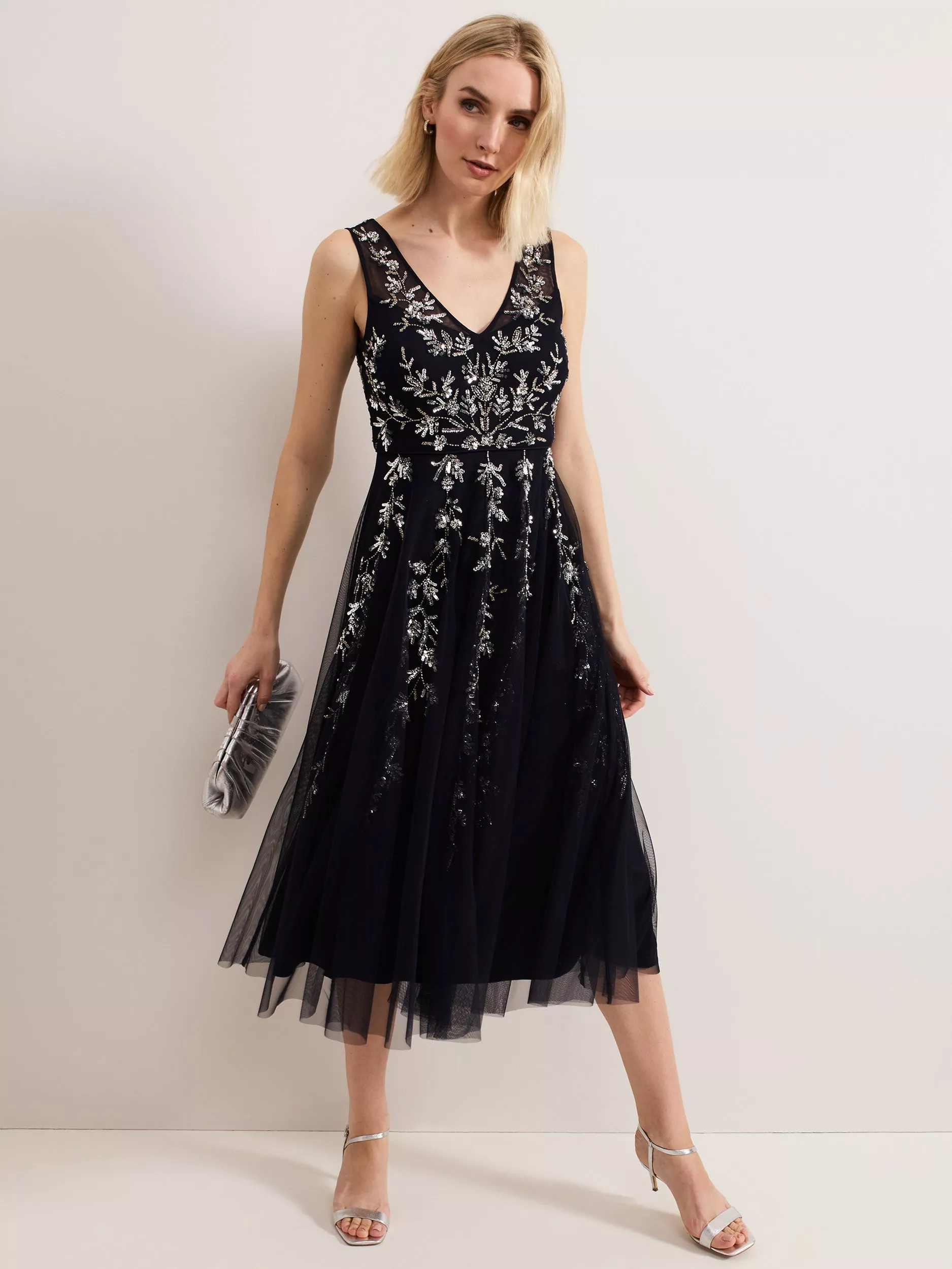 Timeless and sophisticated, meet the Marissa dress. Featuring a feminine V-neckline, this dress is embellished with intricate leaf print beading that flows down the bodice. The subtly pleated tulle skirt adds volume to the midi silhouette, perfect for glamorous events.