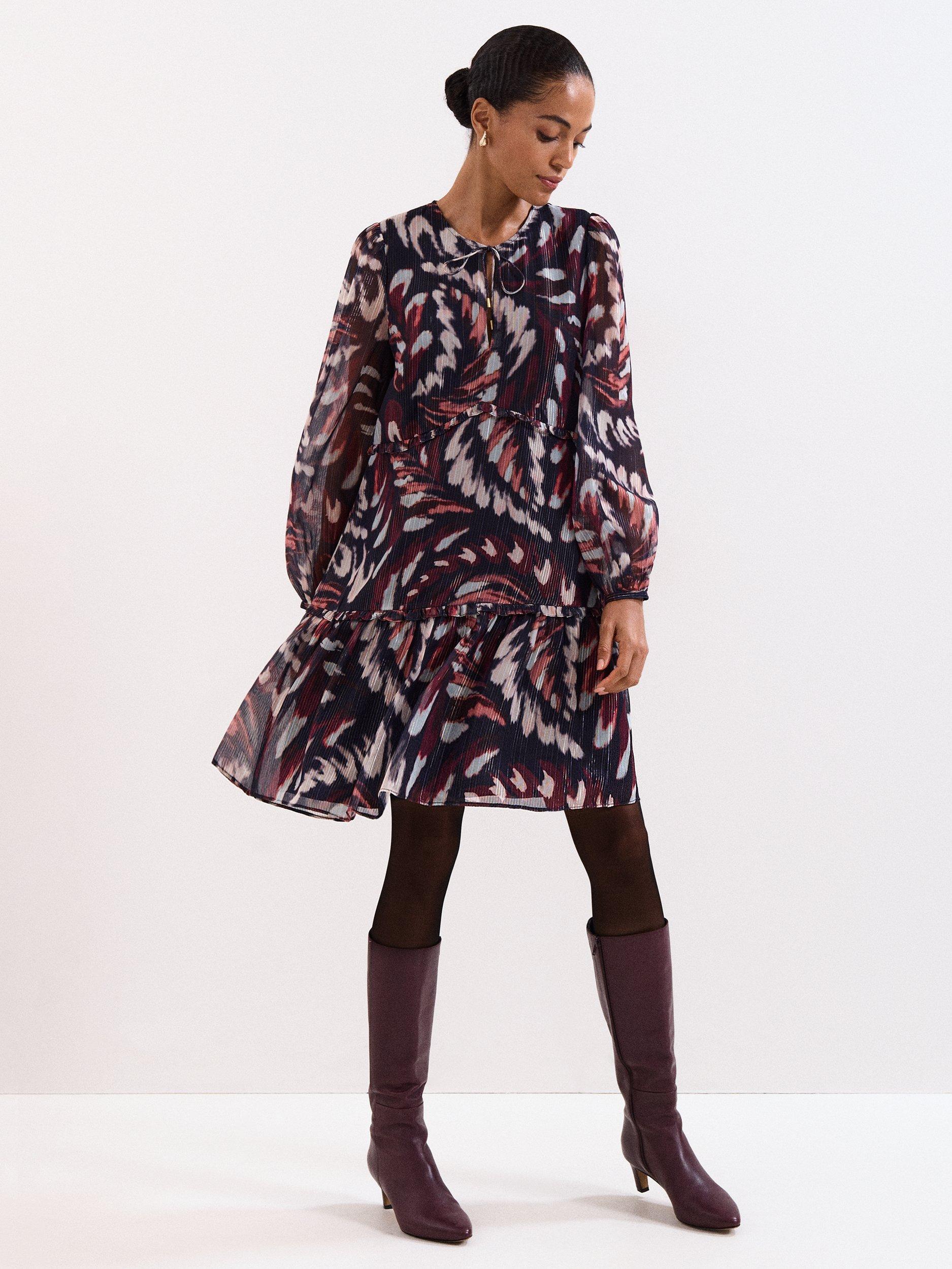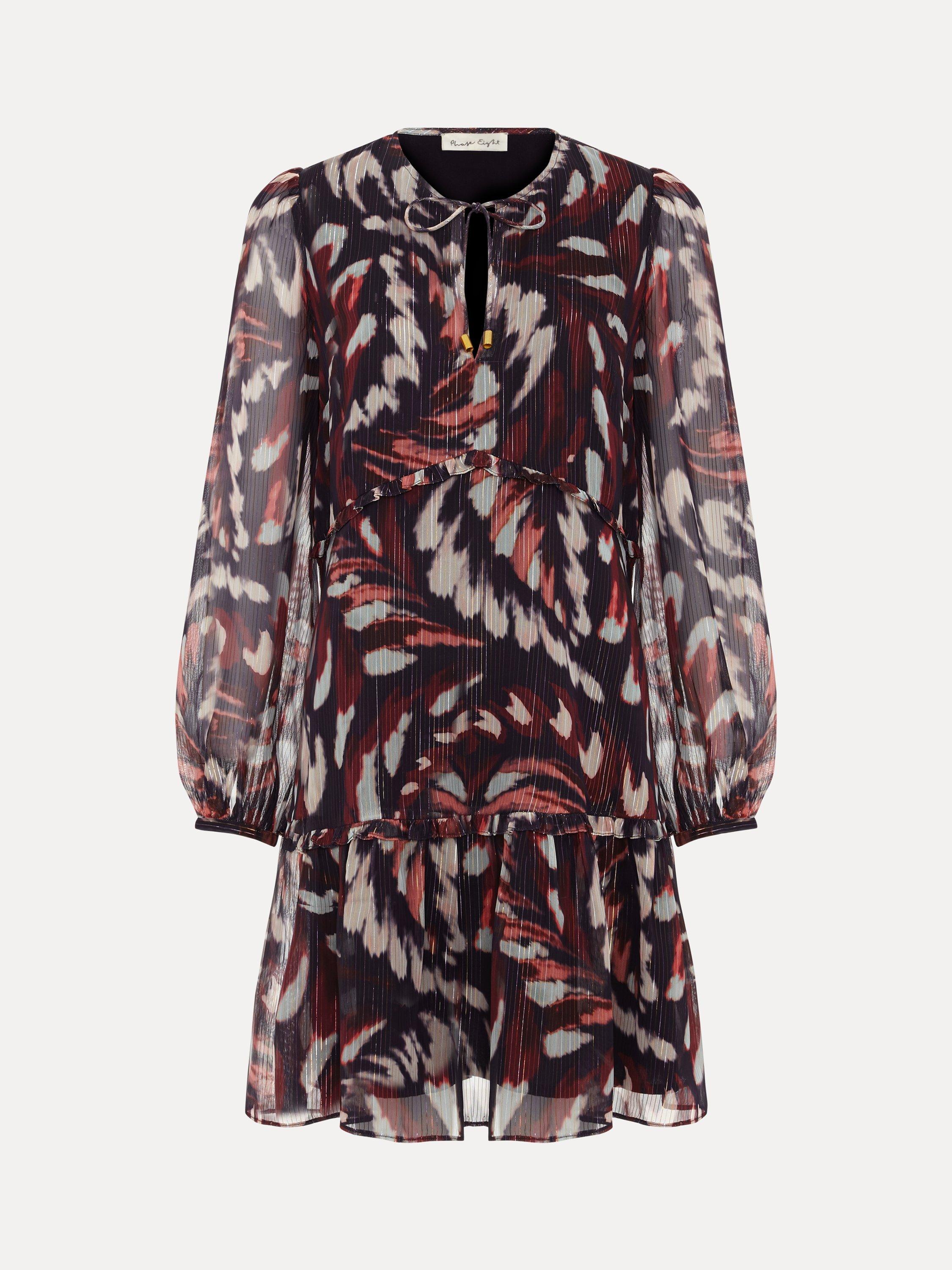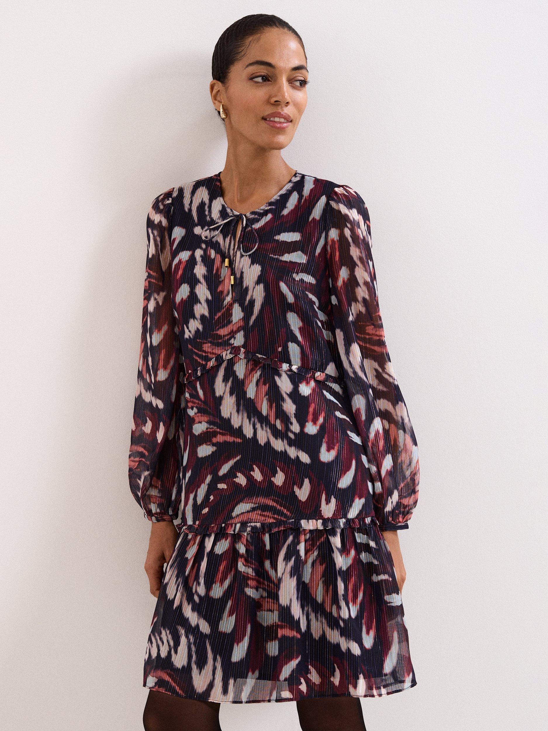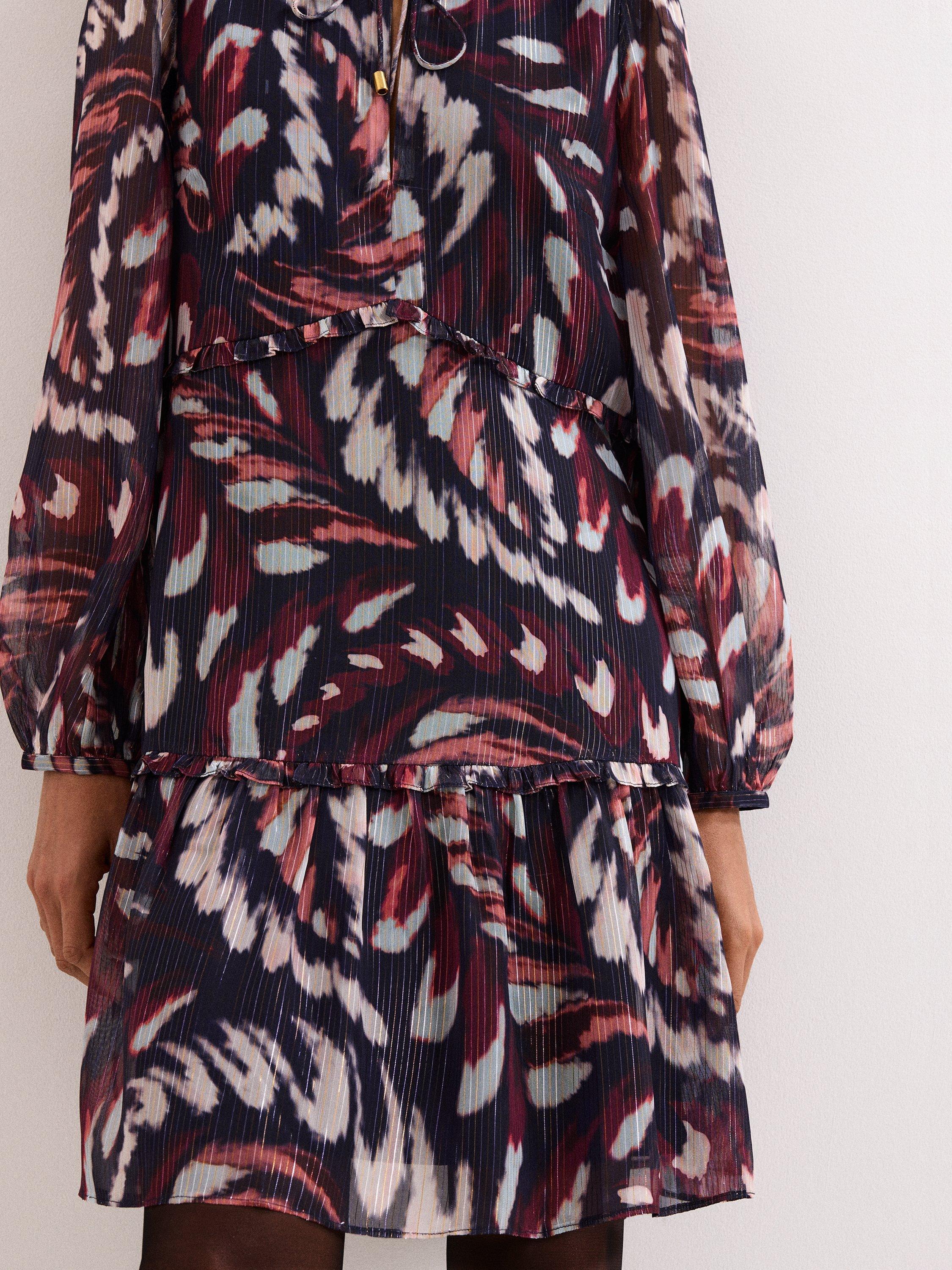 This mini dress combines a playful abstract pattern with a clever tiered design, offering a comfortable fit for any daytime plan. The tie neck and long sleeves give you flexible styling, while the lining keeps you feeling at ease.