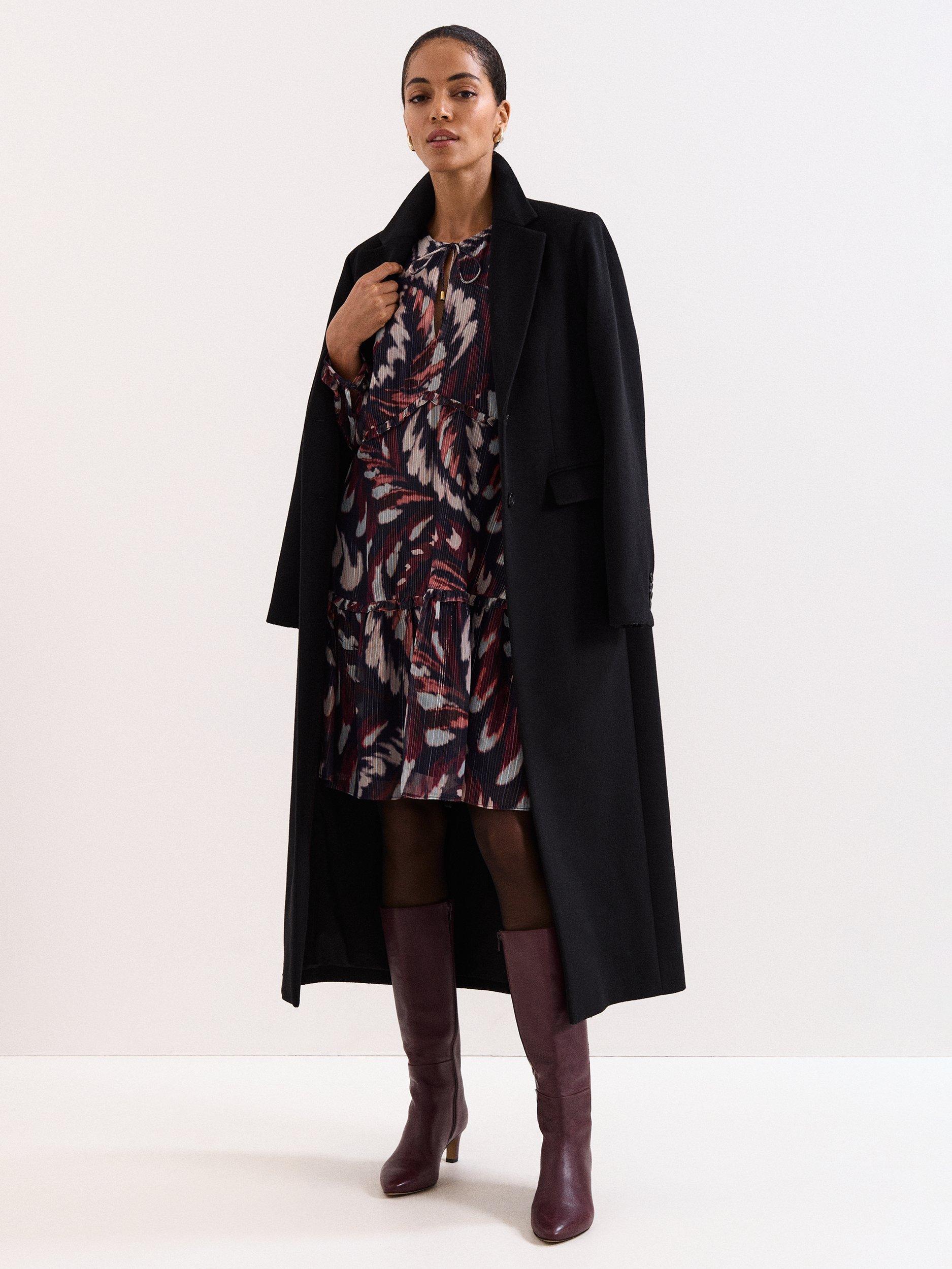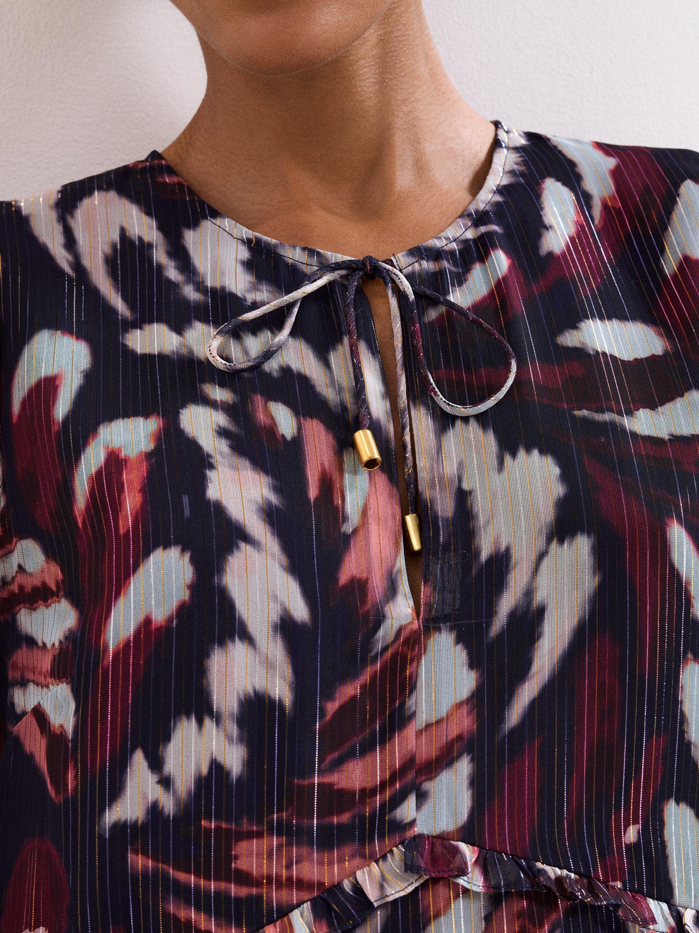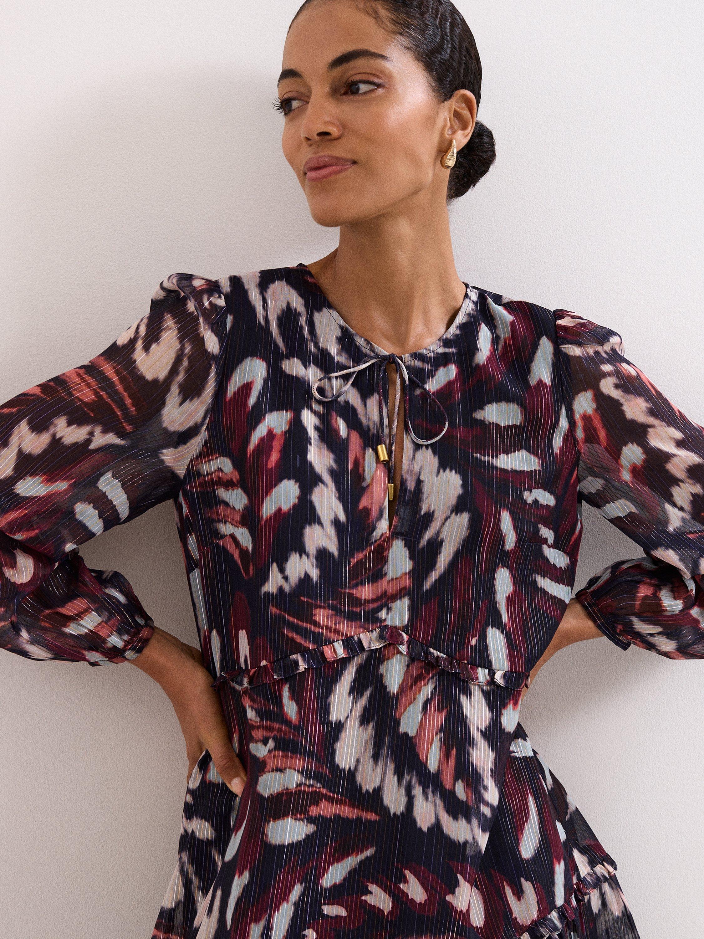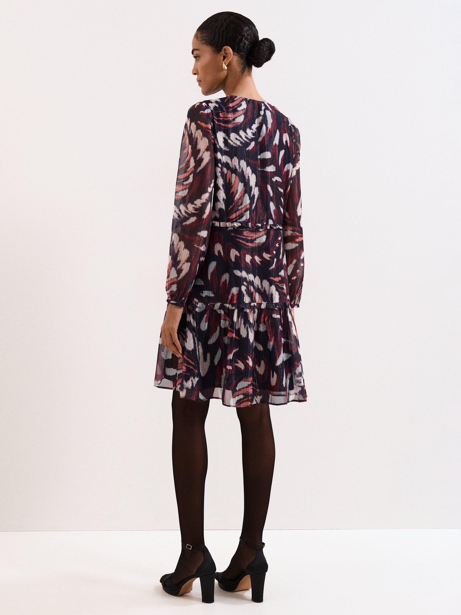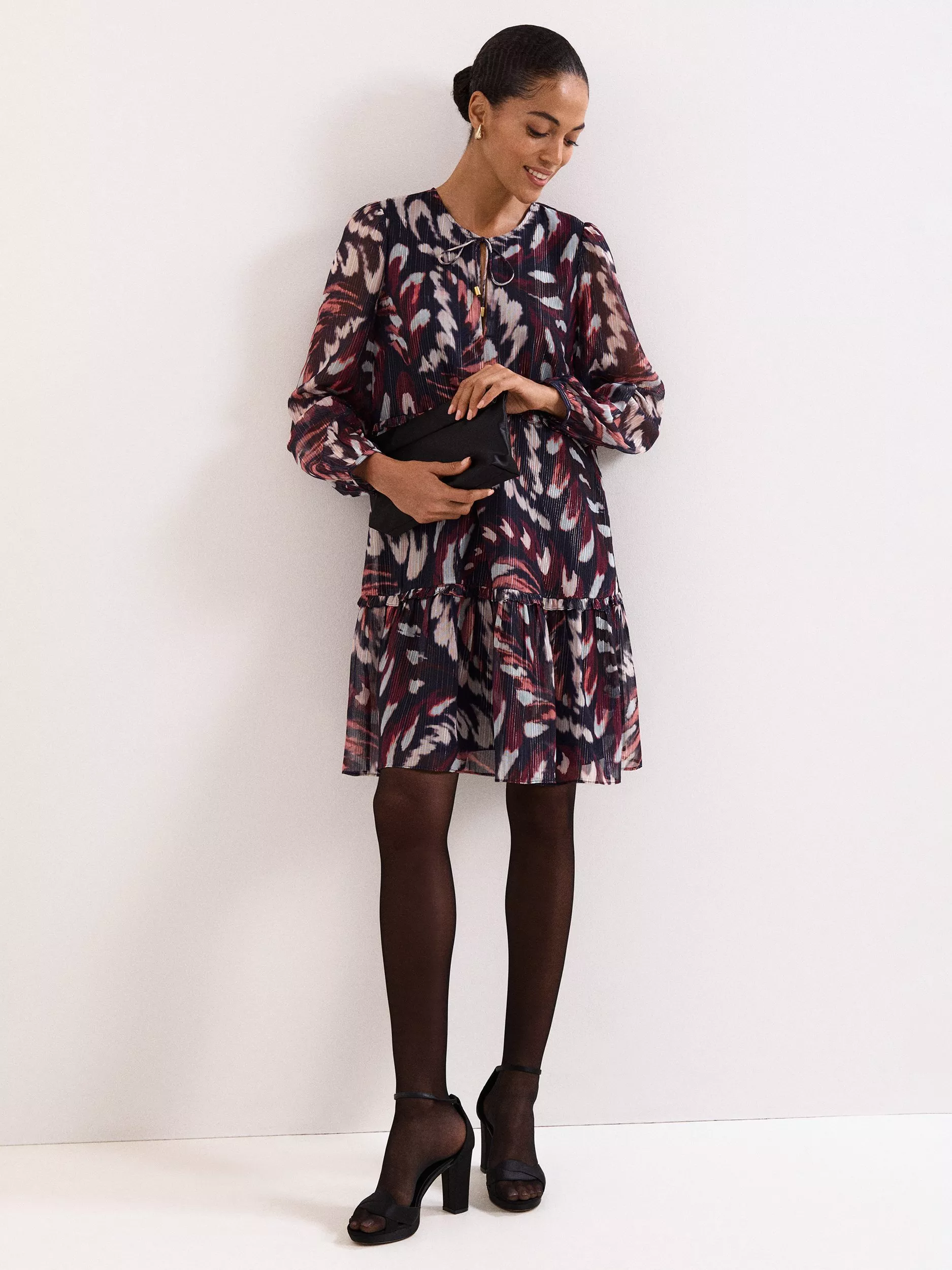 This mini dress combines a playful abstract pattern with a clever tiered design, offering a comfortable fit for any daytime plan. The tie neck and long sleeves give you flexible styling, while the lining keeps you feeling at ease.