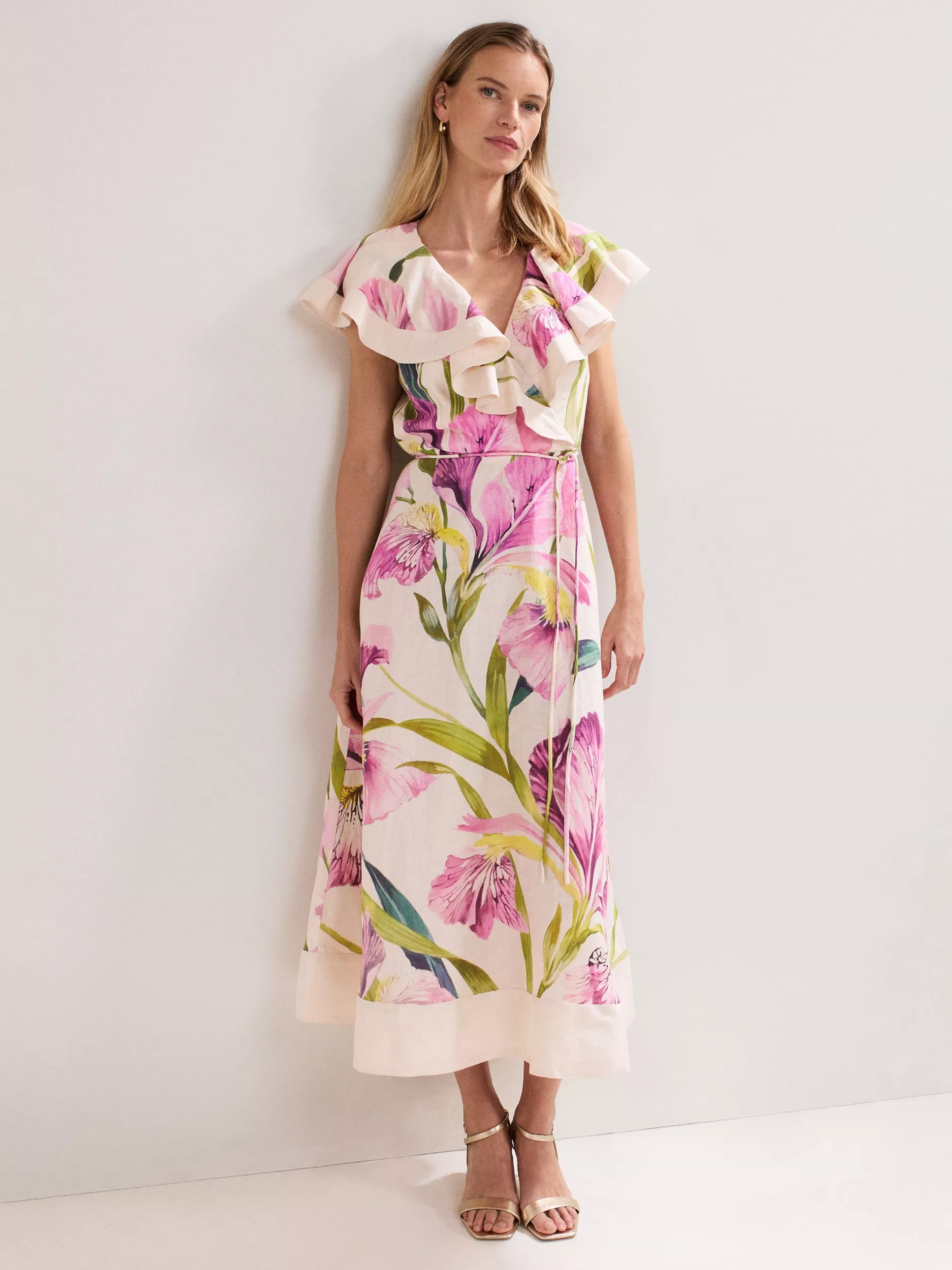Your spring summer wardrobe needs Phase Eight's Matilda dress. Beautiful ruffle detailing adds a touch of statement to the simple midi silhouette, whilst the vibrant floral print provides a feminine update. The linen blend has been crafted to reduce creasing, making this style perfect for summer events.