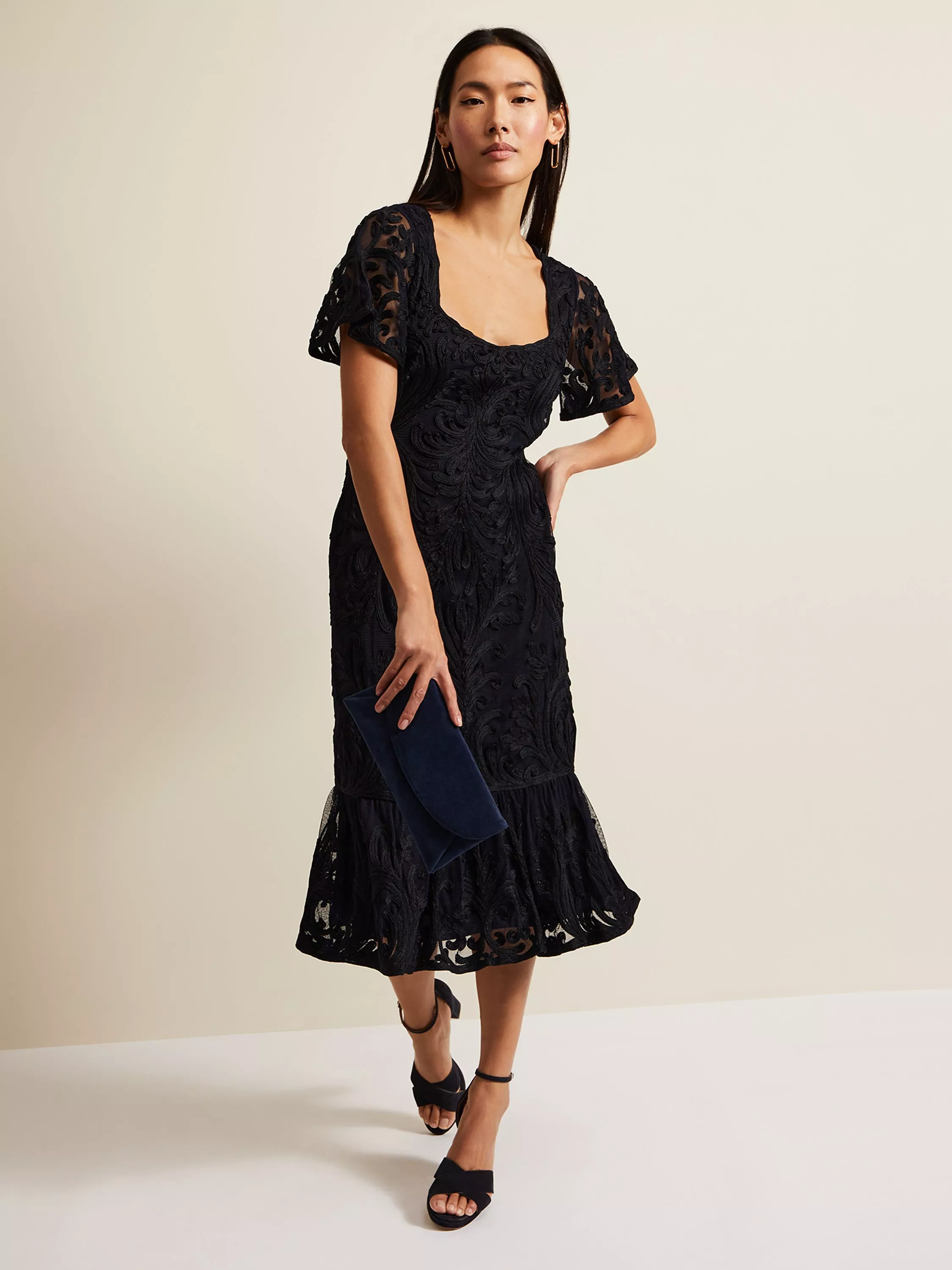 The perfect style for your next event. Designed in all-over luxe tapework, this midi dress features semi-sheer short sleeves and falls to a fishtail skirt. Style with coordinating heels and a clutch bag.