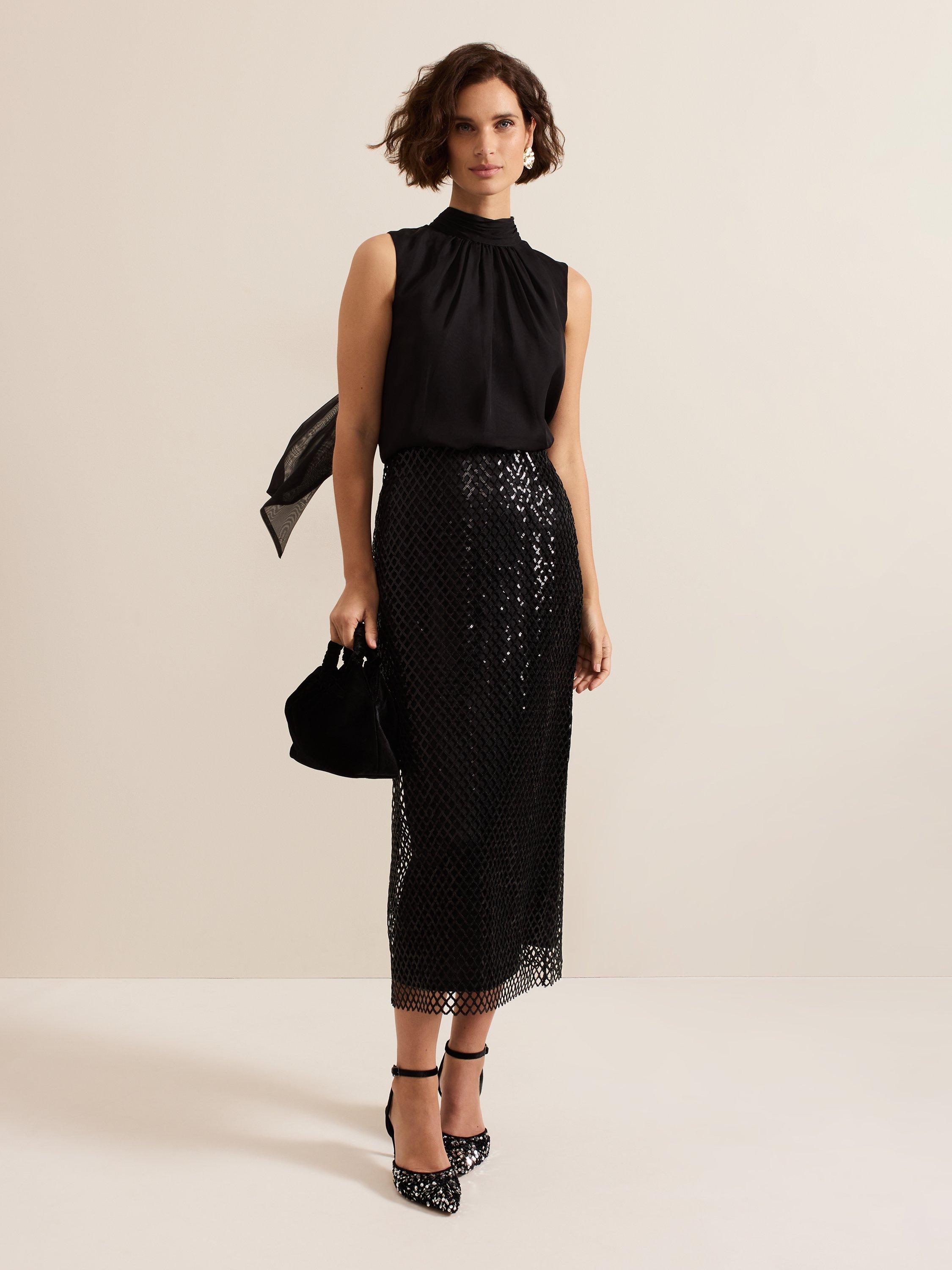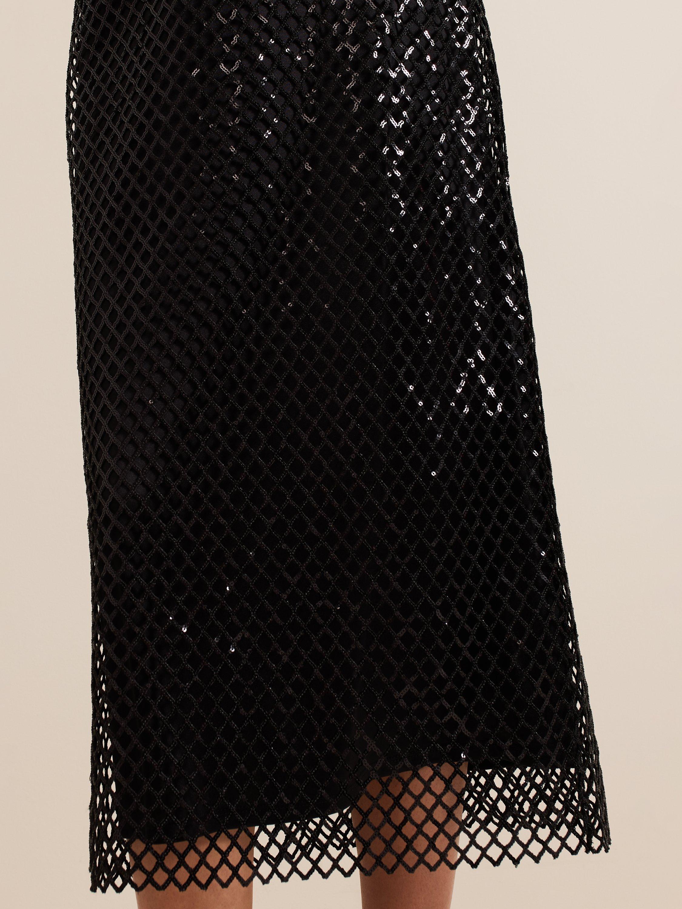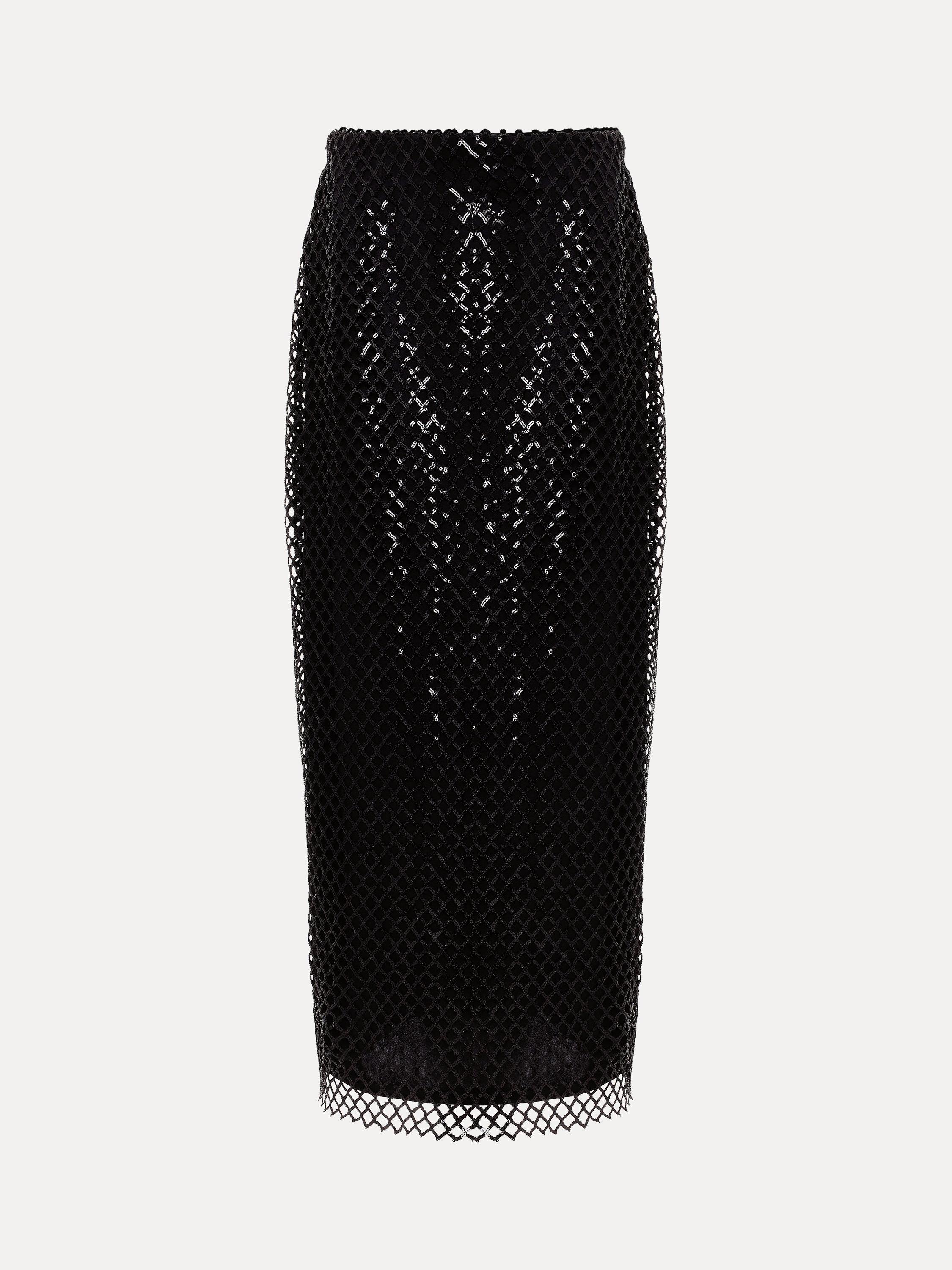 The Mauve midi skirt skims the body and falls to a column silhouette. The mesh sequin overlay comes alive in motion, making it the perfect glamorous style for a night of dancing.