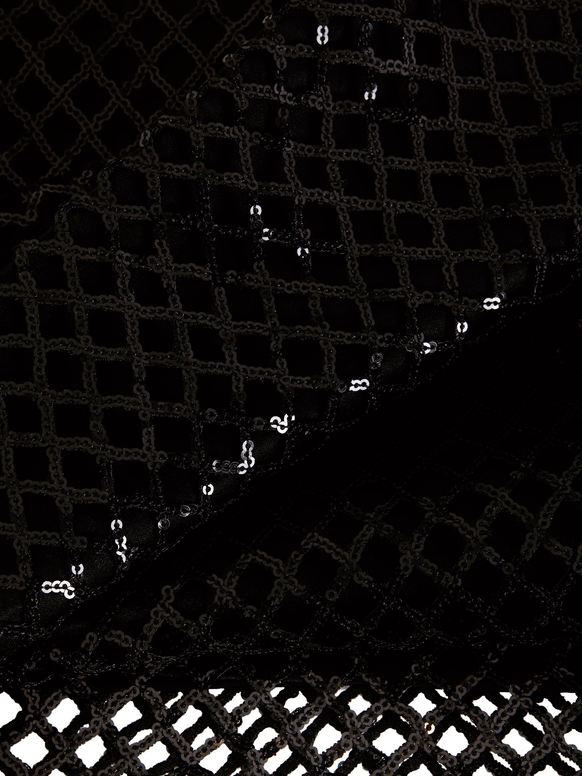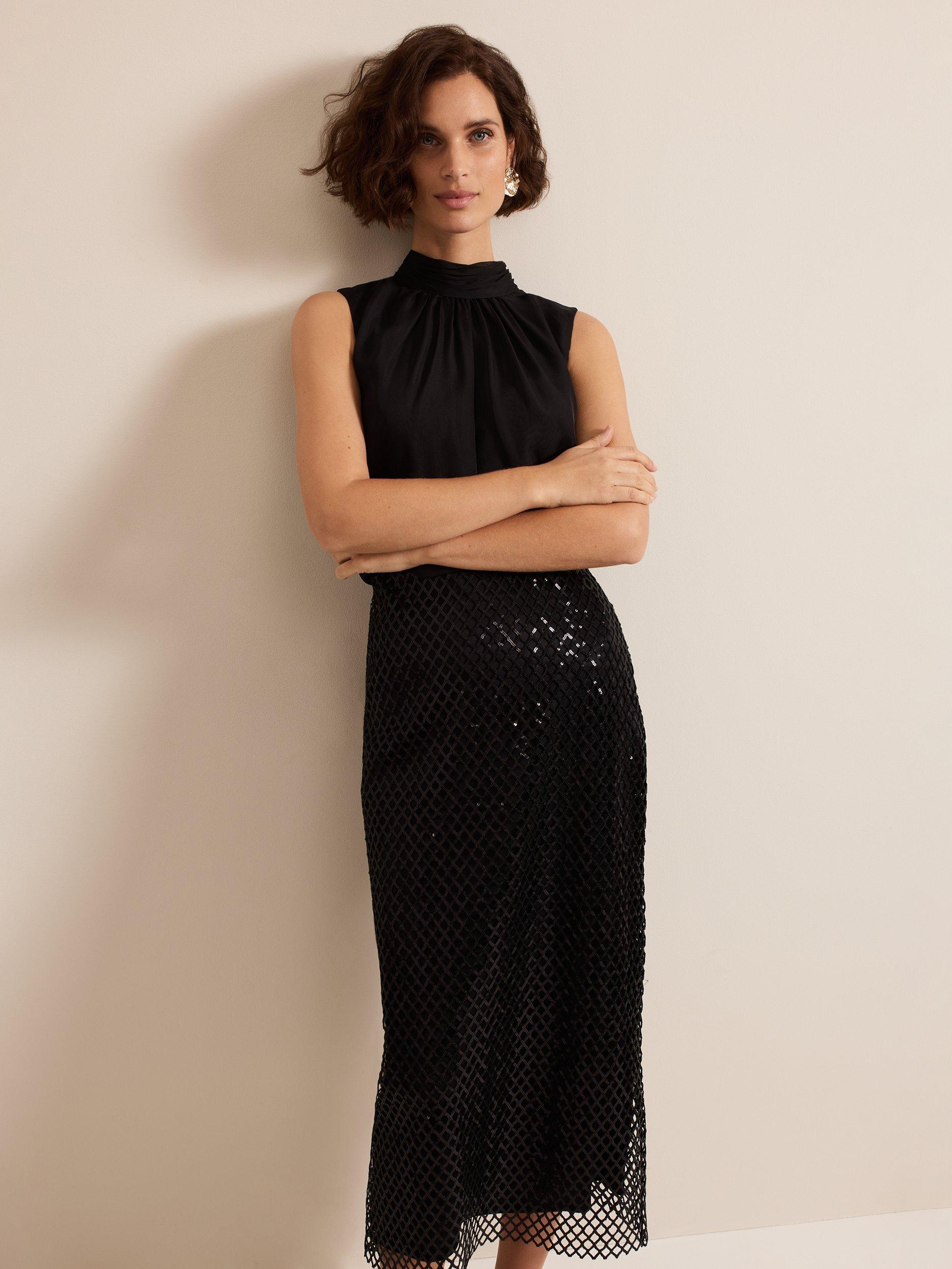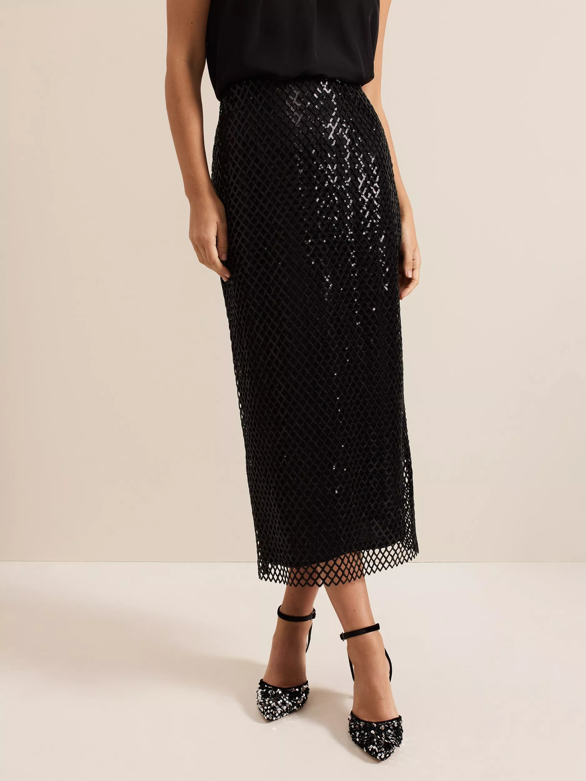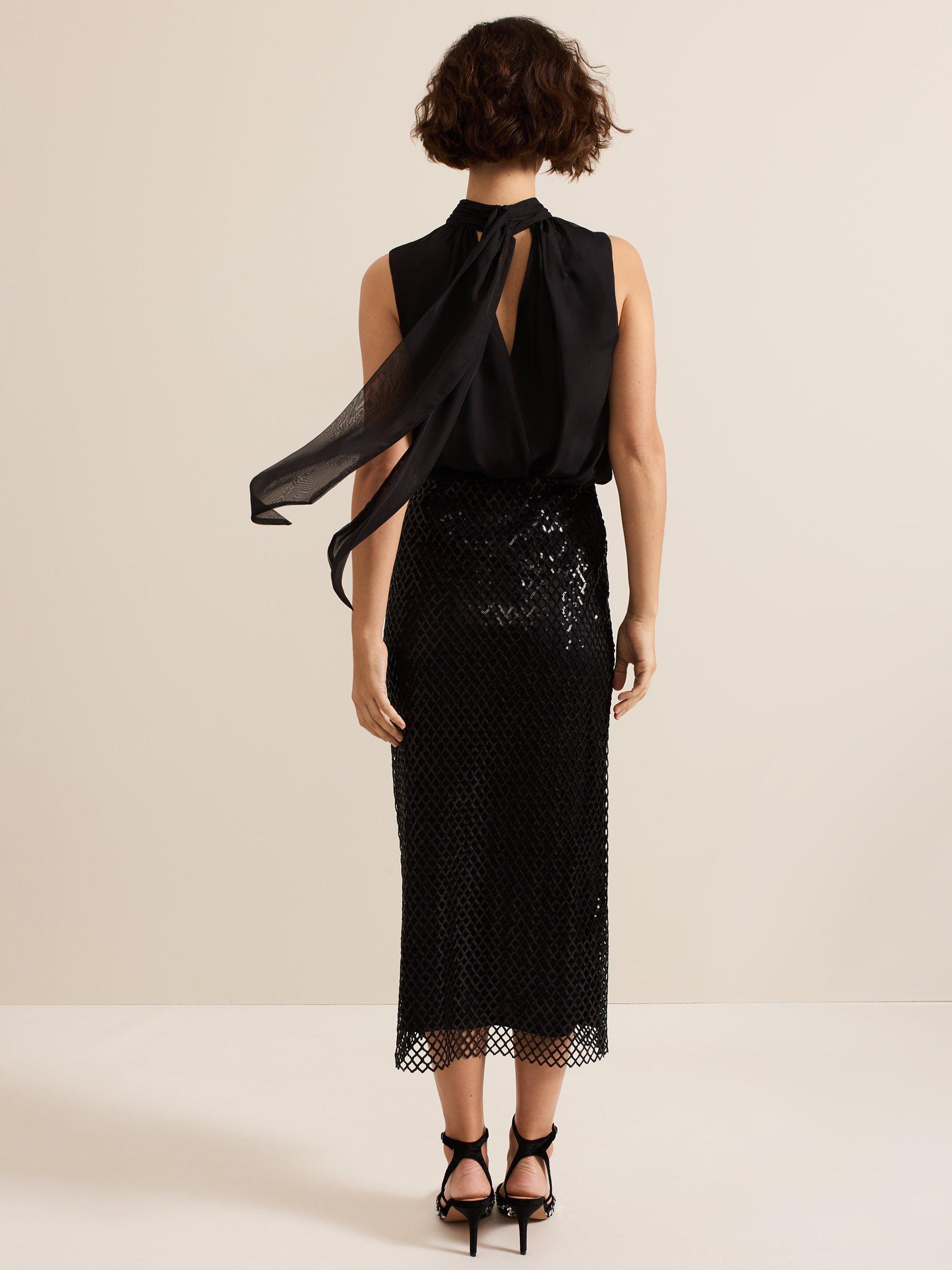 The Mauve midi skirt skims the body and falls to a column silhouette. The mesh sequin overlay comes alive in motion, making it the perfect glamorous style for a night of dancing.