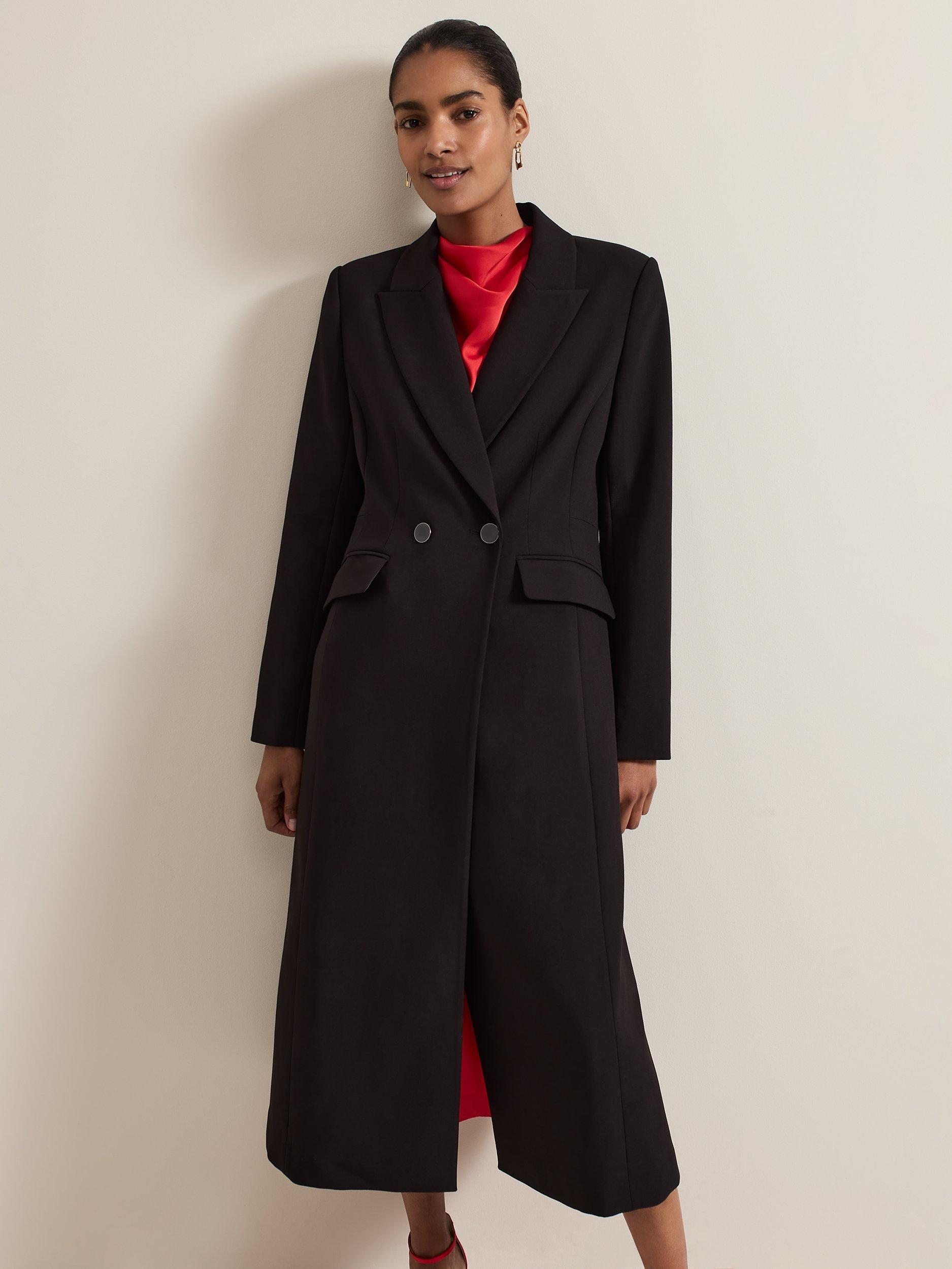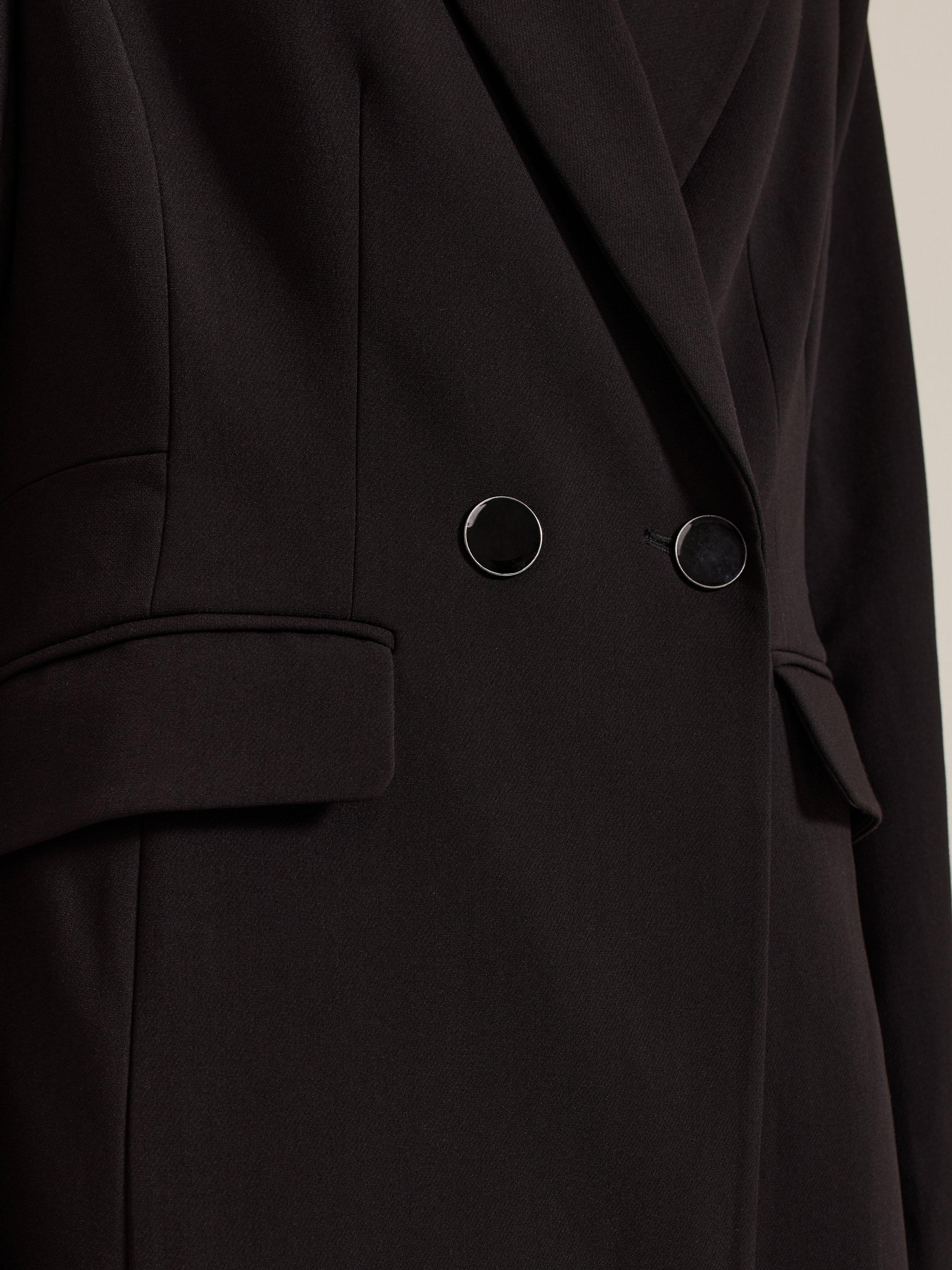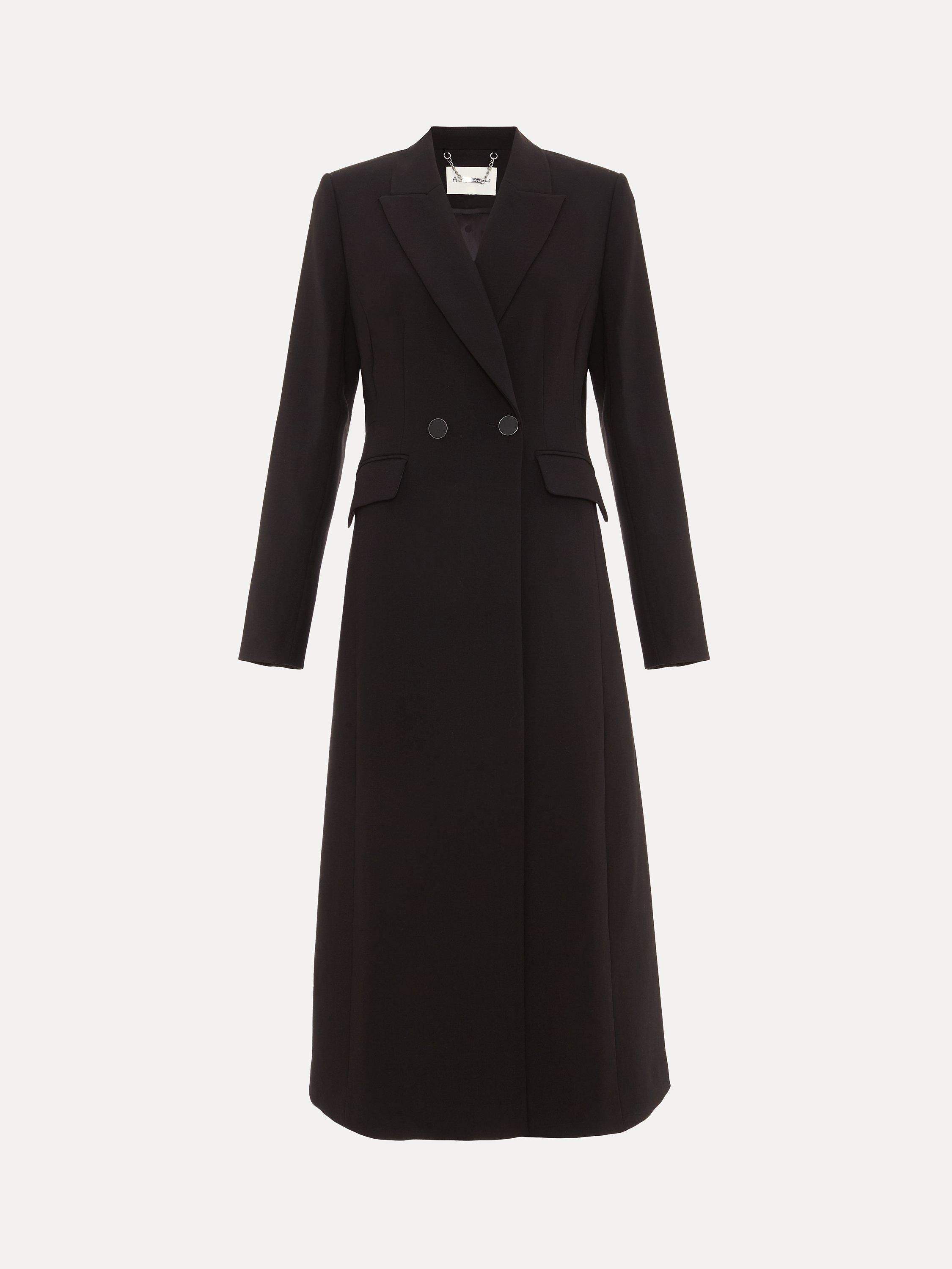 The Maya coat is casual elegance. This double breasted coat features flap pockets, a classic back vent and black statement buttons with gold detailing. The waist is shaped for a streamlined fit and falls to a maxi length, perfect to pair with your favourite long dresses.