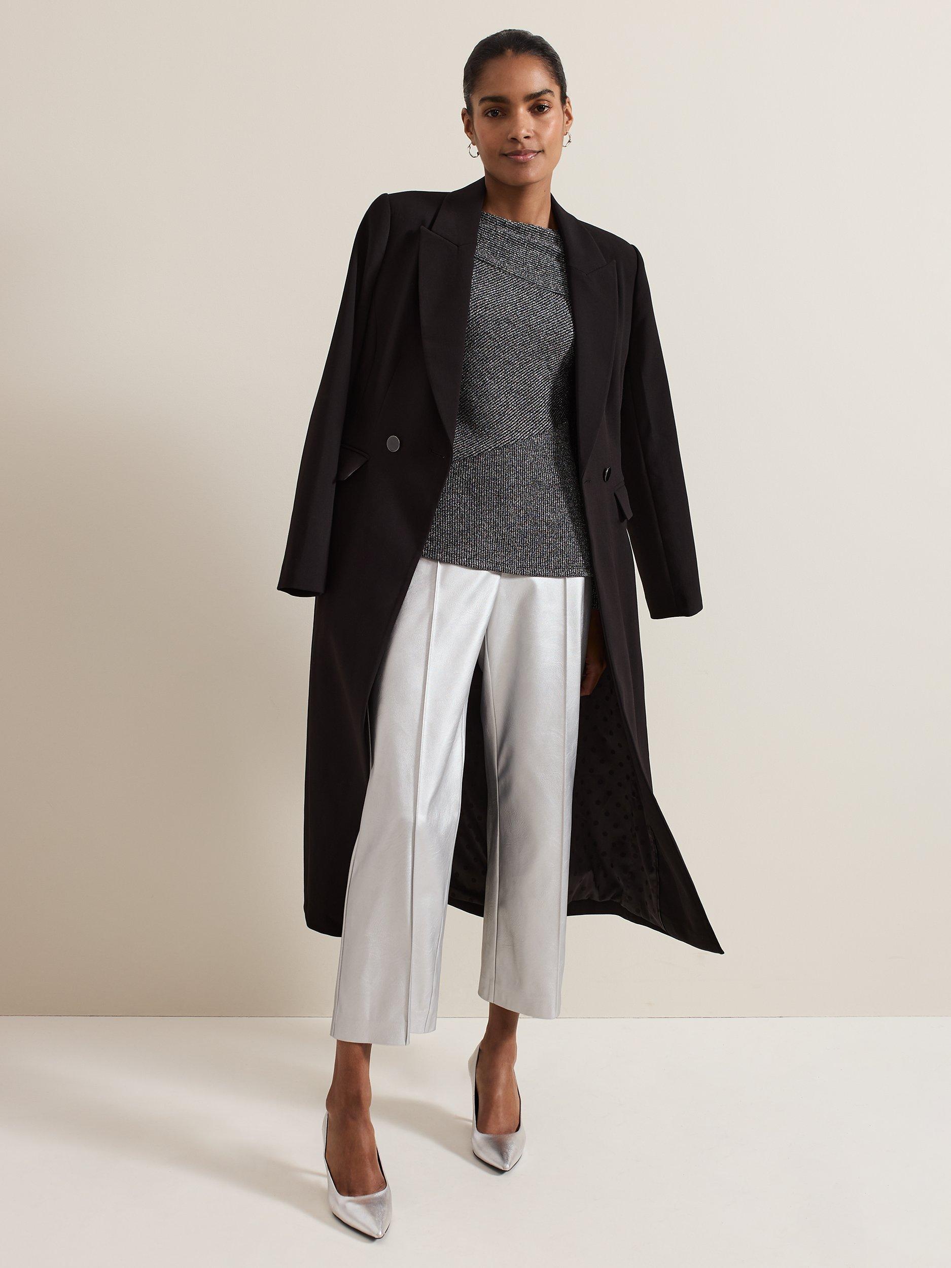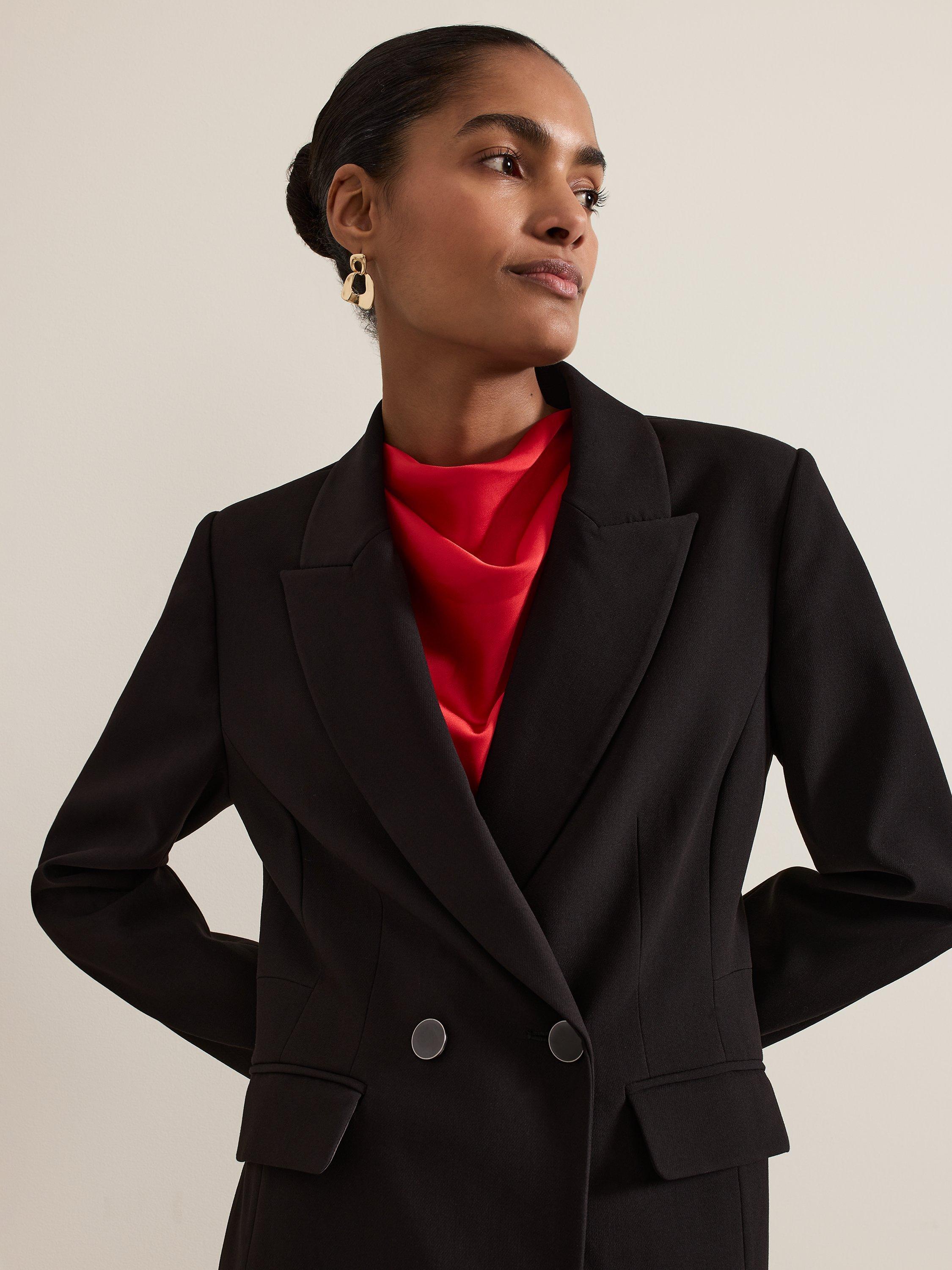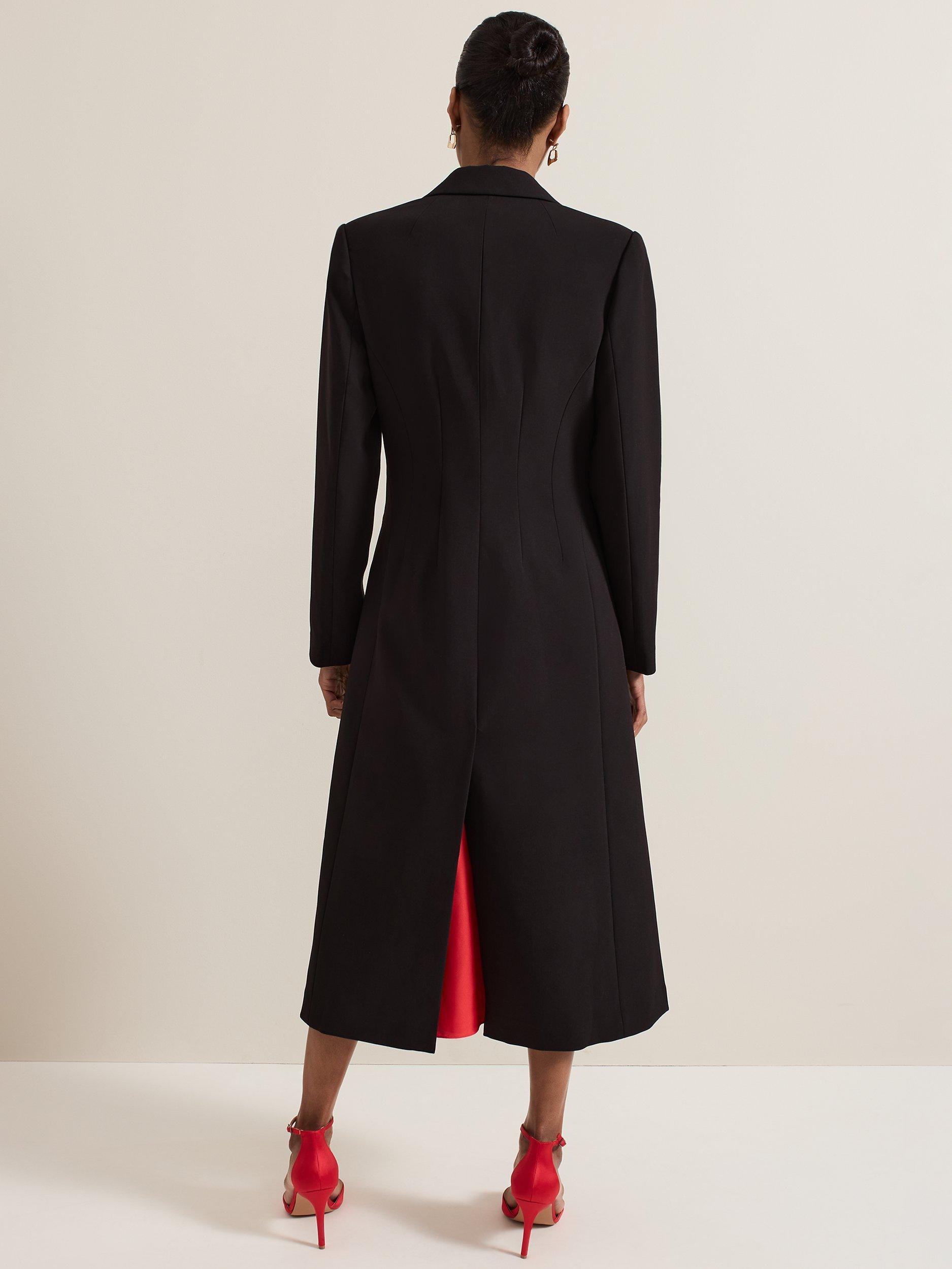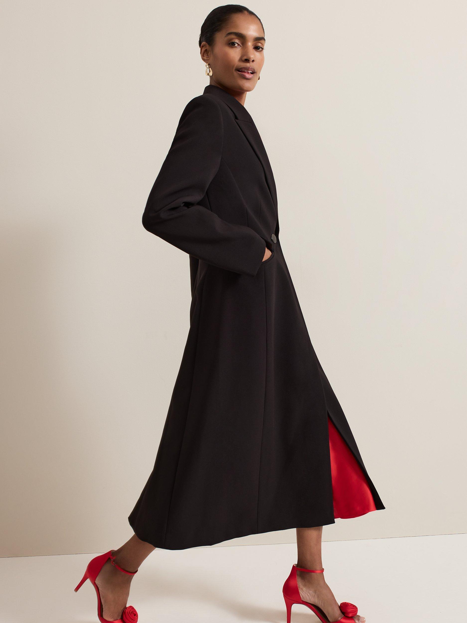 The Maya coat is casual elegance. This double breasted coat features flap pockets, a classic back vent and black statement buttons with gold detailing. The waist is shaped for a streamlined fit and falls to a maxi length, perfect to pair with your favourite long dresses.