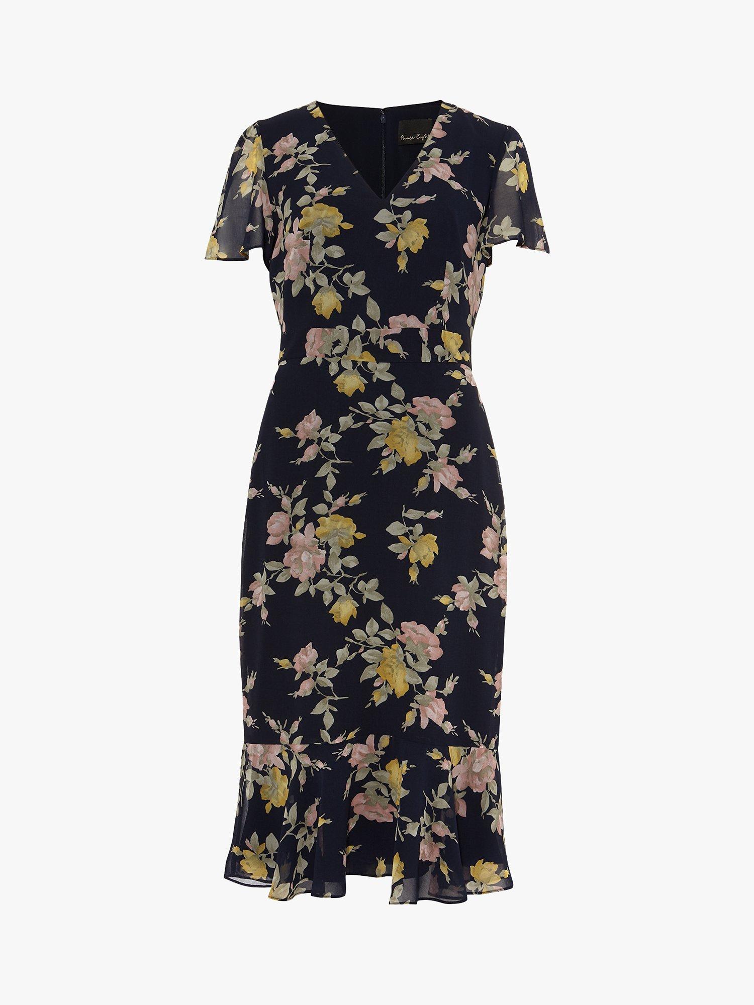 An elegant tea dress that will be perfect for garden parties and special occasions. Crafted from soft chiffon and printed with expressive florals throughout, this style is designed with semi-sheer flared sleeves and a playful peplum hem.