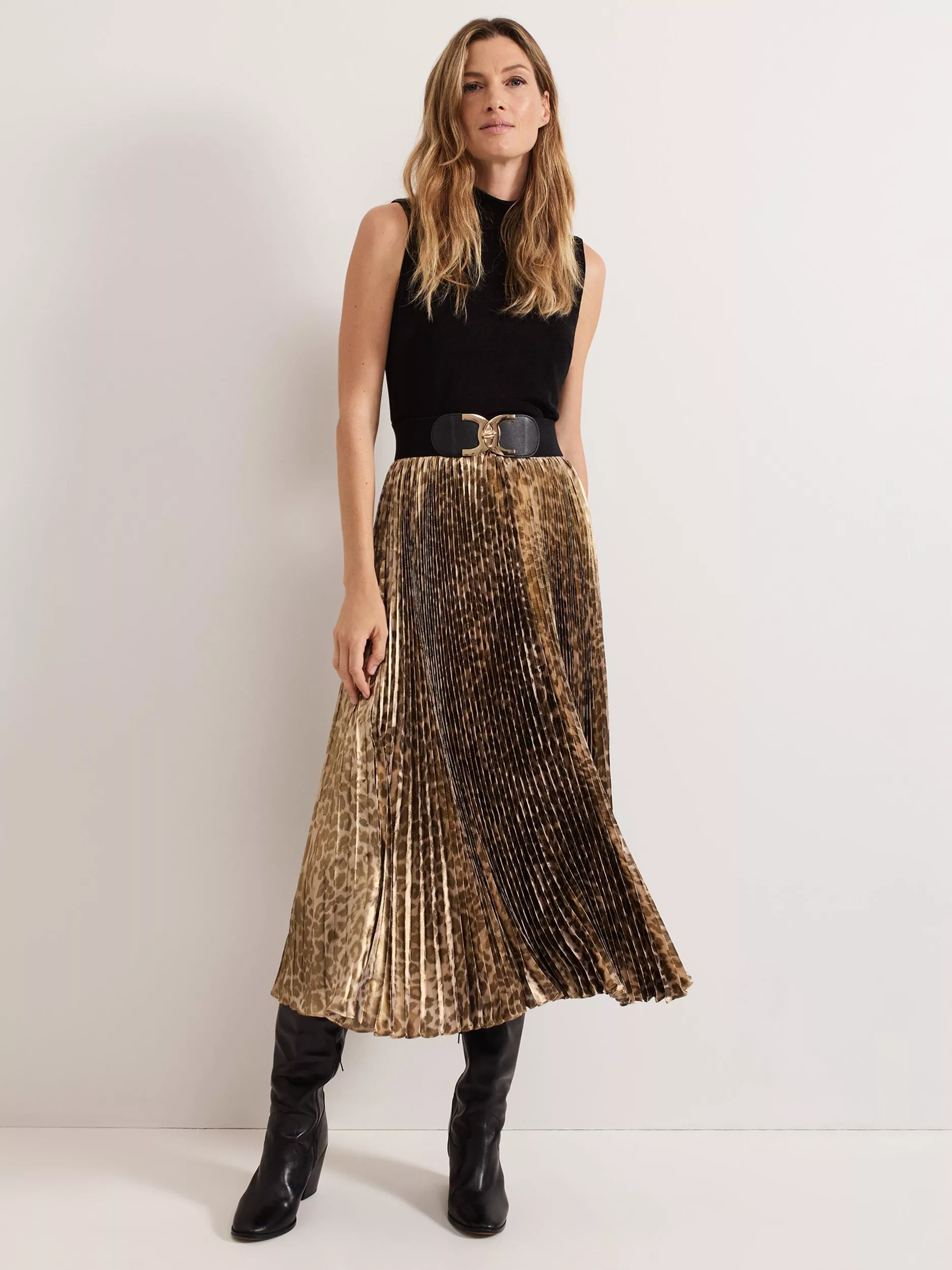 Leopard print is always on trend and the Meloni dress is no exception. Designed with a sleeveless top and elasticated belt with a statement buckle, this dress flares into a midi length fully pleated leopard print skirt and fastens with a zip at the back.