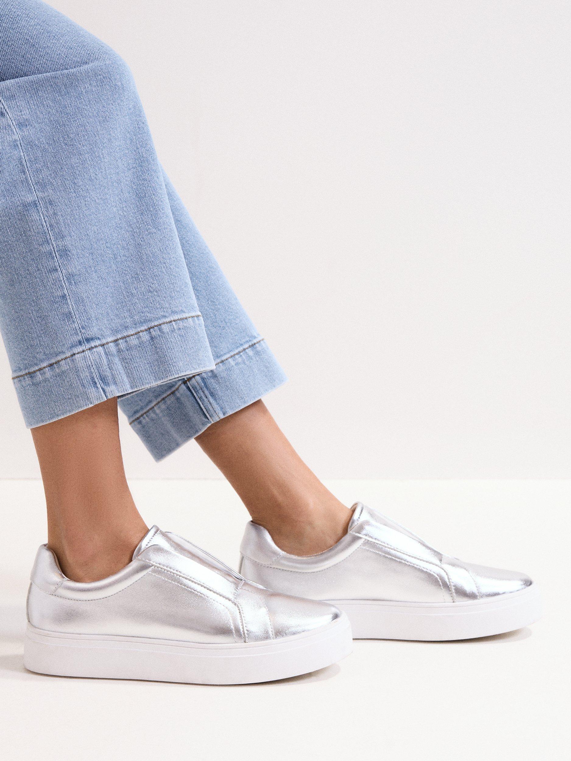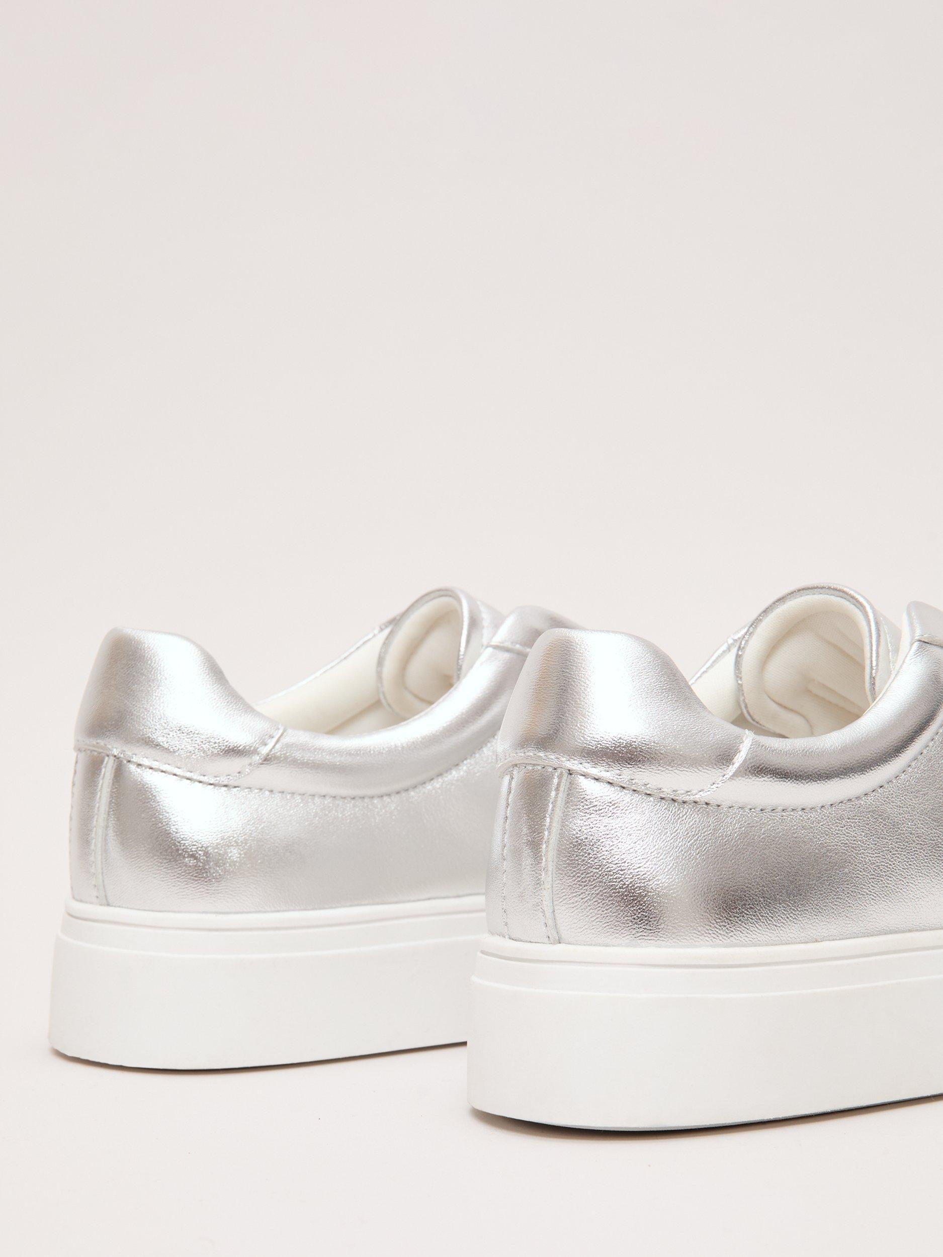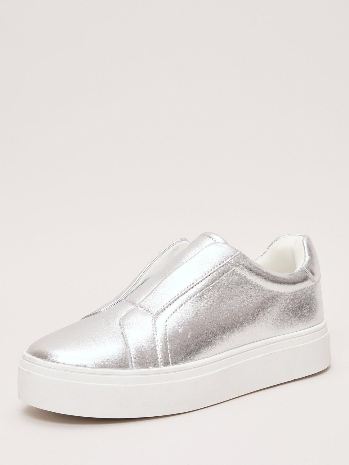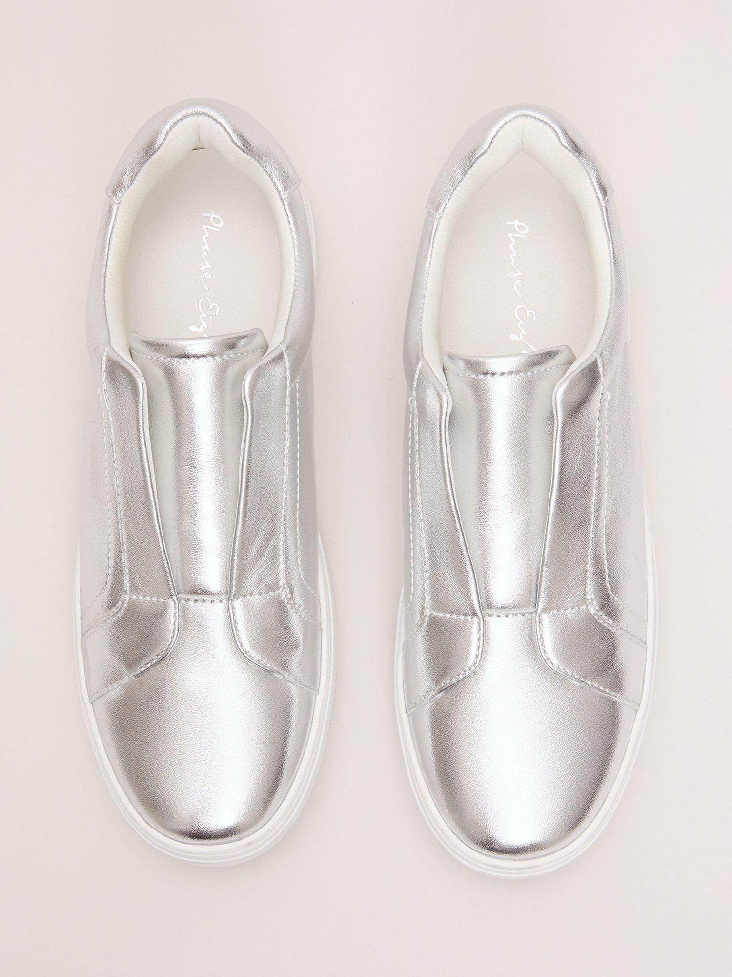A pair of metallic trainers by Phase Eight, crafted with supple leather uppers and a modern flatform sole. The closed toe and slip-on design offer comfort and ease, making them a bold choice for relaxed summer days or city strolls.
