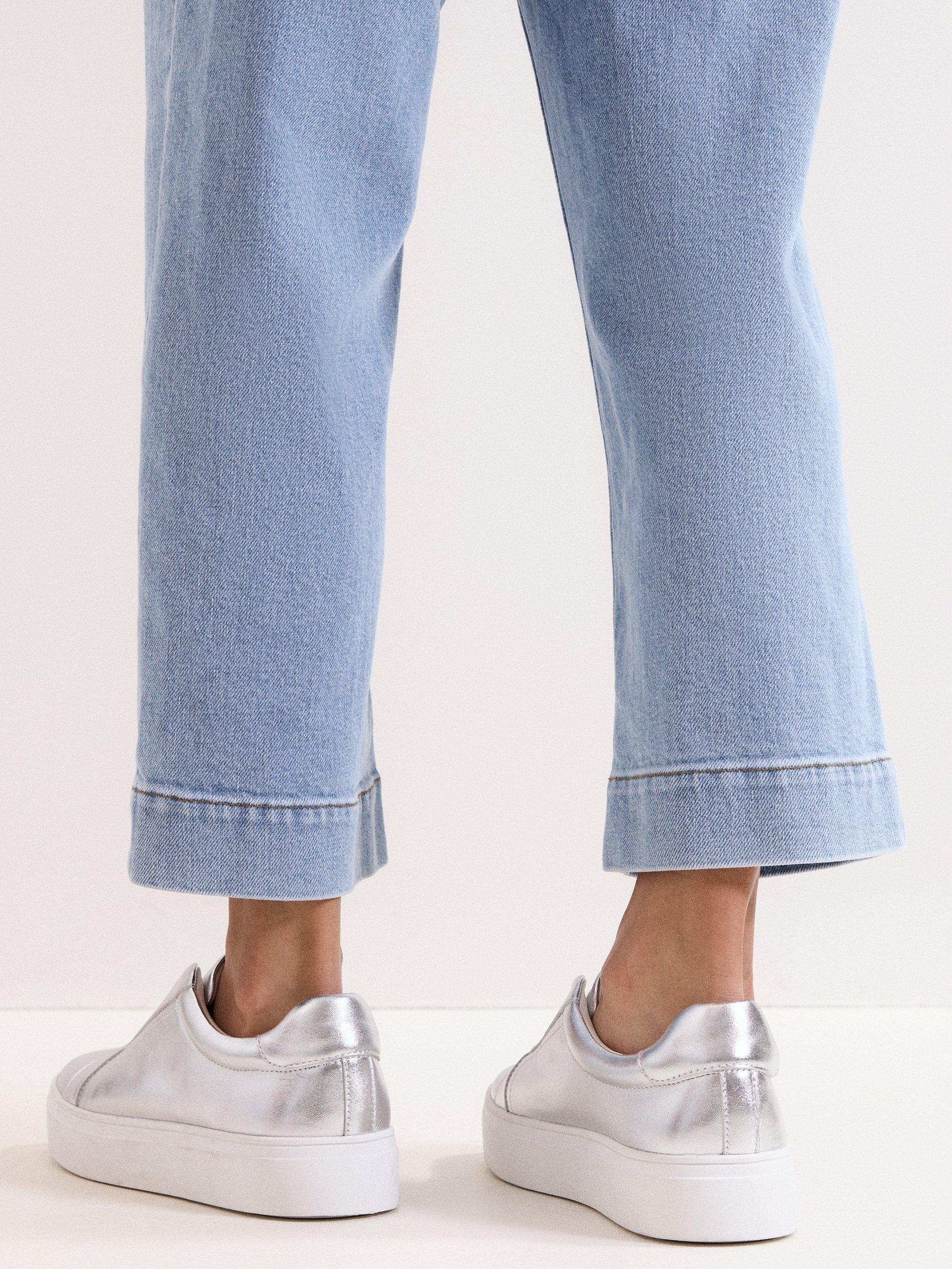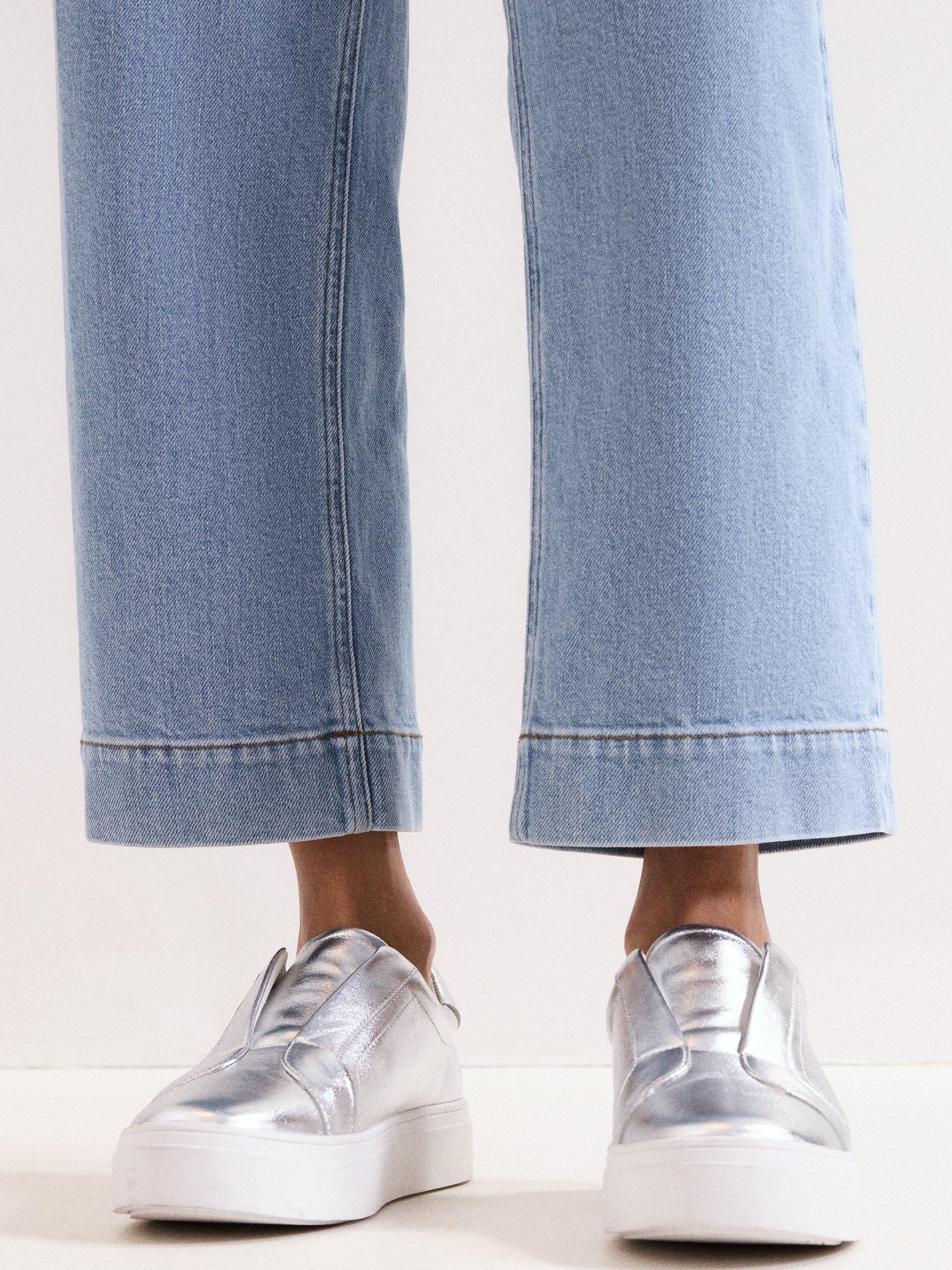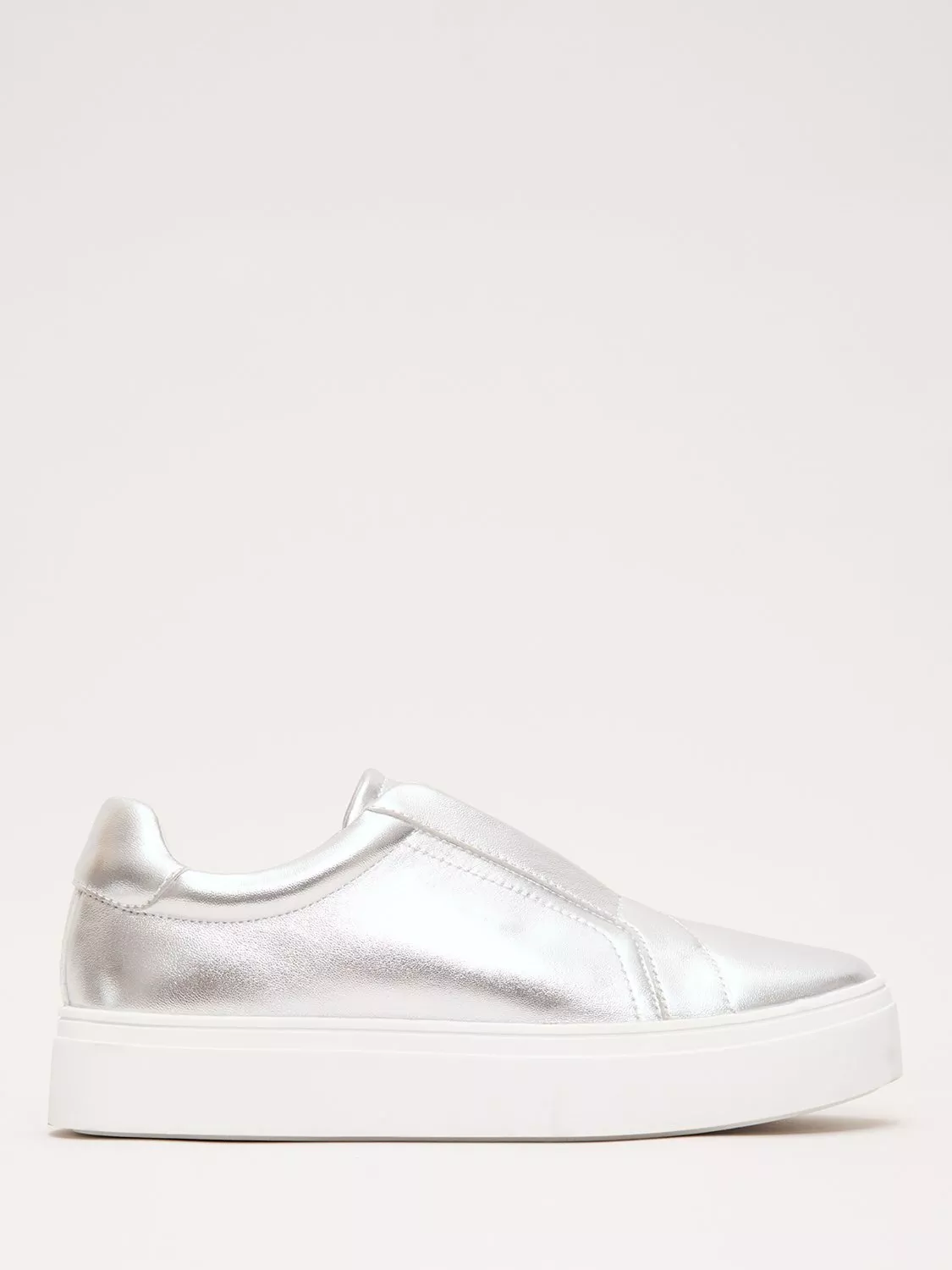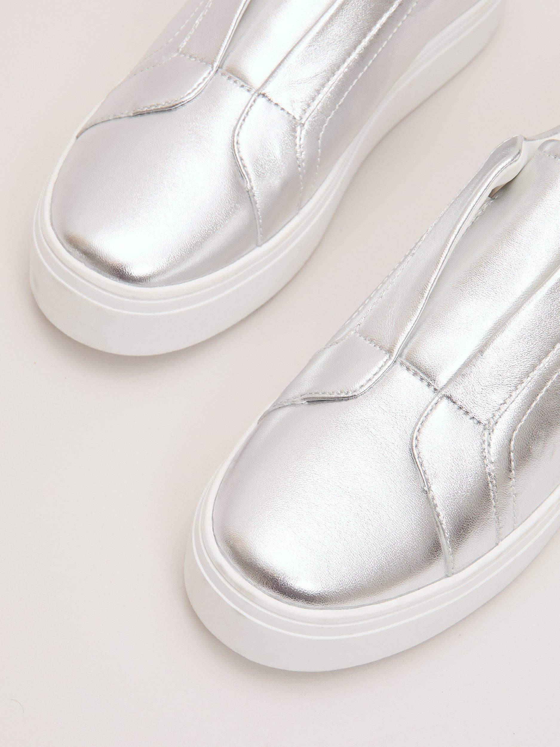 A pair of metallic trainers by Phase Eight, crafted with supple leather uppers and a modern flatform sole. The closed toe and slip-on design offer comfort and ease, making them a bold choice for relaxed summer days or city strolls.
