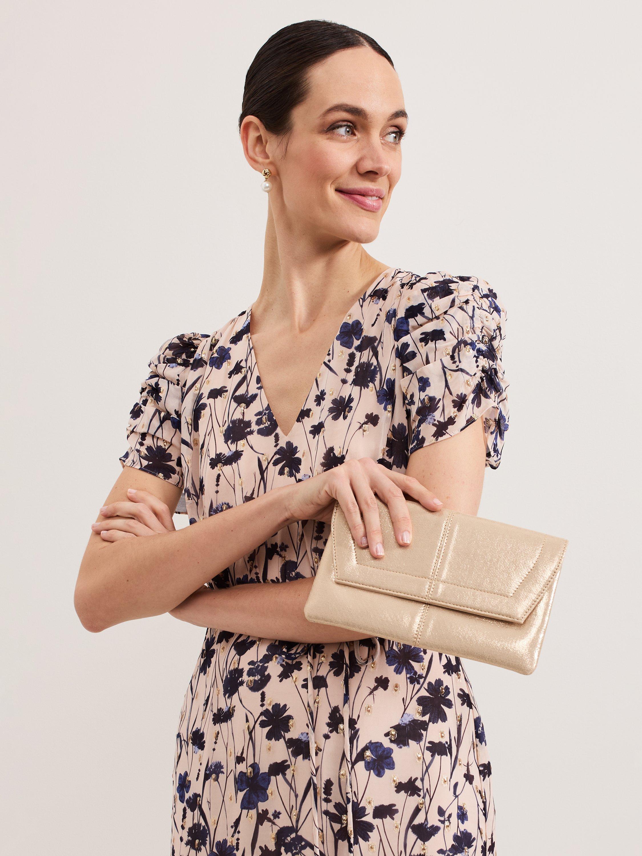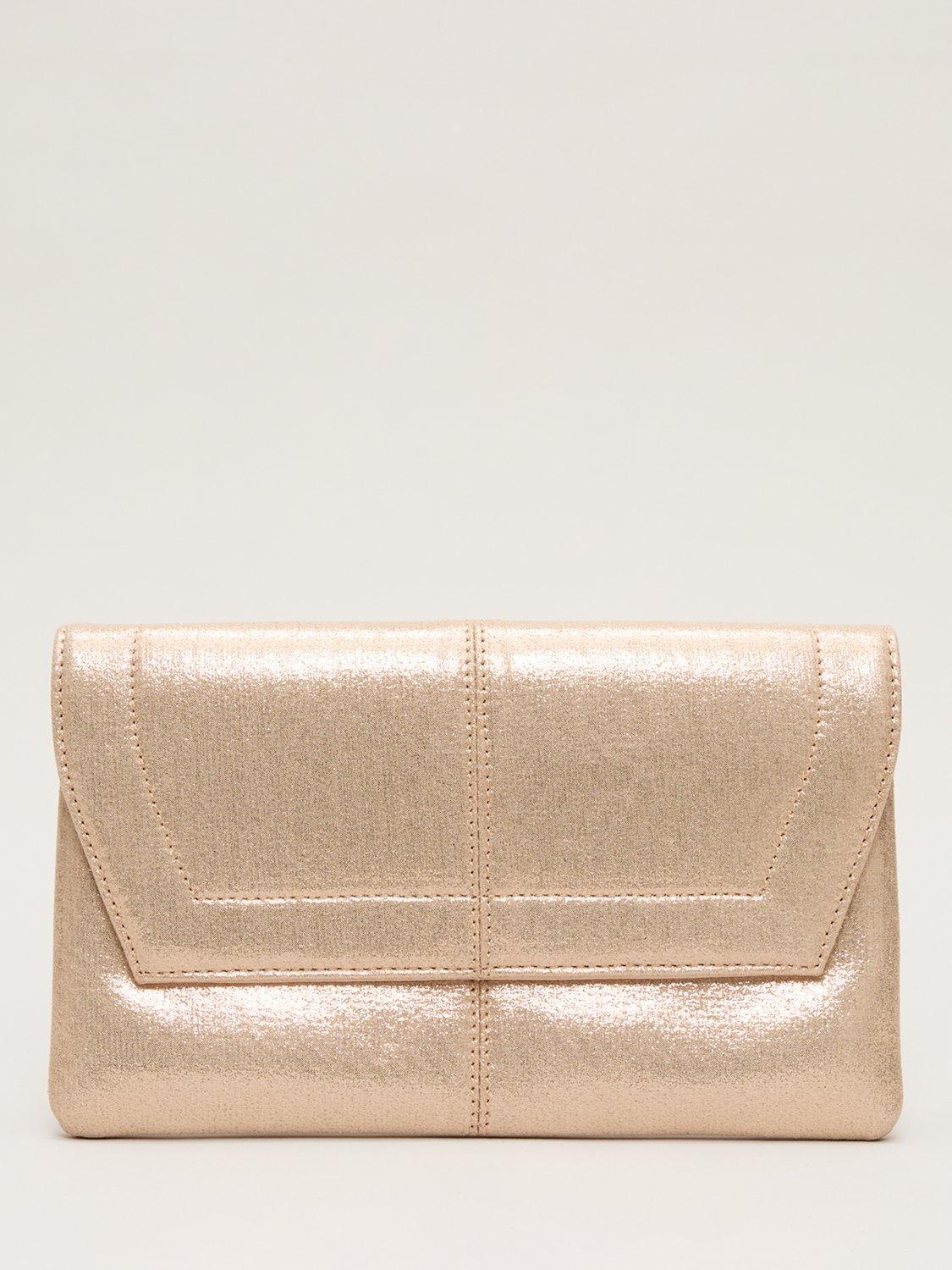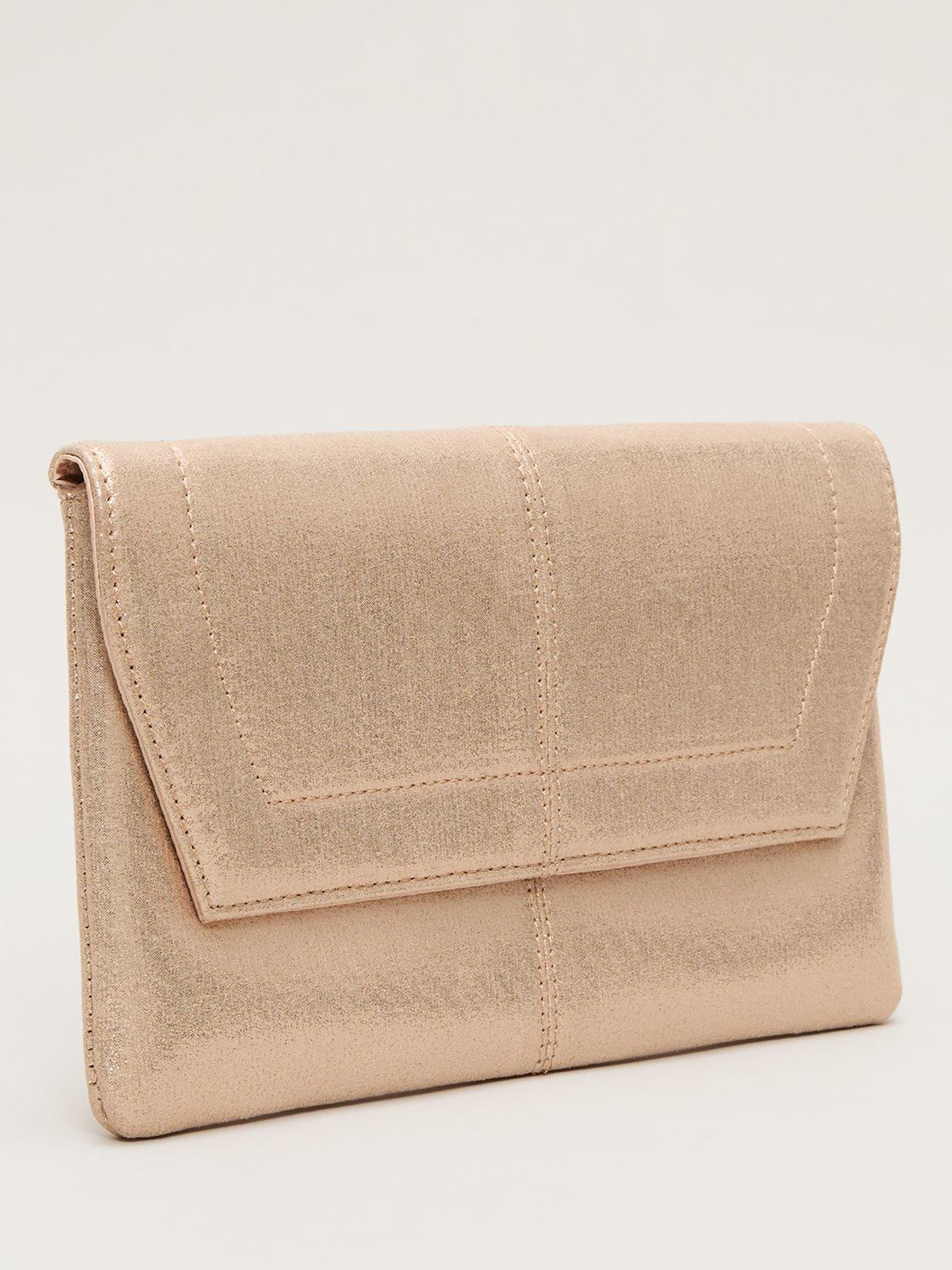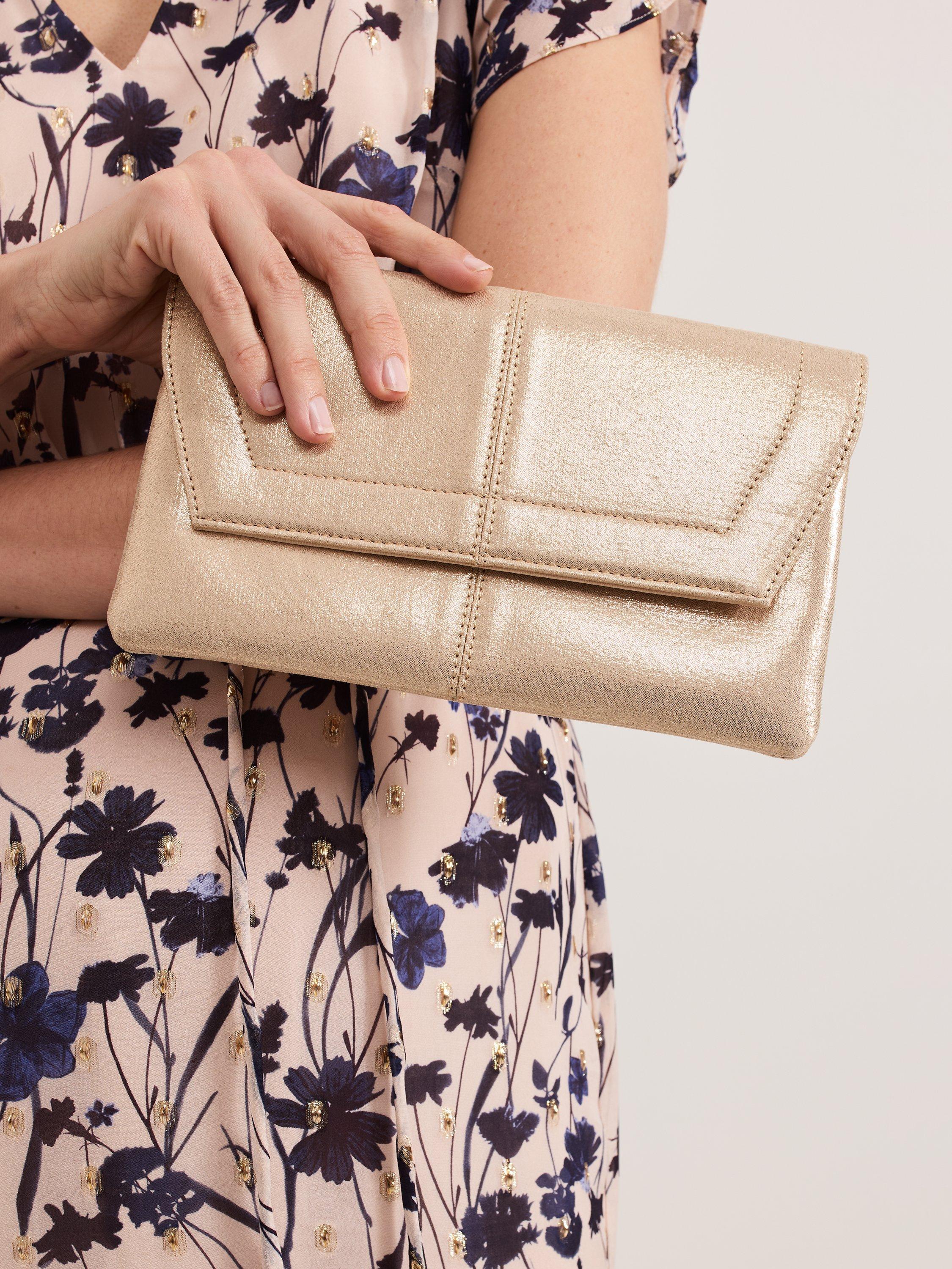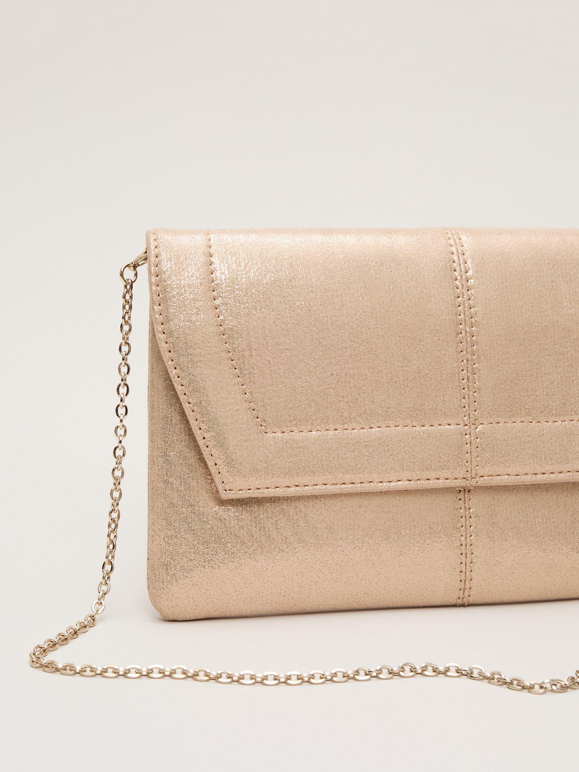 The perfect finishing touch for your next event. In a metallic shade, this bag features exposed stitch detailing, finished with a luxurious satin lining and delicate chain versatile styling. Pair with matching heels for a standout occasion look.