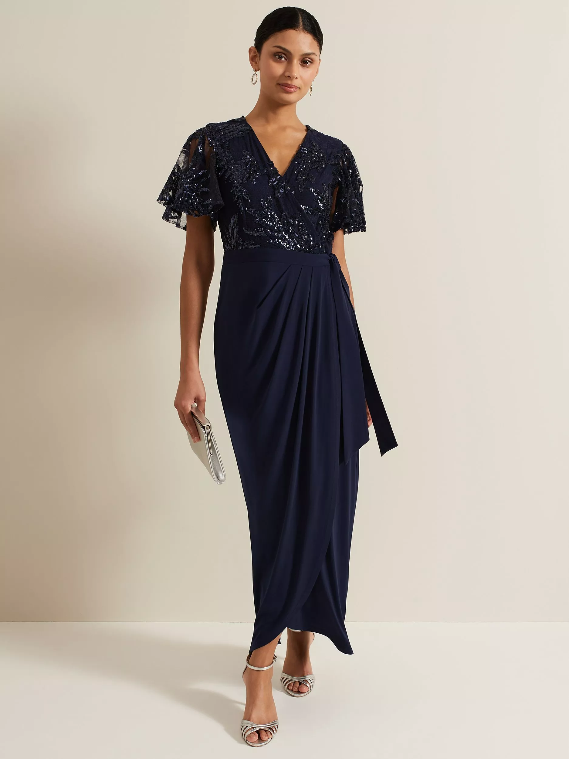 Offered in a feminine, wrap cut, this maxi dress from Phase Eight is made using a blend of fabrics. A feminine choice thanks to the wrap over neckline and short sleeves, it is strewn with embellishment.