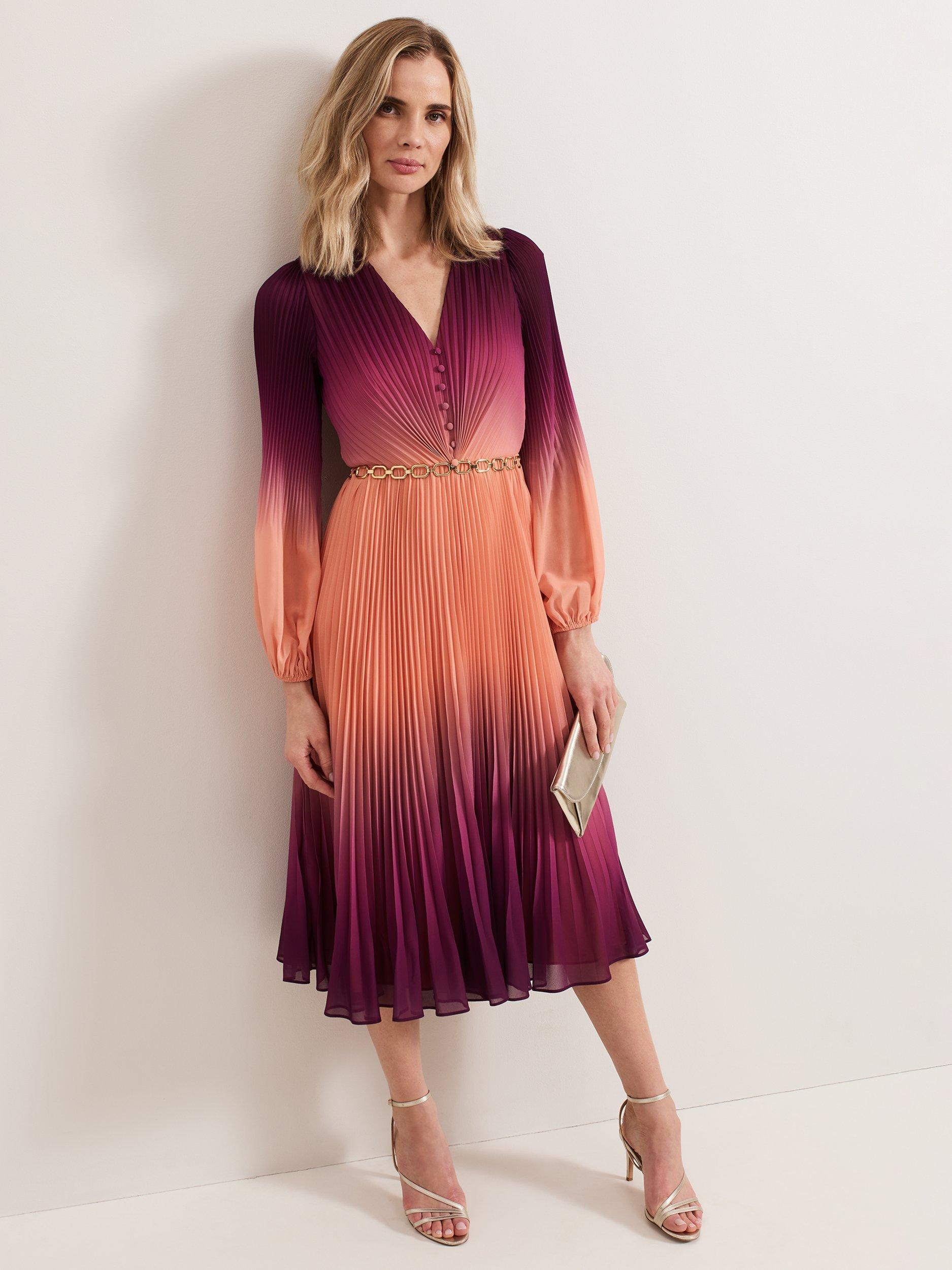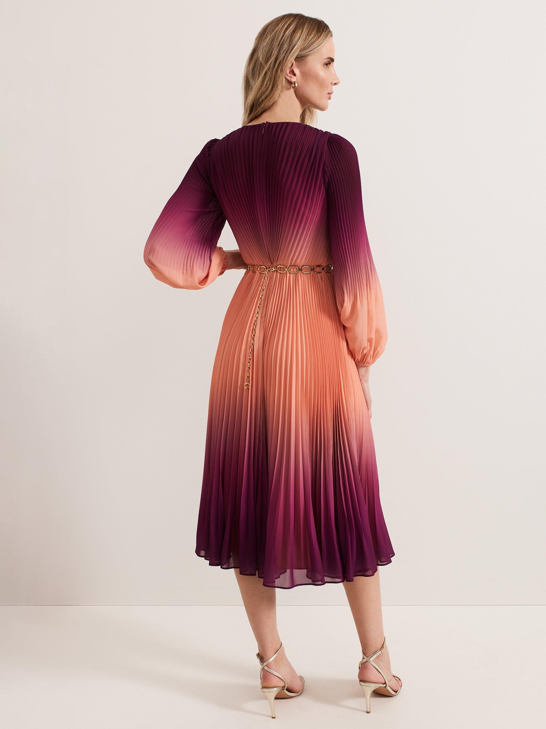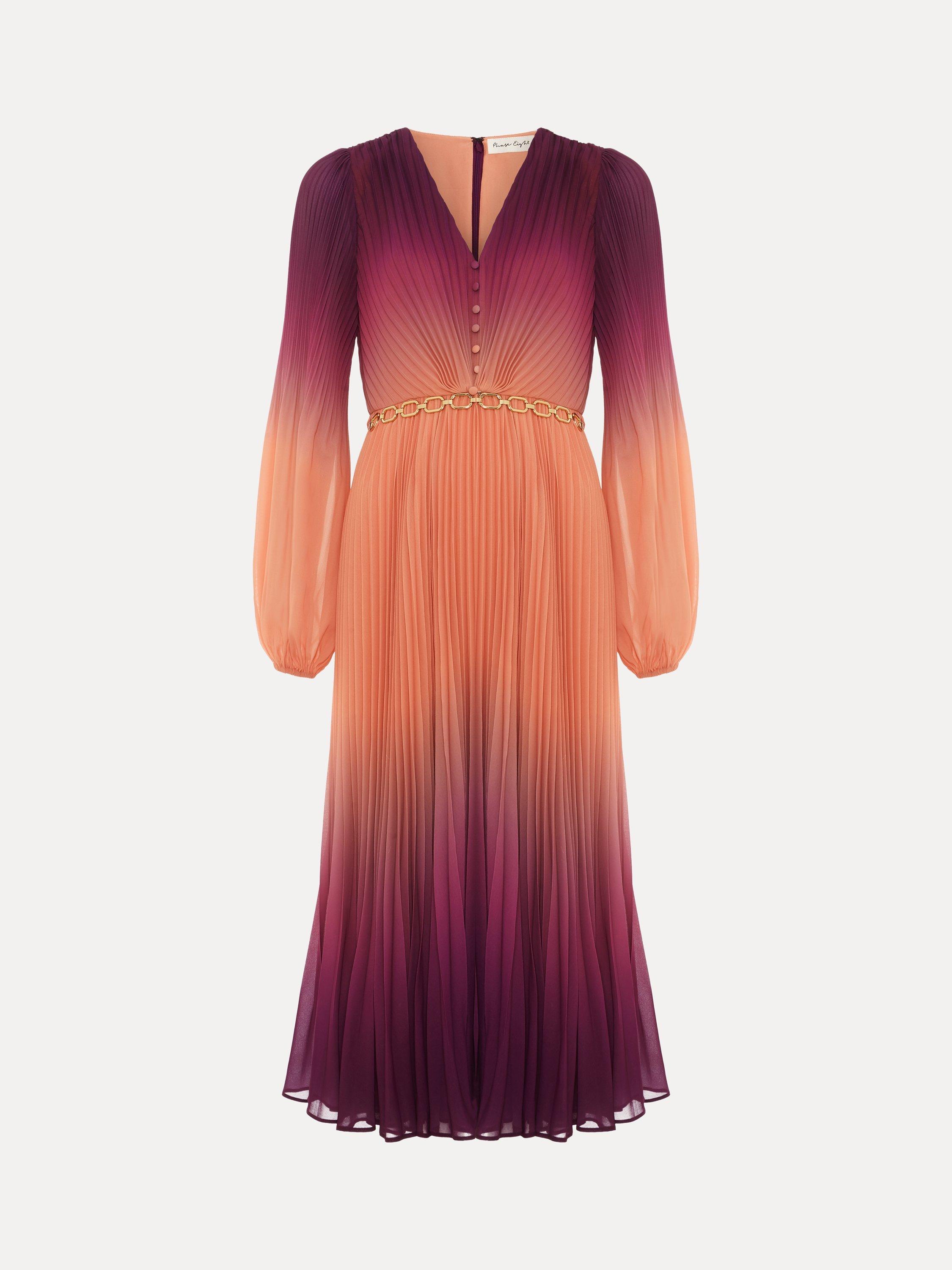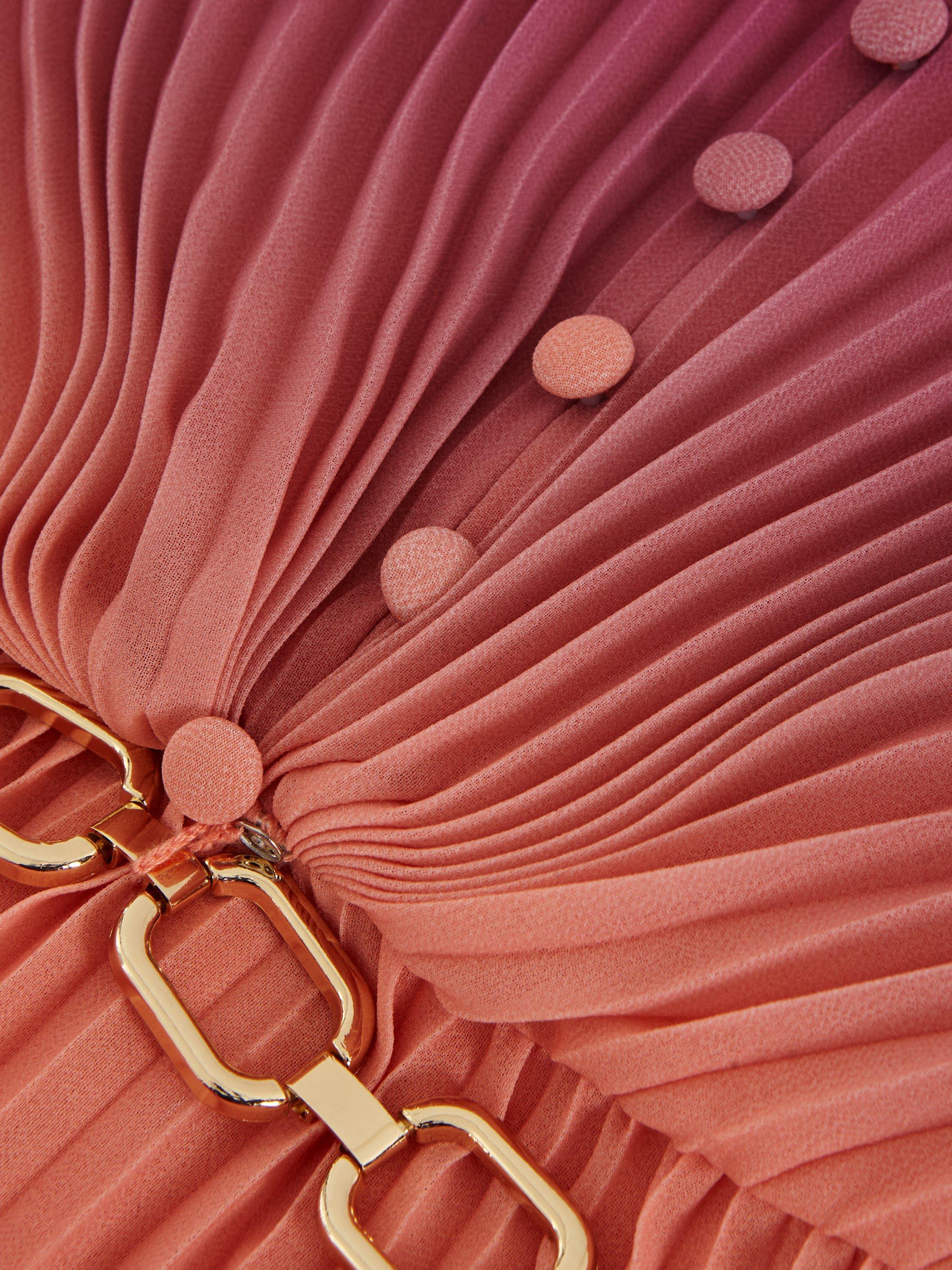 Meet the Mira dress, a standout occasion style that is guaranteed to turn heads. Featuring a striking ombre design, this midi dress is fully pleated throughout for maximum effect and flowing movement. Finished with button-down detailing on the bodice and a contemporary chain belt, it styles effortlessly with matching gold accessories for a coordinated event look.