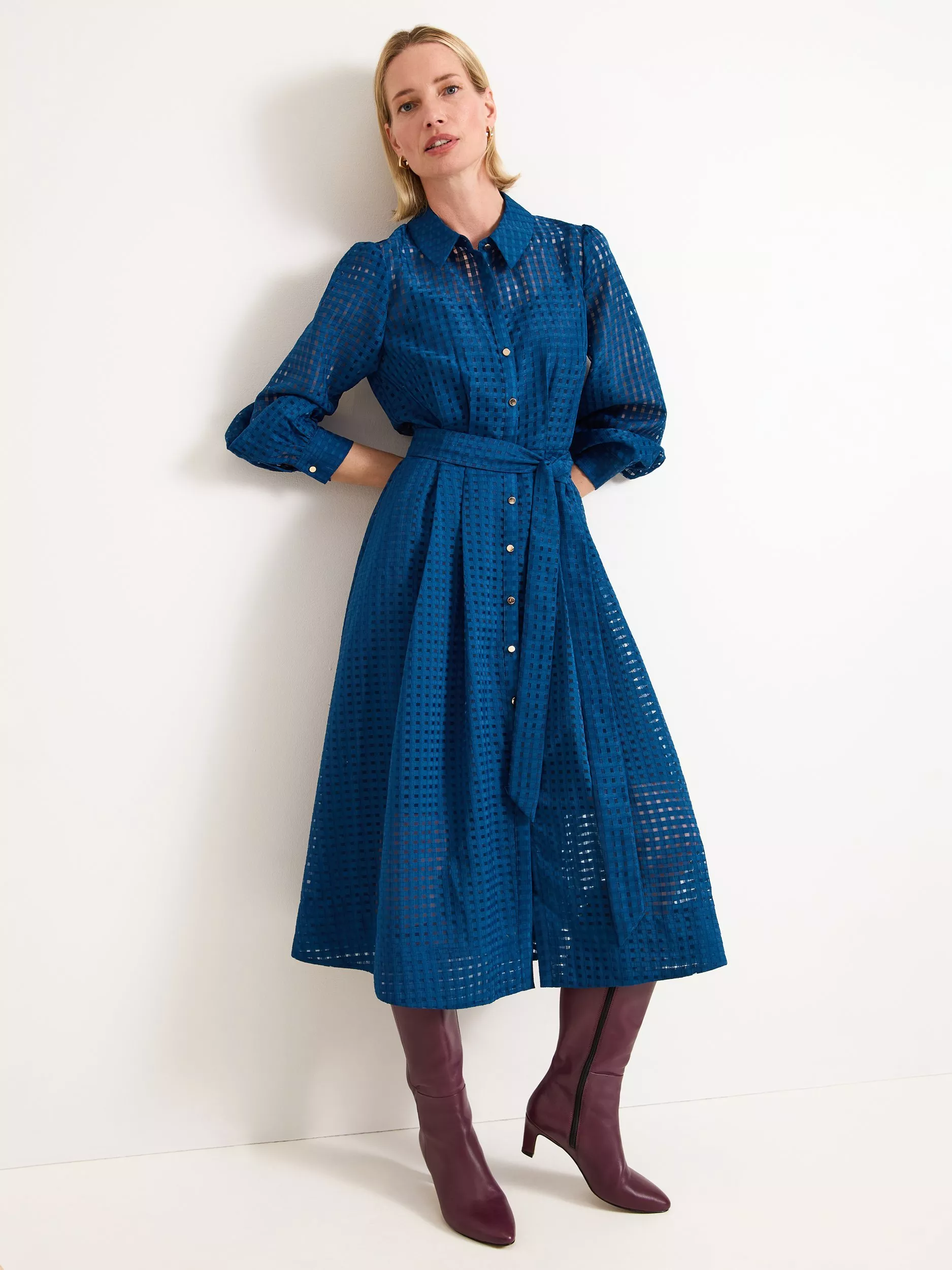 Featuring a unique check texture that infuses a contemporary touch, the timeless shirt silhouette flows to a voluminous midi skirt. Effortlessly versatile, style with your favourite boots or heels for a sophisticated work to weekend style.