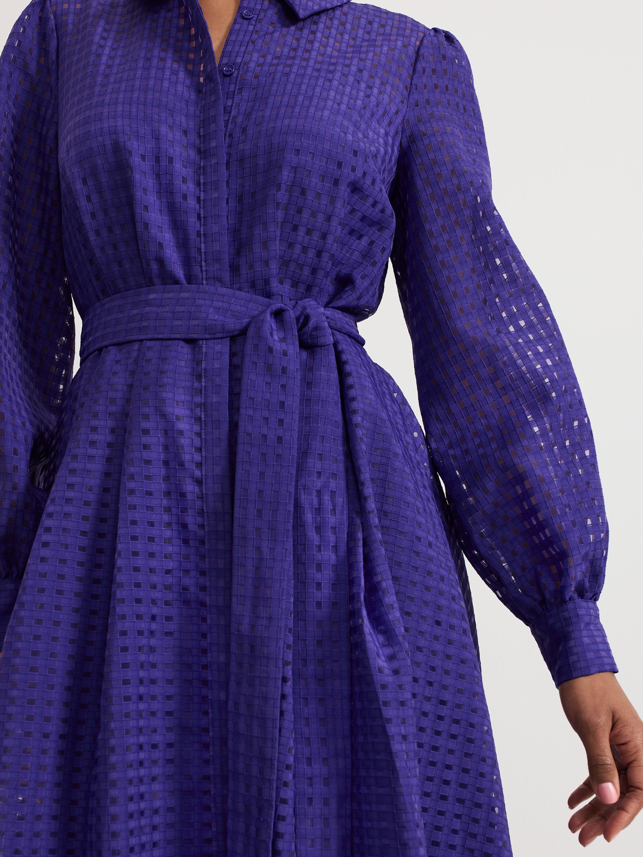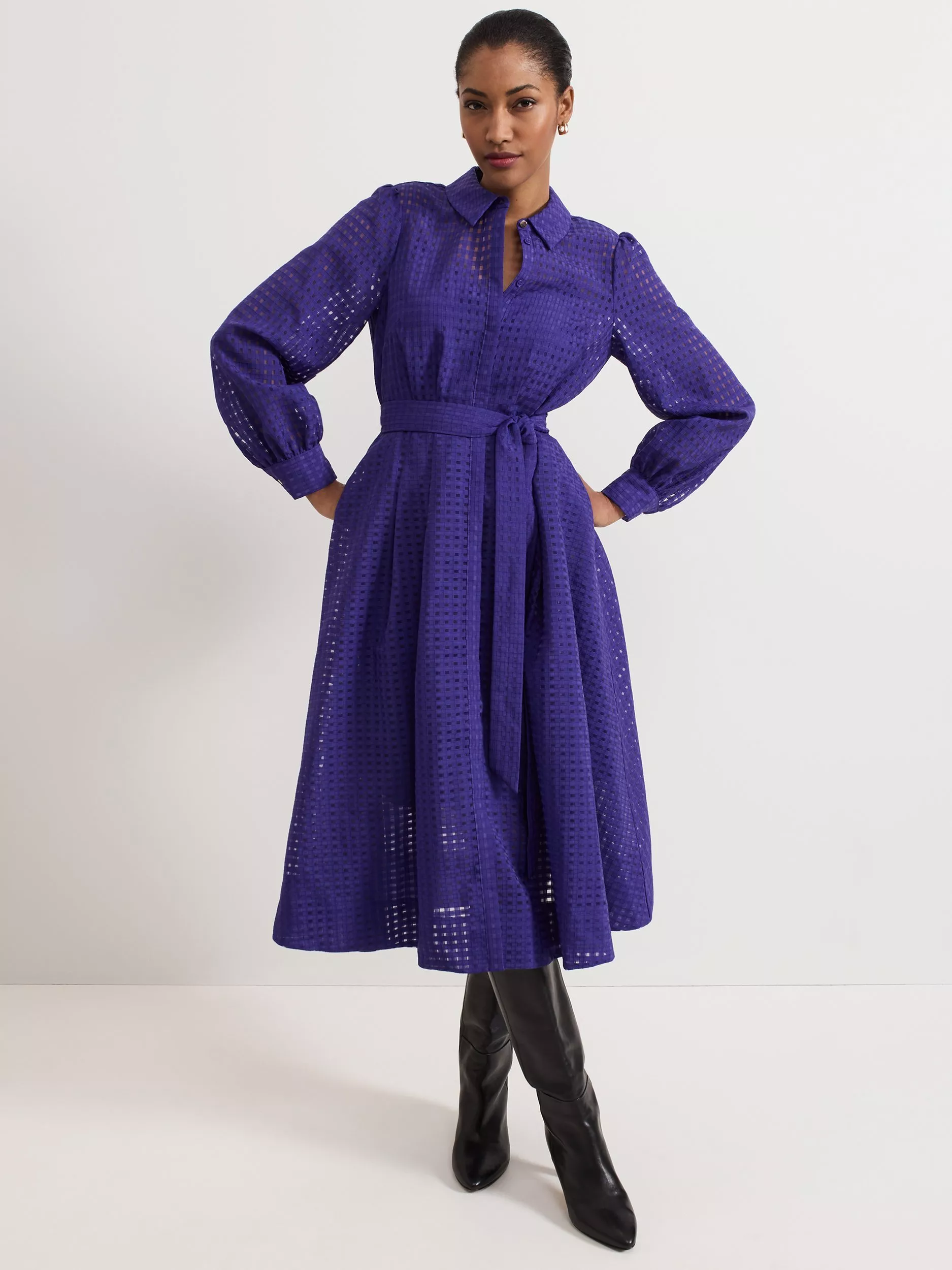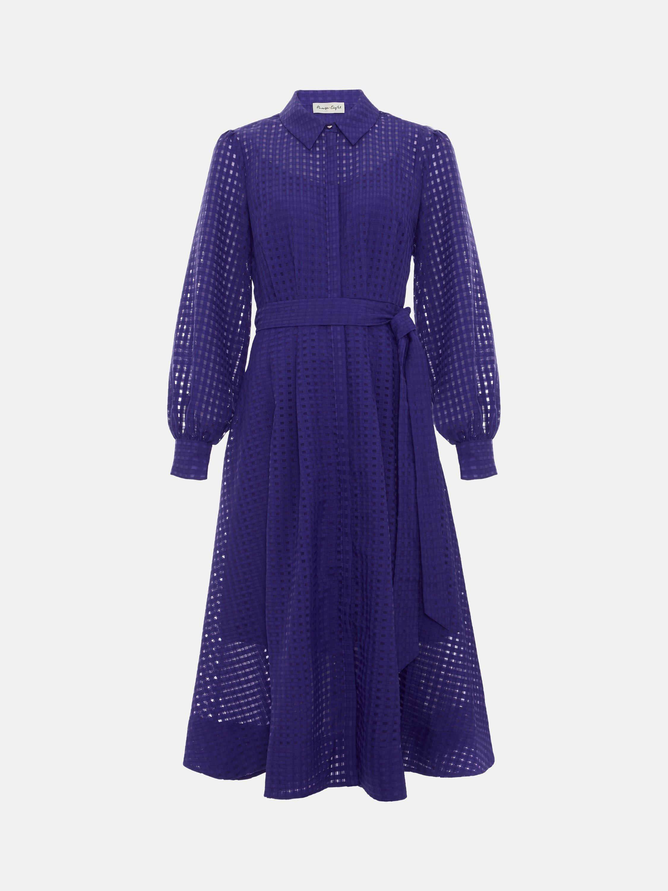 Designed in a classic, shirt style, this mid-length dress from Phase Eight is made from cutout check textured fabric. Featuring a collar neckline, button front and long blouson sleeves with buttoned cuffs, it is complete with a self-tie fabric belt at the waist.