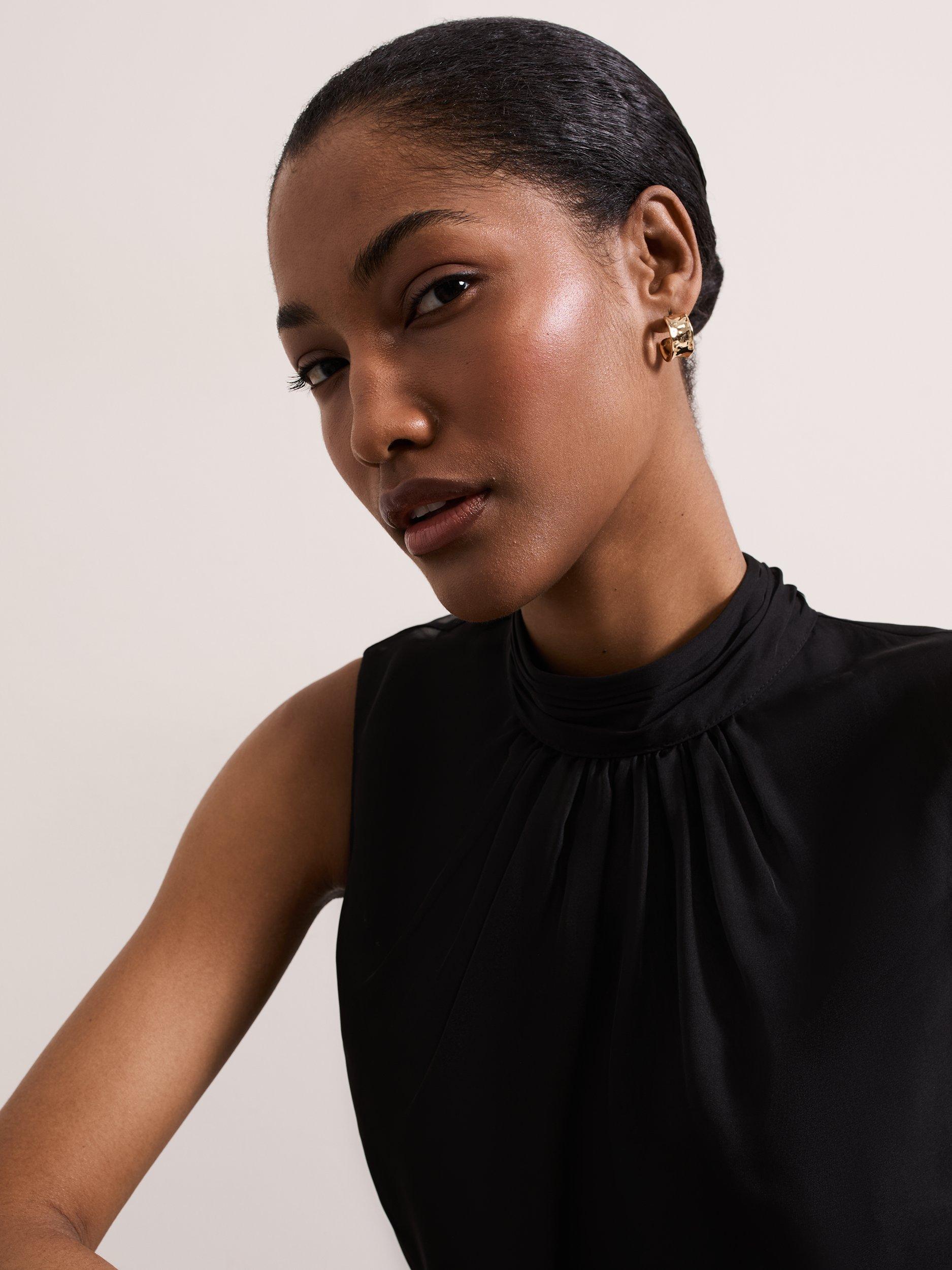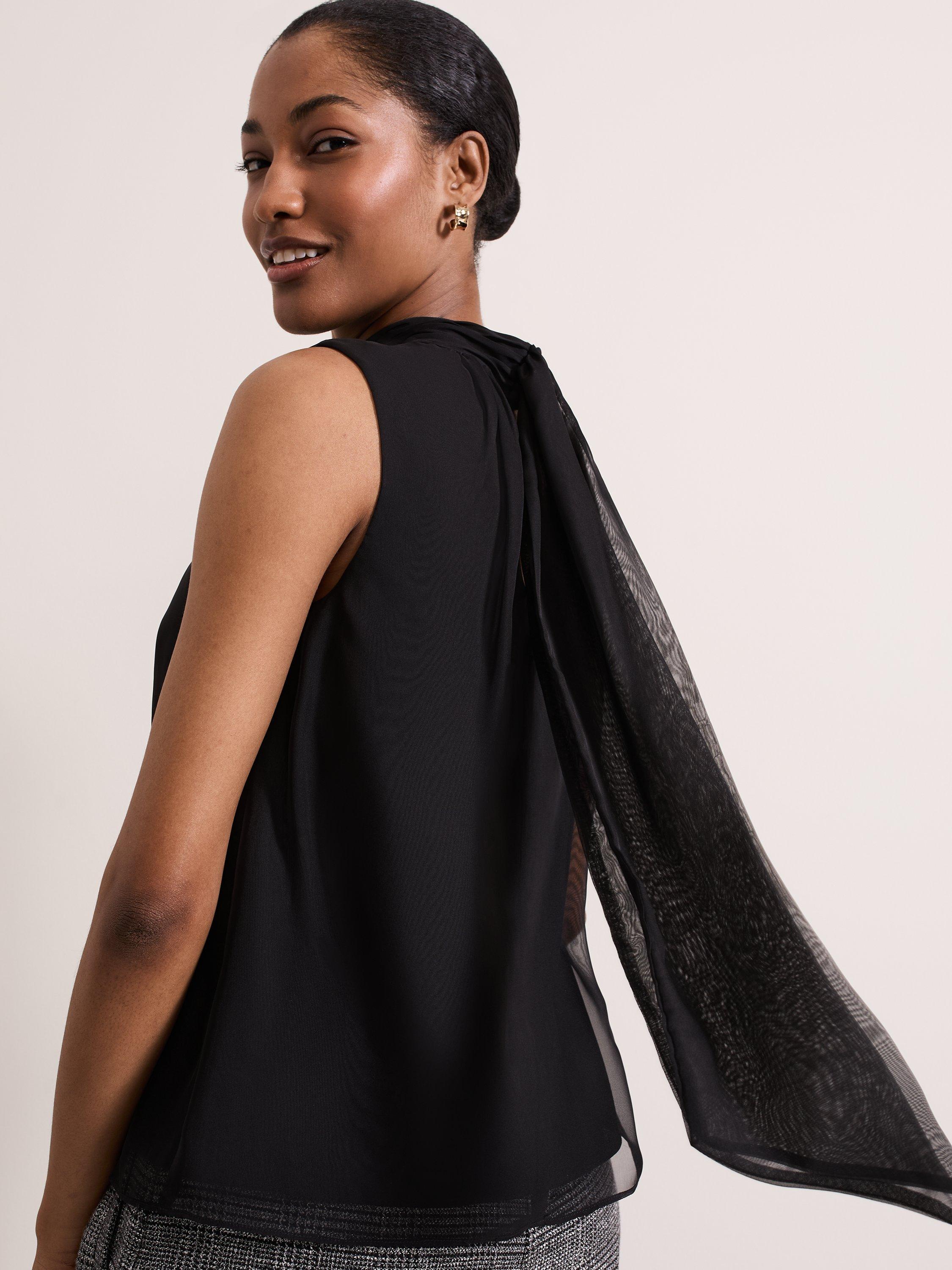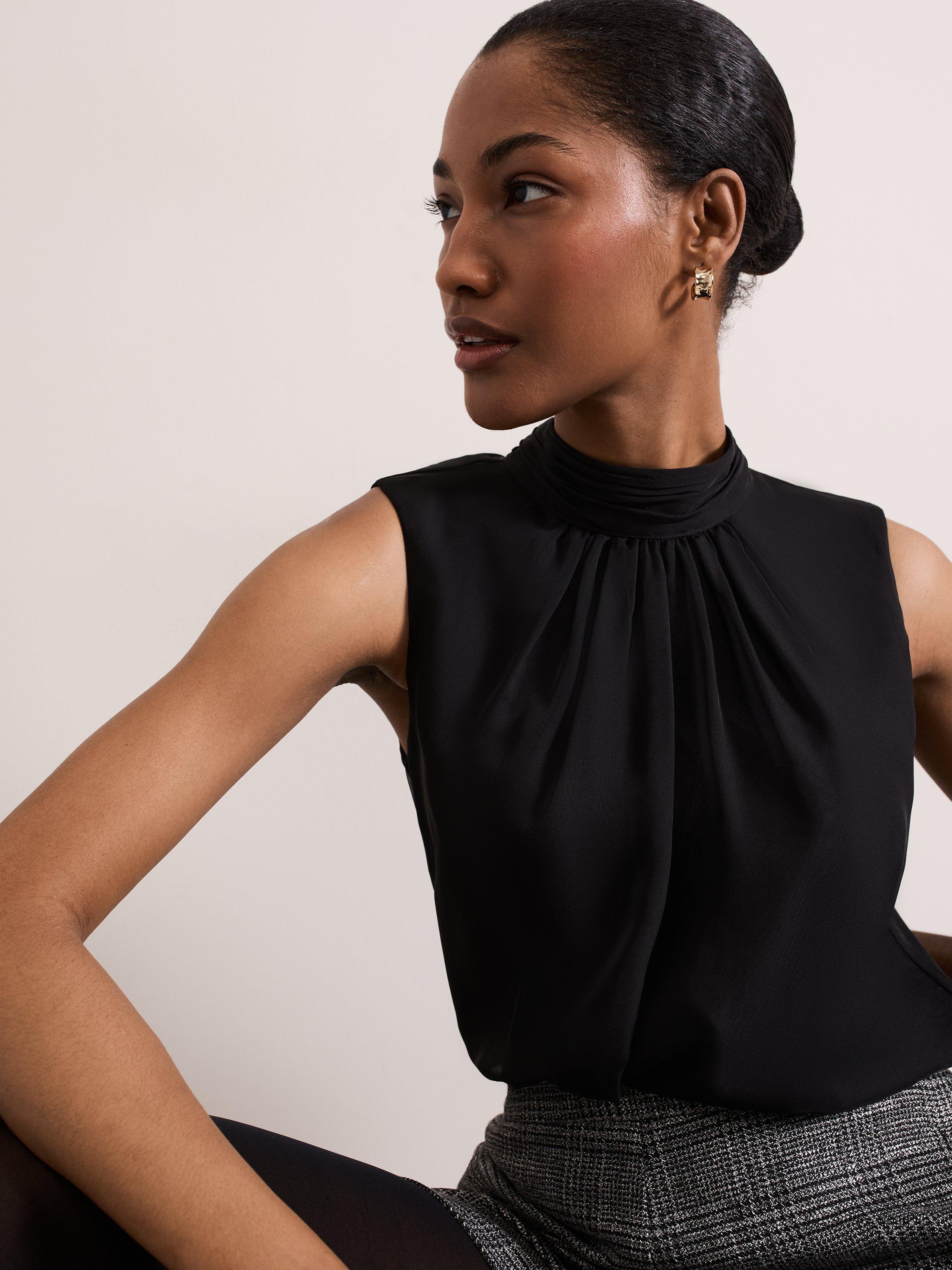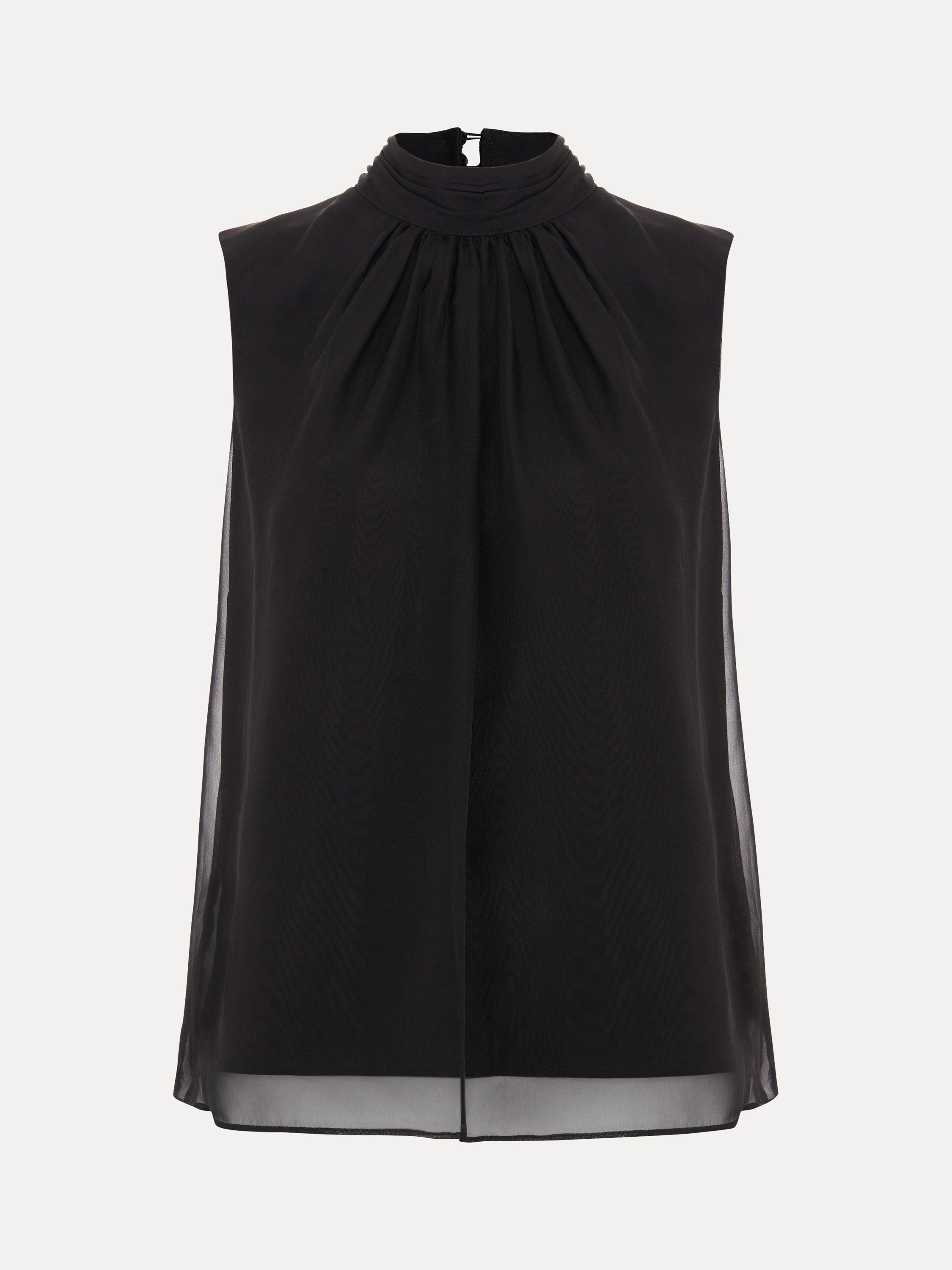 Cut to a sleeveless silhouette our Nella top features a high round neck and delicate front pleats. Scarf detailing at the neckline creates an elegant evening style to pair with any of your favourite separates.