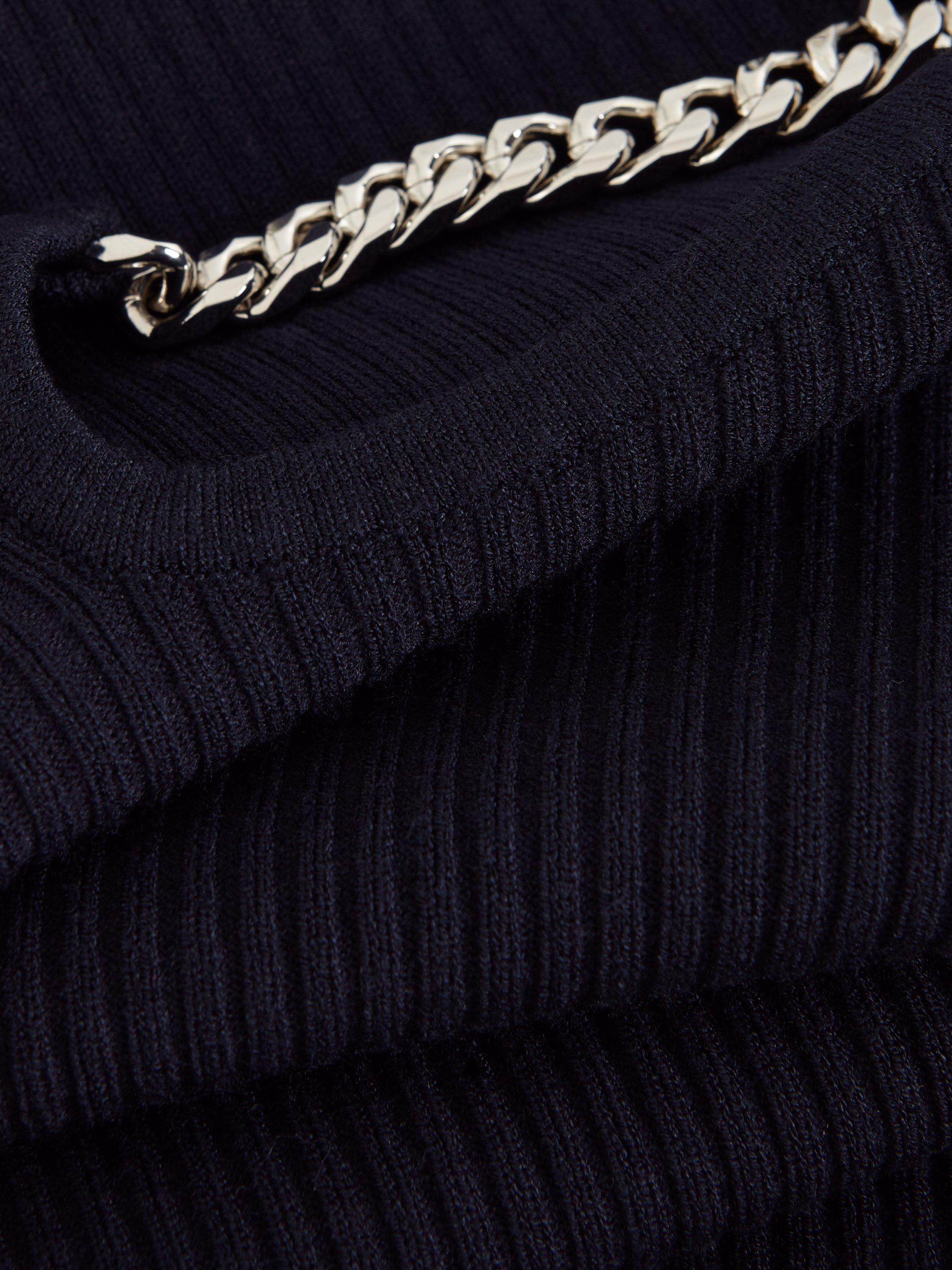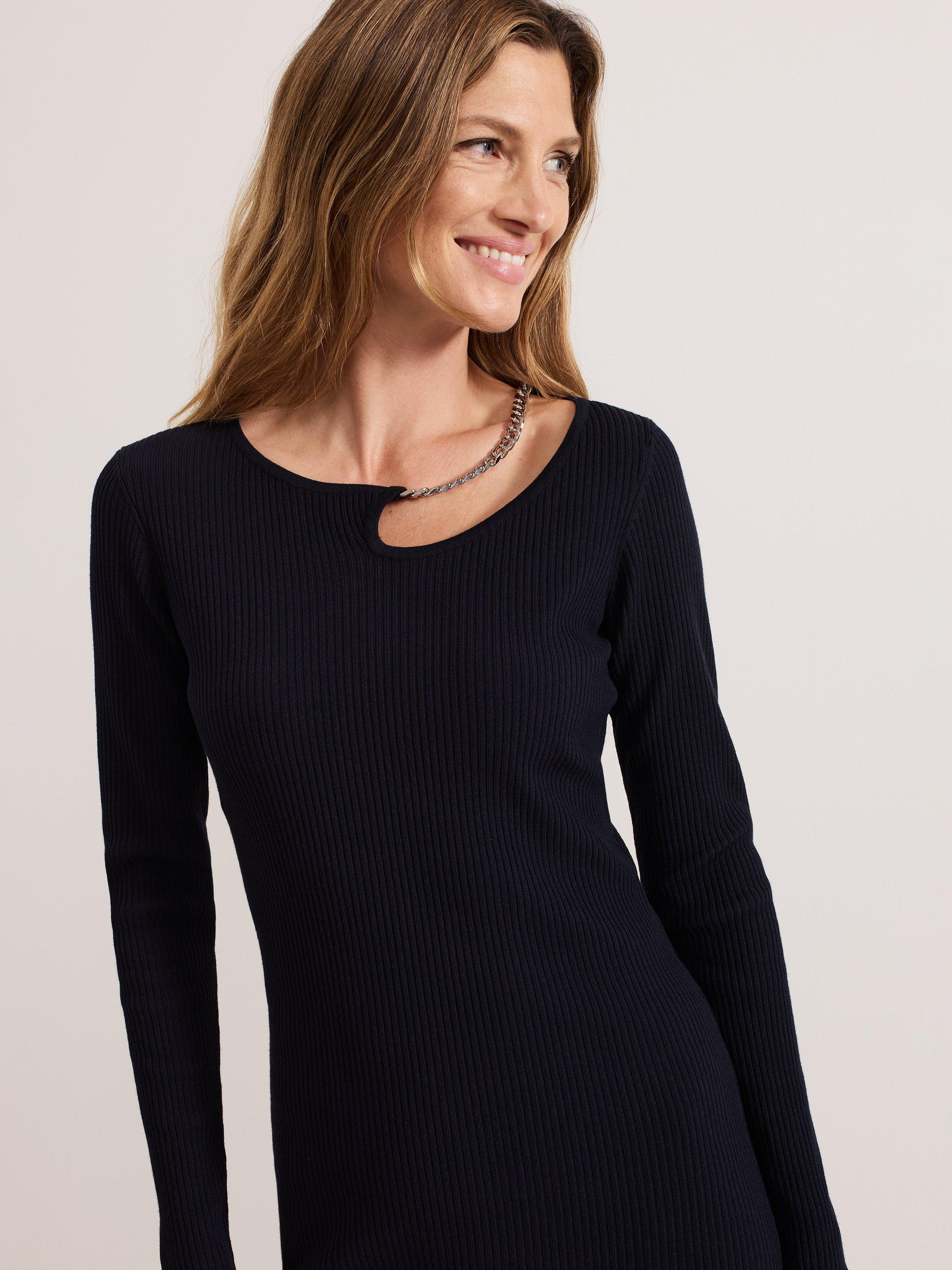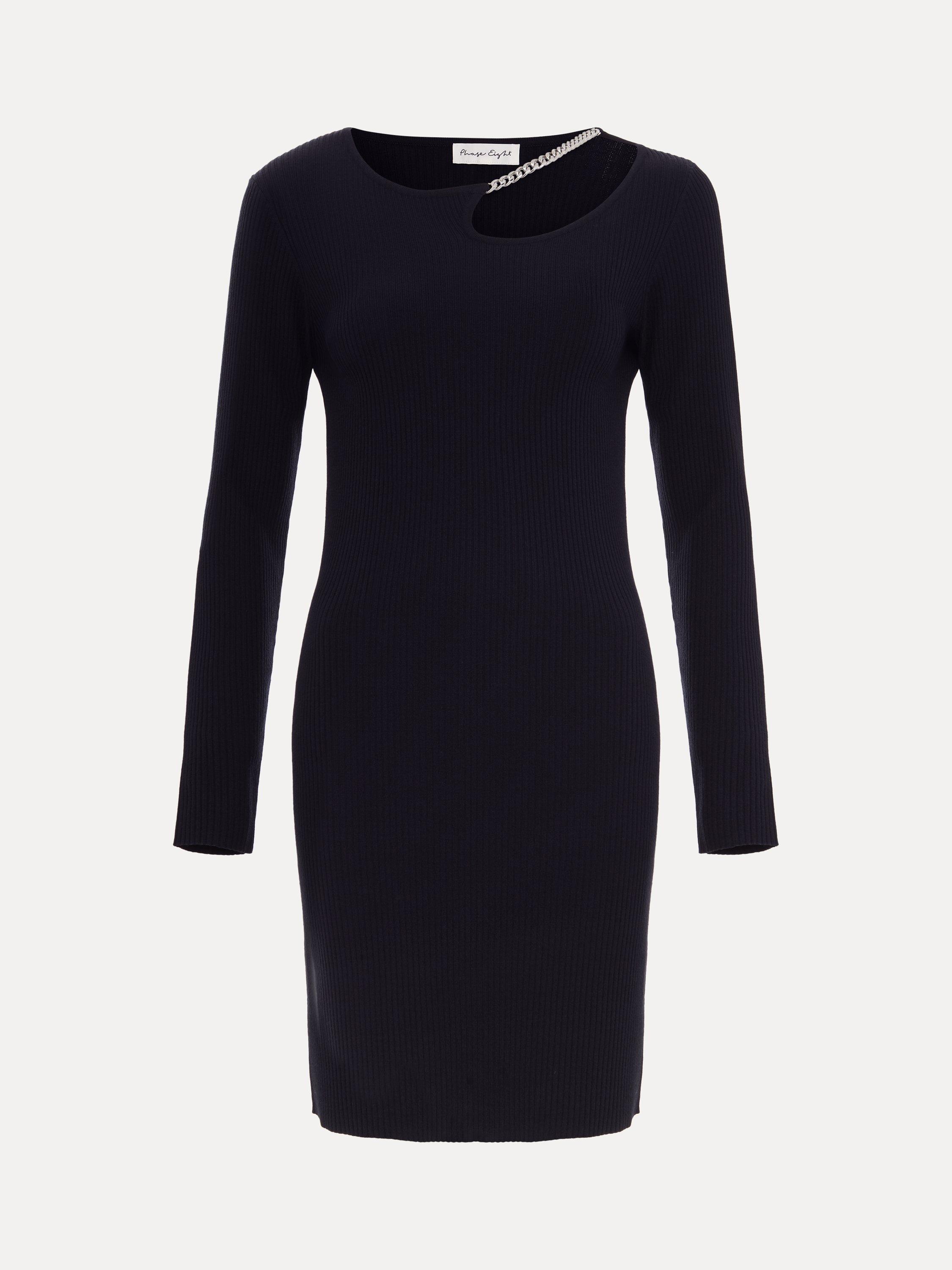 Meet your new favourite mini dress that's perfect to dress up and down. Designed in a deep shade, our Nia dress features a statement silver chain detail at the neckline with a small cutout, long sleeves and ribbed detailing throughout.