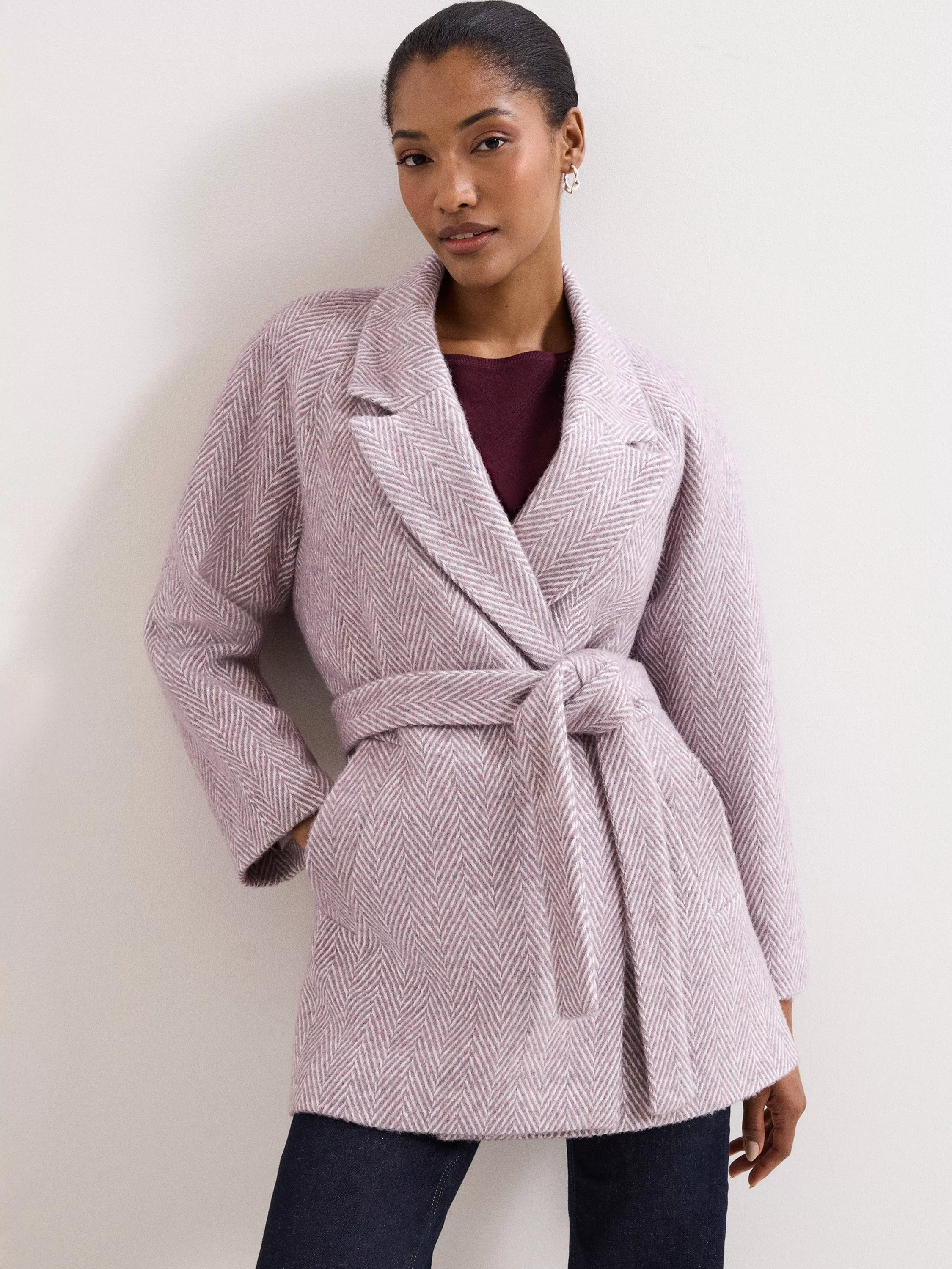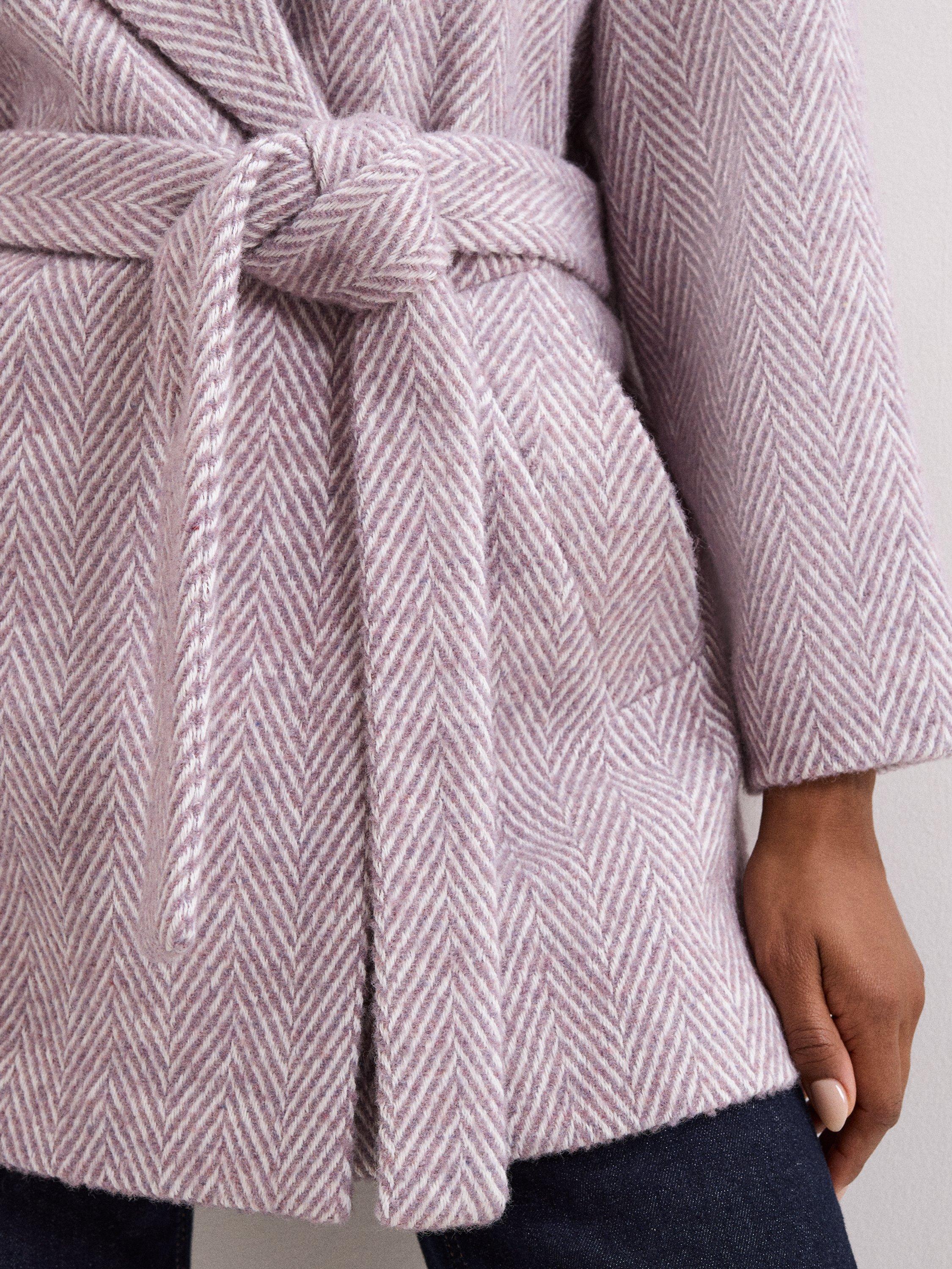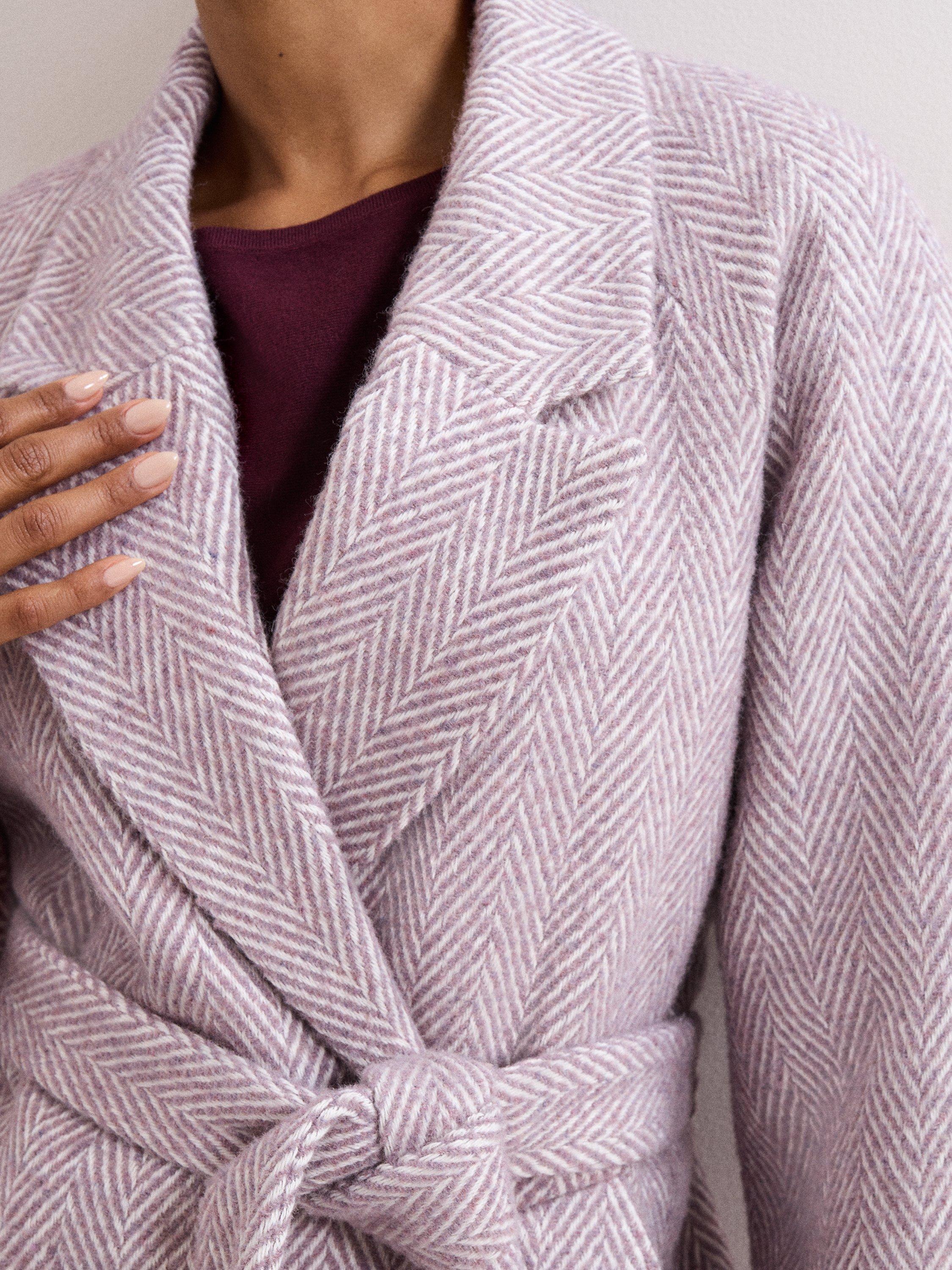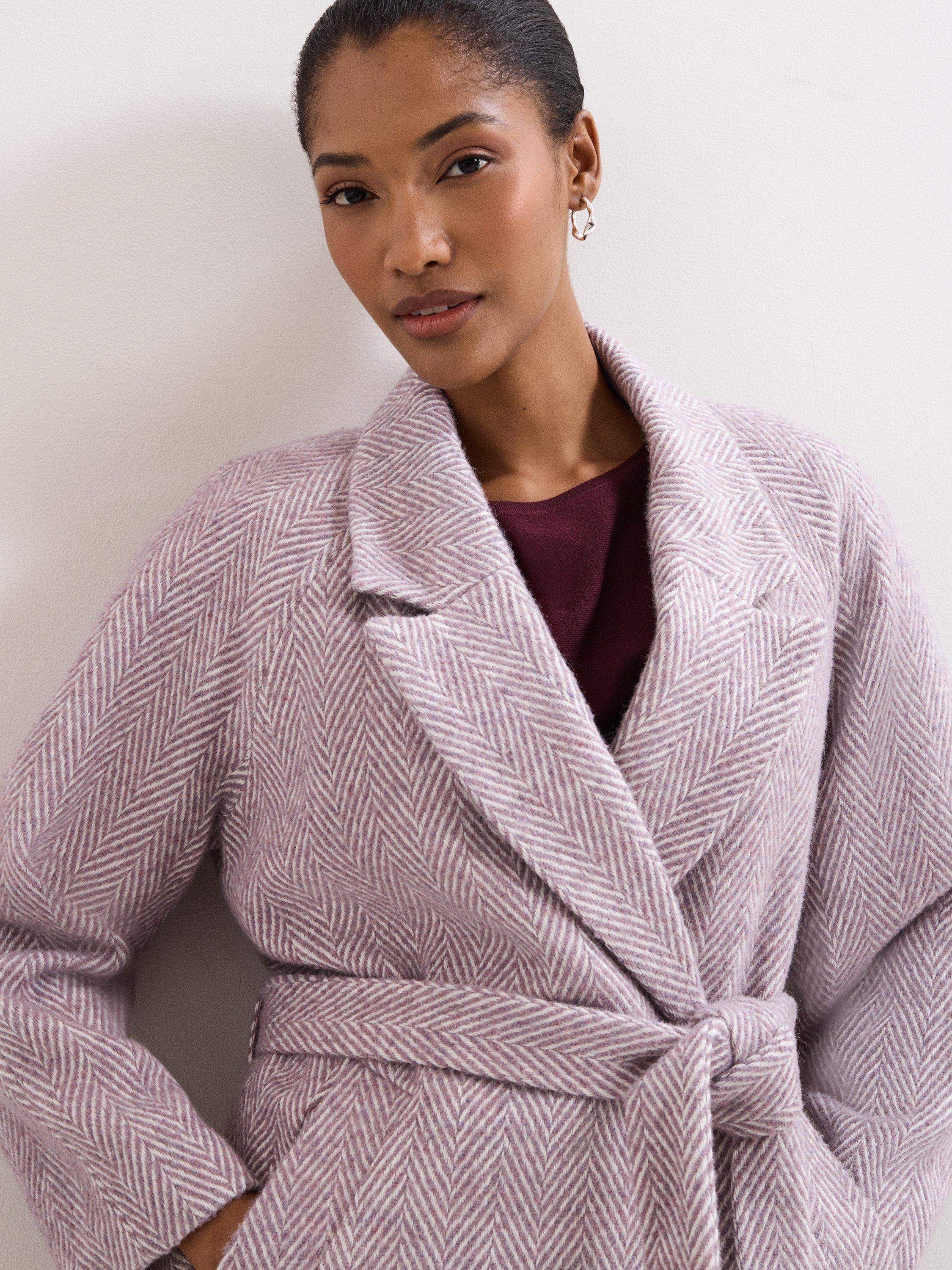 This wrap overcoat features a standout herringbone design, a soft wool blend, and a tie fastening. The classic V-neck and long sleeves ensure you feel comfortable and confident when layering up for busy days or relaxed evenings.