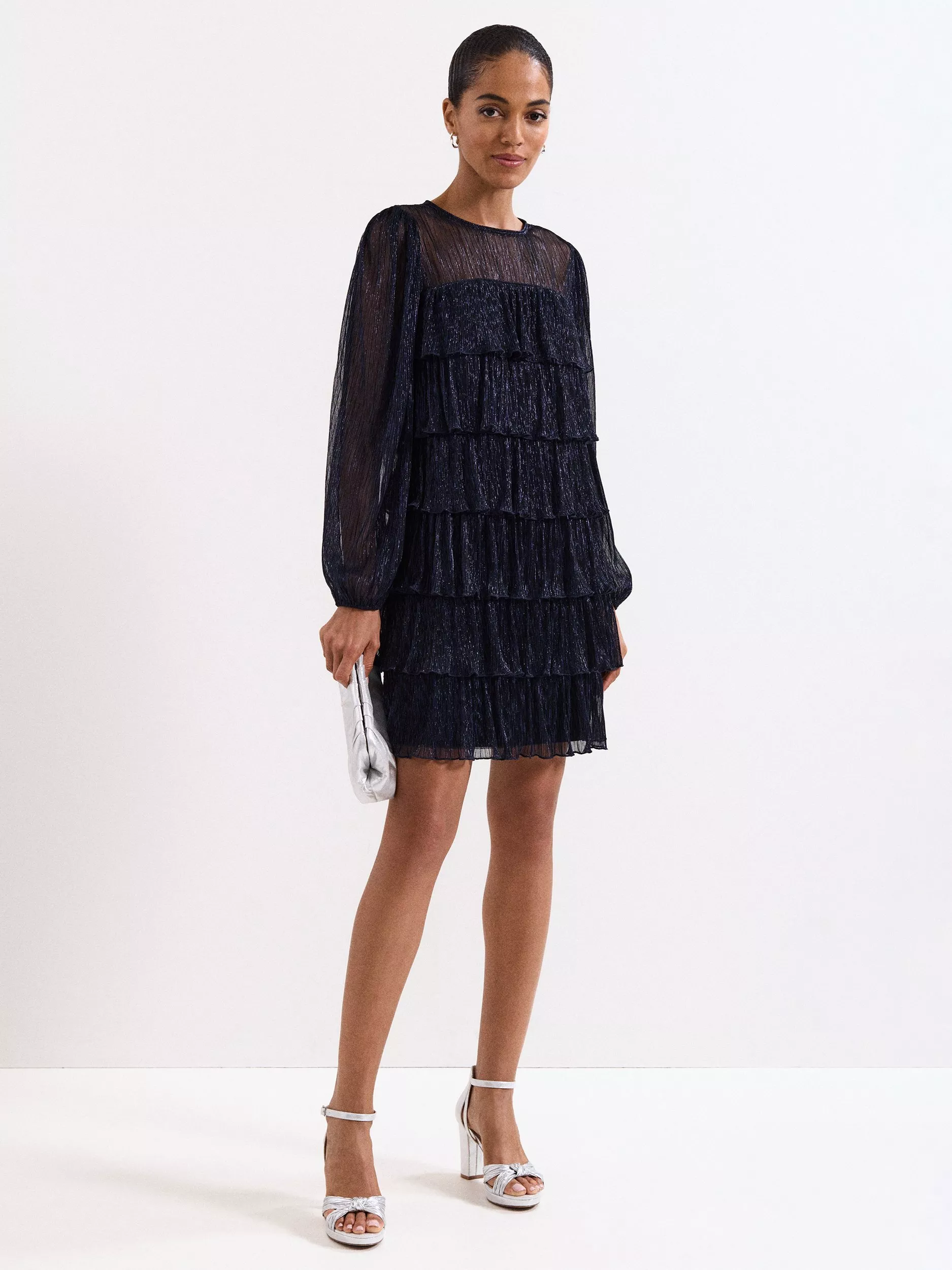 The perfect cocktail dress, this thigh-grazing tiered dress from Phase Eight features a round neck, semi-sheer full-length blouson sleeves and an all-over shimmer.