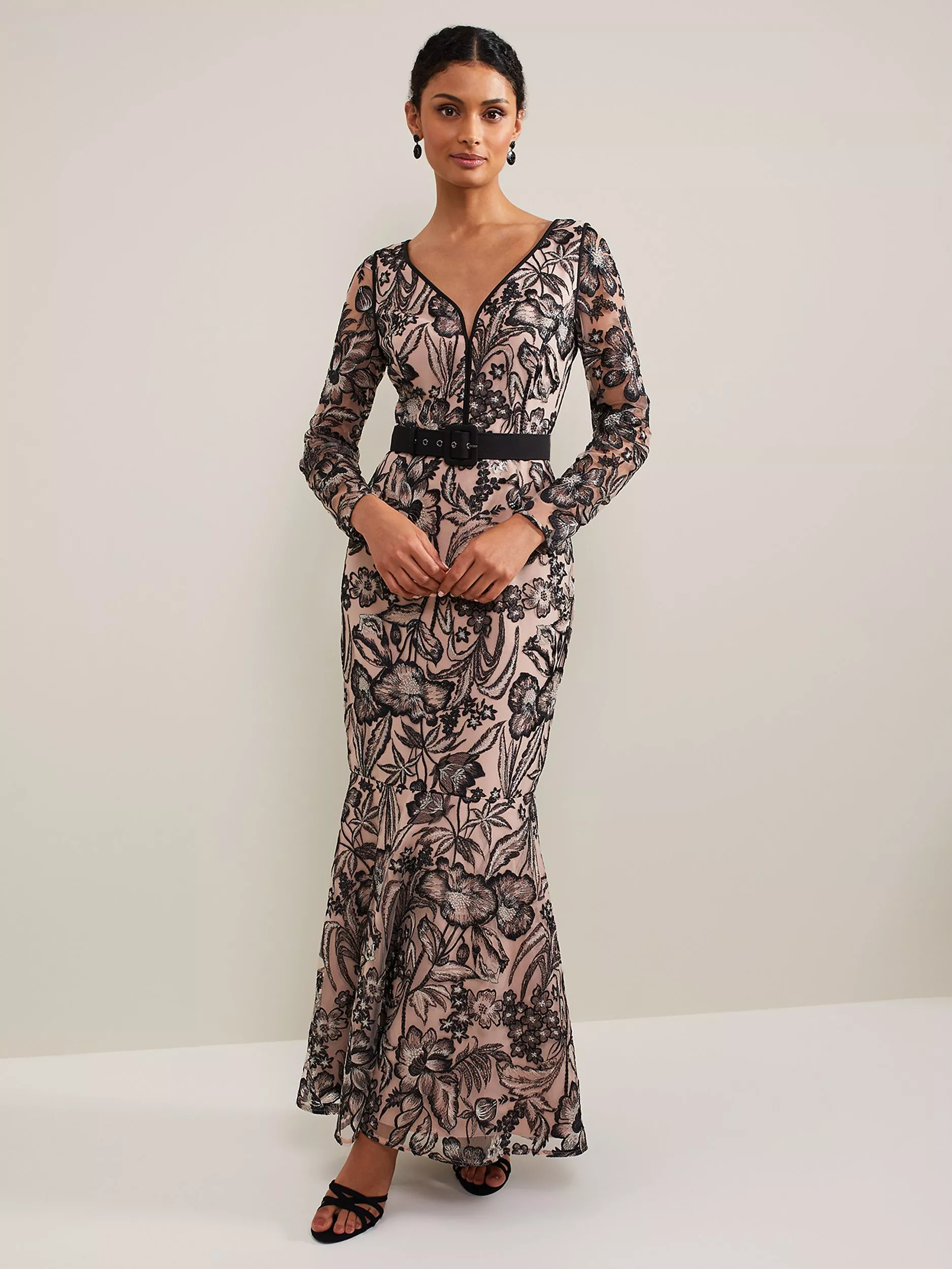 With an eye-catching mermaid hem, this floor-length dress from Phase Eight is designed to wow. Featuring a v-neckline, long sleeves and a matching belt, it is doused in pretty embroidered detail. Simply style with matching black accessories for a high-impact look.