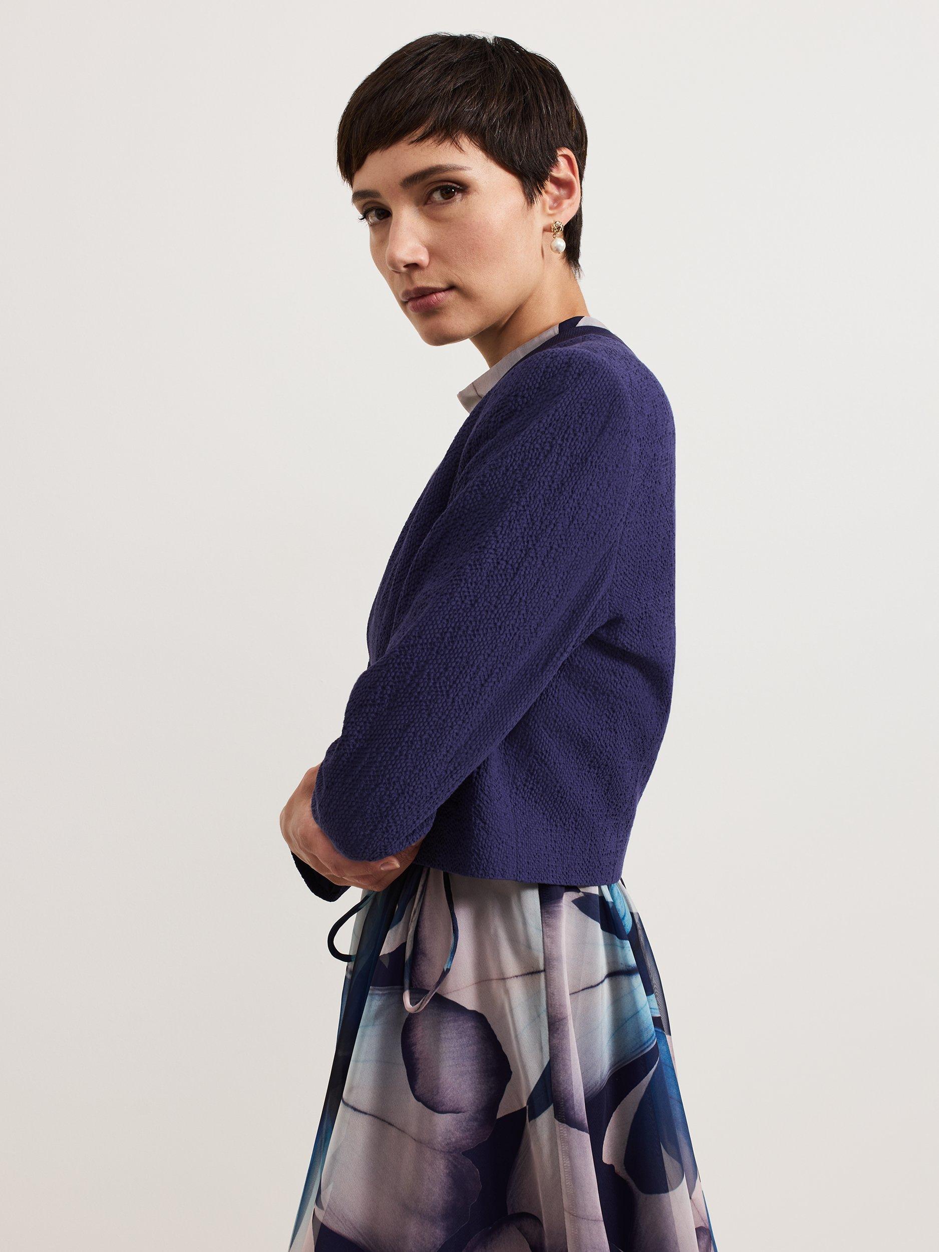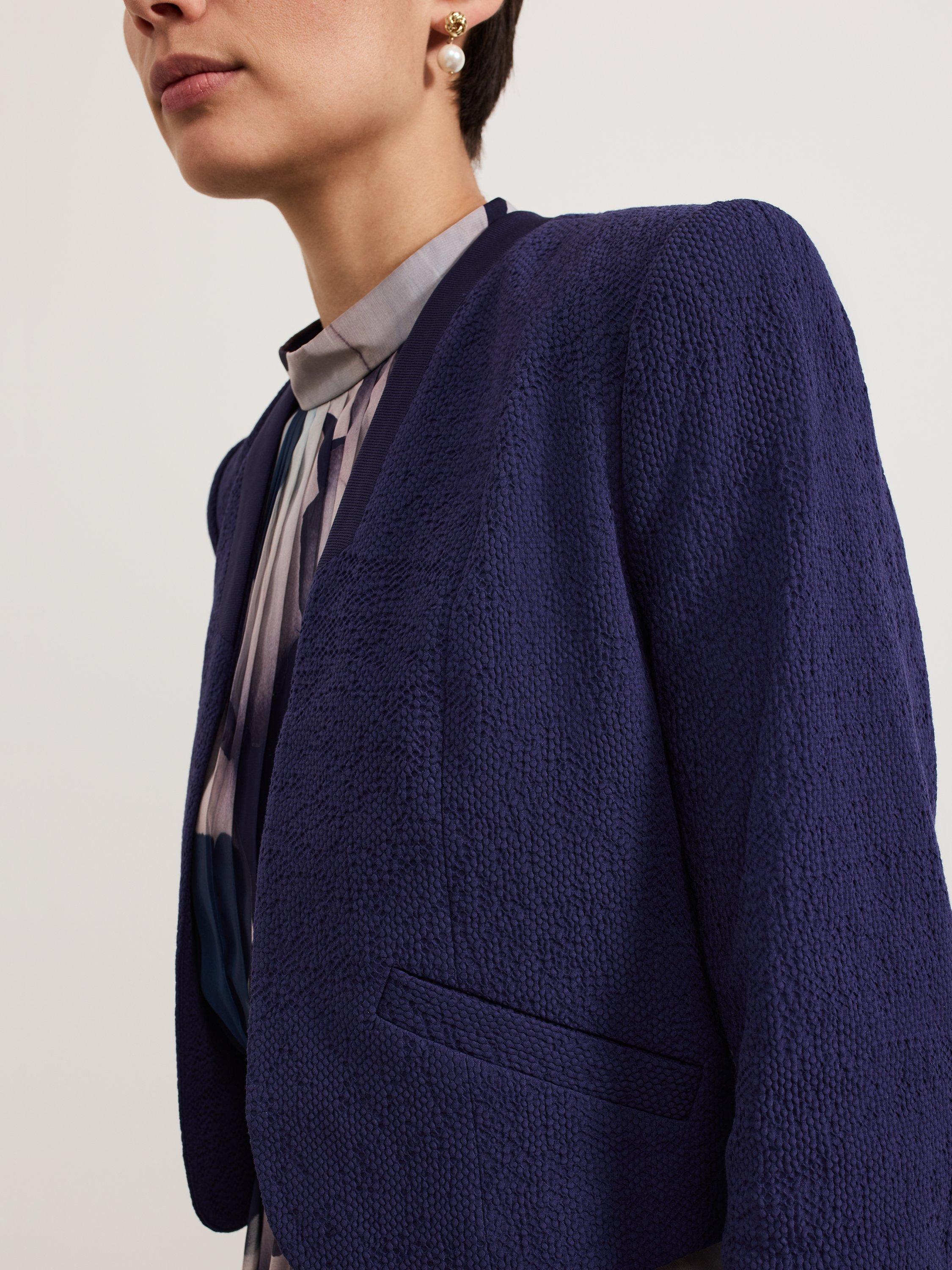 The Olivia jacket is a relaxed yet refined style. This jacket features a subtle texture for a modern edge. The cropped silhouette makes it the perfect finishing touch for your event styles for a sophisticated look.