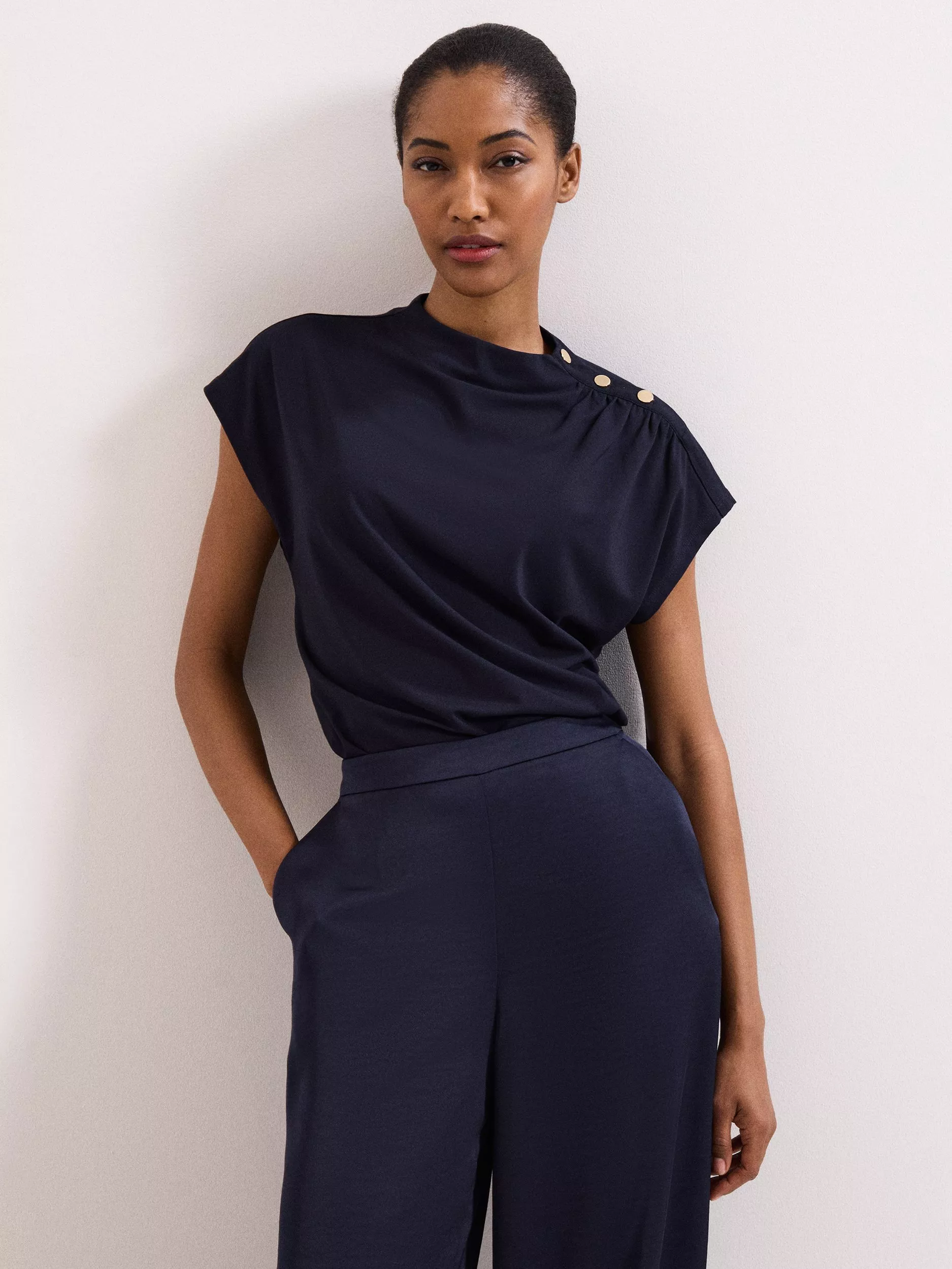 A jersey top from Phase Eight. With a round neck and cap sleeves, the plain colour means it goes with everything. Transition with ease from daytime to after-dark.